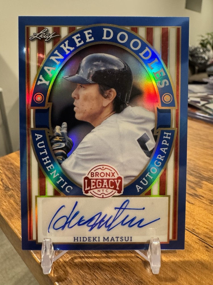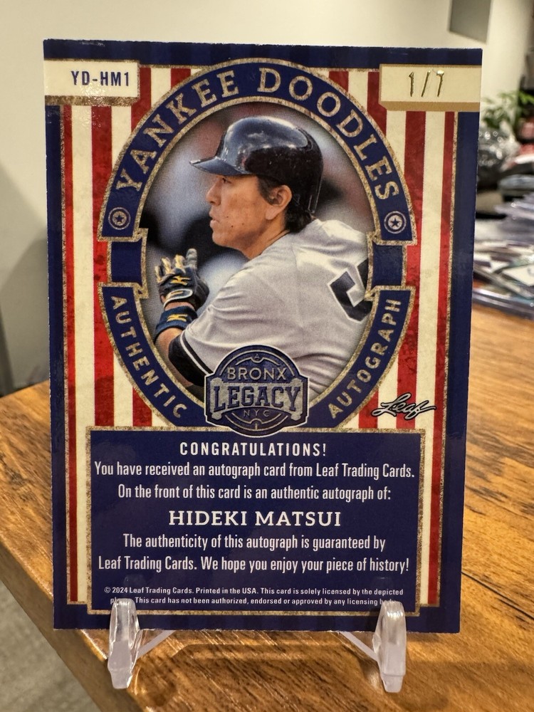 This 2024 Leaf Bronx Legacy trading card features an autographed refractor design with a holographic effect. The card is part of the limited edition collector's set and is serial numbered out of 7. The front of the card showcases Matsui in his New York Yankees and Japan team uniforms, with the words "Godzilla" and "Yankee Doodles" printed on the card. The card is a must-have for any baseball fan, especially those who collect sports trading cards. The card is manufactured by Leaf and is part of the Major League Baseball (MLB) league. The card is a great addition to any collection and is sure to impress with its unique design and limited availability.