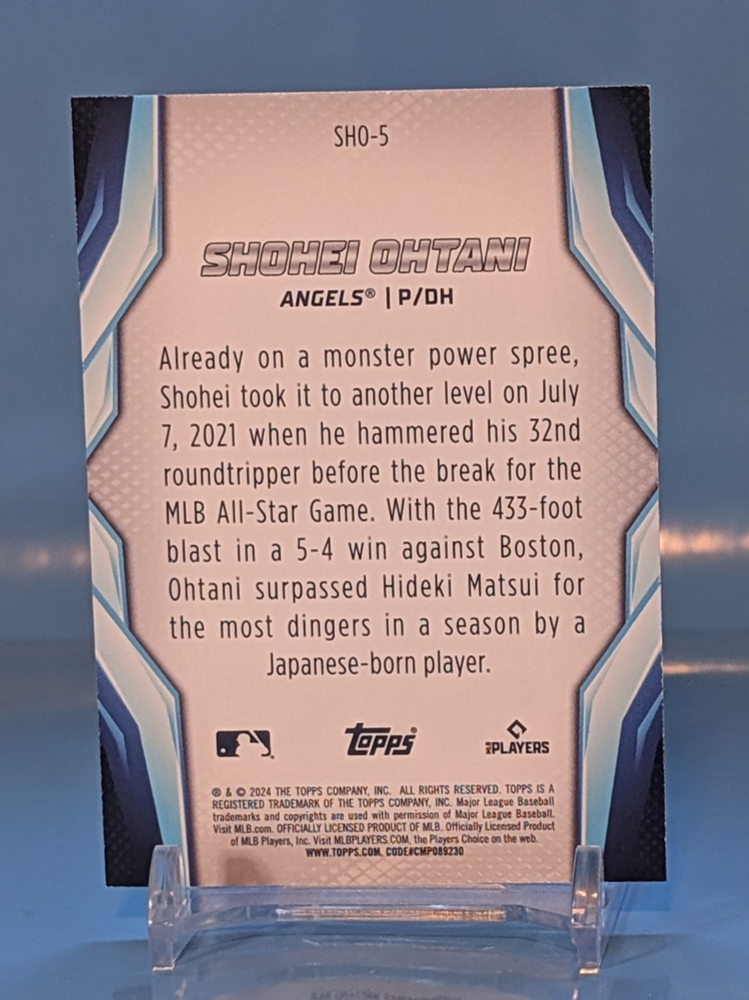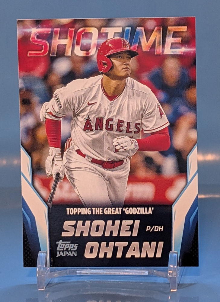 This listing is for a 2024 Topps Japan Edition SHOWTIME TOPPING THE GREAT 'GODZILLA' trading card featuring baseball legend Shohei Ohtani. This original card is part of the exclusive insert set and is manufactured by Topps in the United States. The card showcases Ohtani in his Angels uniform and is a sought-after collectible for fans of MLB baseball. The English-language card is made of card stock and is a valuable addition to any sports trading card collection. There are more listings live now for Rookie and Star cards in The Breaking Digest Store Save The Breaking Digest to your Save Seller page to see when new cards drop!