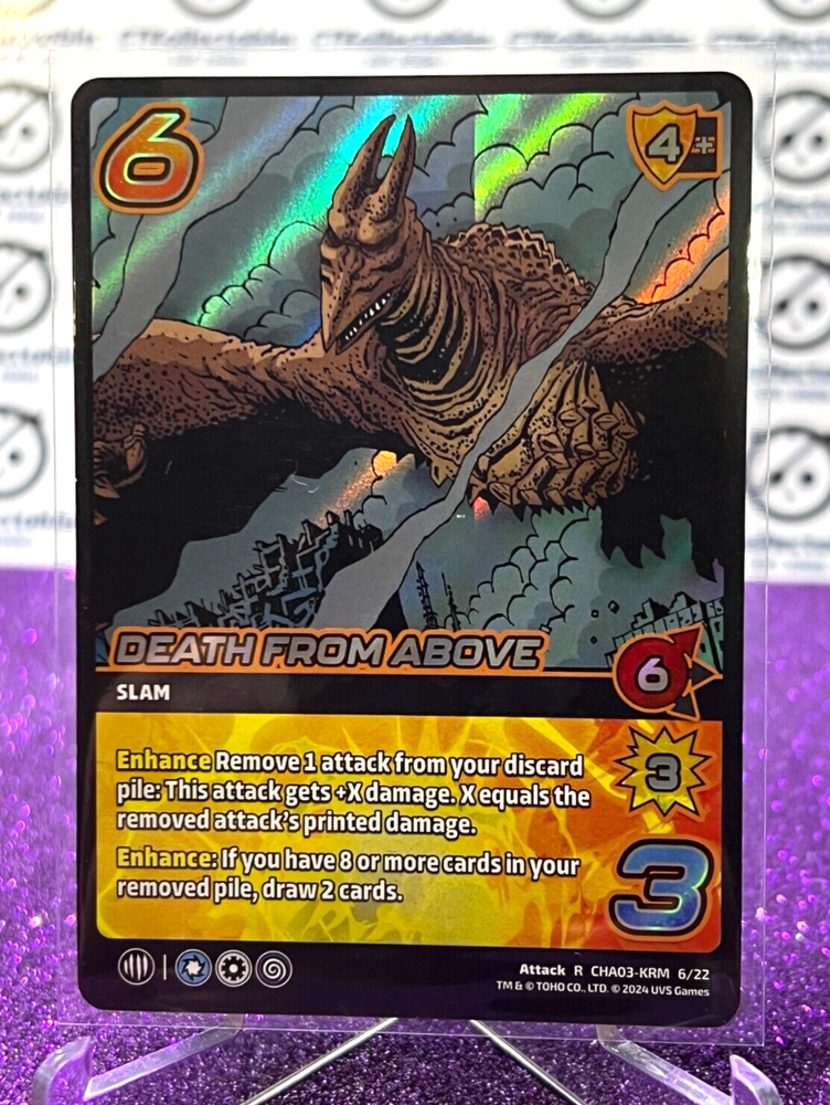 2024 UNIVERSUS GODZILLA DEATH FROM ABOVE # ATTACK R CHA03-KRM 6/22 RARE FOIL UVS GAMES TRADING CARD THIS CARD IS IN EXCELLENT CONDITION PACKAGED SAFELY WITH TOP LOADER PLEASE PREFER TO PHOTO You are purchasing the item within the title & Photo, cards are all in straight out of the pack excellent/mint condition (unless stated otherwise) all cards are sent in penny sleeve, toploader We Also have Plenty of Cards and other Kollectables listed on our online website! Check it out!