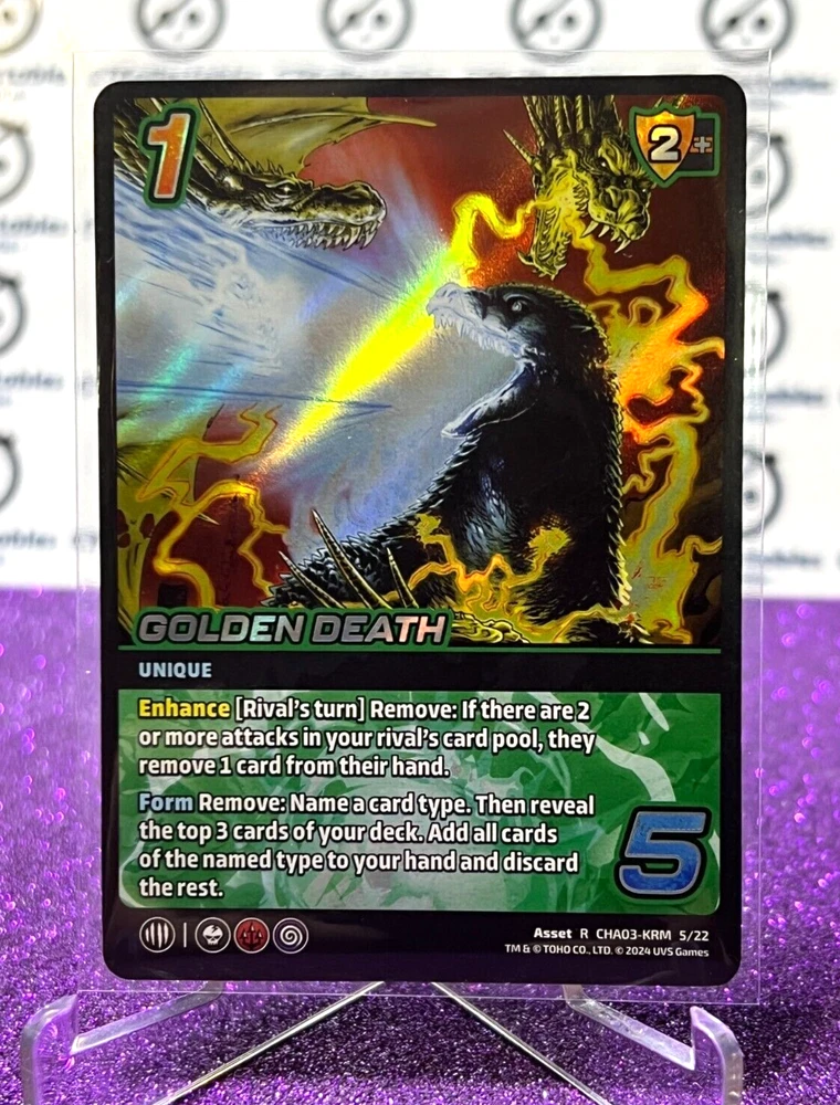 2024 UNIVERSUS GODZILLA GOLDEN DEATH # ASSET R CHA03-KRM 5/22 FOIL RARE UVS GAMES TRADING CARD THIS CARD IS IN EXCELLENT CONDITION PACKAGED SAFELY WITH TOP LOADER PLEASE PREFER TO PHOTO You are purchasing the item within the title & Photo, cards are all in straight out of the pack excellent/mint condition (unless stated otherwise) all cards are sent in penny sleeve, toploader We Also have Plenty of Cards and other Kollectables listed on our online website! Check it out!