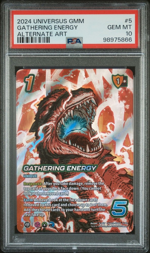 Dive into the epic universe of UniVersus with the 2024 Godzilla & Mothra Series 5 Gathering Energy ALT ART card. This collectible piece showcases the majestic clash between the iconic monsters, full of vibrant artwork that brings the conflict to life. With its detailed design, this card is a must-have for enthusiasts and collectors alike. Proudly manufactured by Universus and graded a perfect 10 by the Professional Sports Authenticator (PSA), this card exemplifies quality and authenticity. The PSA 10 grading ensures that you are receiving a card of the highest caliber, free from any imperfections. Add this stunning piece of artwork to your collection and own a slice of the UniVersus saga.