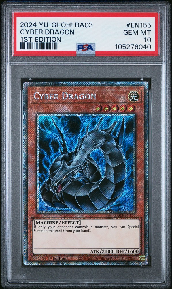 2024 YU-GI-OH! RA03-QUARTER CENTURY BONANZA 1ST EDITION #EN155 CYBER DRAGON PSA 10 2024 YU-GI-OH! RA03-QUARTER CENTURY BONANZA 1ST EDITION #EN155 CYBER DRAGON PSA 10 Purchase Info Thank you for your interest in this item consigned with PSA! By purchasing or making an offer on this item, you acknowledge and agree to the following terms: All sales are final. Returns not accepted. Payment must be made upon purchase of the item. All items are sold "as is" and without warranty of Collectors Universe, Inc. (d/b/a PSA), and ANY AND ALL IMPLIED WARRANTIES ARE DISCLAIMED AND EXCLUDED. Sales tax may apply depending on shipping address. PSA does not guarantee that another third-party grading company's authentication or certification of an item as genuine is correct or accurate. Neither a difference of opinion between third-party grading companies about authenticity, nor a company's subsequent reversal of its earlier authentication or certification of an item, will be a basis for rescinding a sale. Any dispute with another third-party grading company relating to the authenticity of an item must be resolved directly with that other company. Collectors' maximum liability in the event of loss or damage to an item during shipping will be the lesser of (a) the price paid for the item and (b) the change in fair market value of the item. You release Collectors from all other liability including for any claims of punitive damages, emotional distress, consequential damages, lost profits, or lost interest, except as prohibited by law. Shipping Purchased Items will be shipped directly from PSA Vault. You stay hands-free. PSA Vault When you purchase this item, you can save on sales tax and selling fees by keeping it in the PSA Vault, official Vault of eBay. Items already in PSA Vault and will be sent to PSA Vault will have no shipping charge Storage of any items with the PSA Vault will be subject to the PSA Vault Terms of Service. Consignment PSA has competitive rates on the world's largest collectibles marketplace with the option to list from the PSA Vault or immediately after PSA authentication and grading. Sale Price Under $100 $100 - $499 $500 - $999 $1,000 - $2,499 $2,500 - $4,999 $5,000+ Seller Fee 16% 14% 13% 10% 9% 7% Sellers pay a single fee as reflected above; no additional eBay fees are incurred. There is a $5 minimum fee on sold items.