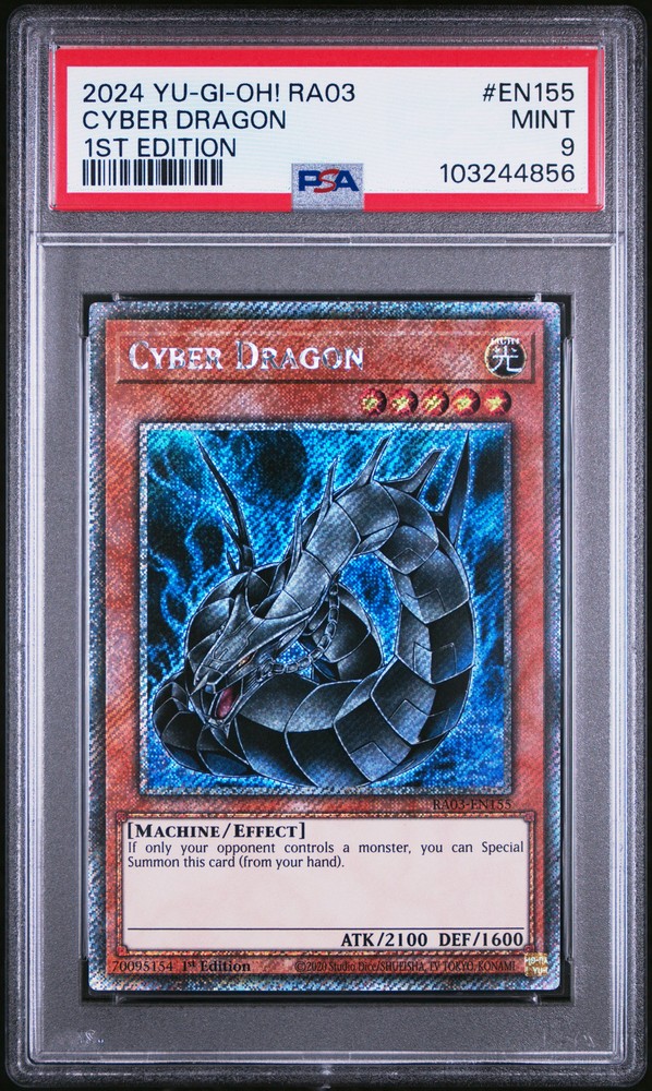 2024 YU-GI-OH! RA03-QUARTER CENTURY BONANZA 1ST EDITION #EN155 CYBER DRAGON PSA 9 2024 YU-GI-OH! RA03-QUARTER CENTURY BONANZA 1ST EDITION #EN155 CYBER DRAGON PSA 9 Purchase Info Thank you for your interest in this item consigned with PSA! By purchasing or making an offer on this item, you acknowledge and agree to the following terms: All sales are final. Returns not accepted. Payment must be made upon purchase of the item. All items are sold "as is" and without warranty of Collectors Universe, Inc. (d/b/a PSA), and ANY AND ALL IMPLIED WARRANTIES ARE DISCLAIMED AND EXCLUDED. Sales tax may apply depending on shipping address. PSA does not guarantee that another third-party grading company's authentication or certification of an item as genuine is correct or accurate. Neither a difference of opinion between third-party grading companies about authenticity, nor a company's subsequent reversal of its earlier authentication or certification of an item, will be a basis for rescinding a sale. Any dispute with another third-party grading company relating to the authenticity of an item must be resolved directly with that other company. Collectors' maximum liability in the event of loss or damage to an item during shipping will be the lesser of (a) the price paid for the item and (b) the change in fair market value of the item. You release Collectors from all other liability including for any claims of punitive damages, emotional distress, consequential damages, lost profits, or lost interest, except as prohibited by law. Shipping Purchased Items will be shipped directly from PSA Vault. You stay hands-free. PSA Vault When you purchase this item, you can save on sales tax and selling fees by keeping it in the PSA Vault, official Vault of eBay. Items already in PSA Vault and will be sent to PSA Vault will have no shipping charge Storage of any items with the PSA Vault will be subject to the PSA Vault Terms of Service. Consignment PSA has competitive rates on the world's largest collectibles marketplace with the option to list from the PSA Vault or immediately after PSA authentication and grading. Sale Price Under $100 $100 - $499 $500 - $999 $1,000 - $2,499 $2,500 - $4,999 $5,000+ Seller Fee 16% 14% 13% 10% 9% 7% Sellers pay a single fee as reflected above; no additional eBay fees are incurred. There is a $5 minimum fee on sold items.