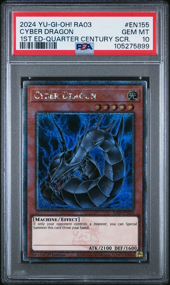 2024 YU-GI-OH! RA03-QUARTER CENTURY BONANZA 1ST EDITION-QUARTER CENTURY SECRET RARE #EN155 CYBER DRAGON PSA 10 2024 YU-GI-OH! RA03-QUARTER CENTURY BONANZA 1ST EDITION-QUARTER CENTURY SECRET RARE #EN155 CYBER DRAGON PSA 10 Purchase Info Thank you for your interest in this item consigned with PSA! By purchasing or making an offer on this item, you acknowledge and agree to the following terms: All sales are final. Returns not accepted. Payment must be made upon purchase of the item. All items are sold "as is" and without warranty of Collectors Universe, Inc. (d/b/a PSA), and ANY AND ALL IMPLIED WARRANTIES ARE DISCLAIMED AND EXCLUDED. Sales tax may apply depending on shipping address. PSA does not guarantee that another third-party grading company's authentication or certification of an item as genuine is correct or accurate. Neither a difference of opinion between third-party grading companies about authenticity, nor a company's subsequent reversal of its earlier authentication or certification of an item, will be a basis for rescinding a sale. Any dispute with another third-party grading company relating to the authenticity of an item must be resolved directly with that other company. Collectors' maximum liability in the event of loss or damage to an item during shipping will be the lesser of (a) the price paid for the item and (b) the change in fair market value of the item. You release Collectors from all other liability including for any claims of punitive damages, emotional distress, consequential damages, lost profits, or lost interest, except as prohibited by law. Shipping Purchased Items will be shipped directly from PSA Vault. You stay hands-free. PSA Vault When you purchase this item, you can save on sales tax and selling fees by keeping it in the PSA Vault, official Vault of eBay. Items already in PSA Vault and will be sent to PSA Vault will have no shipping charge Storage of any items with the PSA Vault will be subject to the PSA Vault Terms of Service. Consignment PSA has competitive rates on the world's largest collectibles marketplace with the option to list from the PSA Vault or immediately after PSA authentication and grading. Sale Price Under $100 $100 - $499 $500 - $999 $1,000 - $2,499 $2,500 - $4,999 $5,000+ Seller Fee 16% 14% 13% 10% 9% 7% Sellers pay a single fee as reflected above; no additional eBay fees are incurred. There is a $5 minimum fee on sold items.