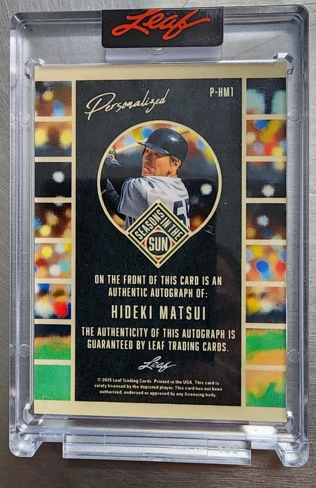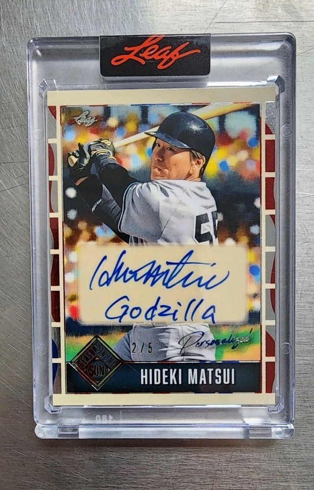 Capture a piece of baseball history with the 2025 Leaf Seasons In The Sun Hideki Matsui Personalized Godzilla card, a limited edition collectible limited to just five in existence. This card, numbered P-HM1, features the renowned New York Yankees player and is a must-have for fans and collectors alike. It boasts a unique serial number, ensuring its exclusivity and making it a standout addition to any collection. Crafted in the United States and presented in pristine card stock, this sports trading card is not only a tribute to Matsui's storied career but also a testament to the legacy of the New York Yankees. Autographed by Hideki Matsui himself, it embodies the passion and excitement of Major League Baseball, and is a valuable keepsake for enthusiasts of the sport.