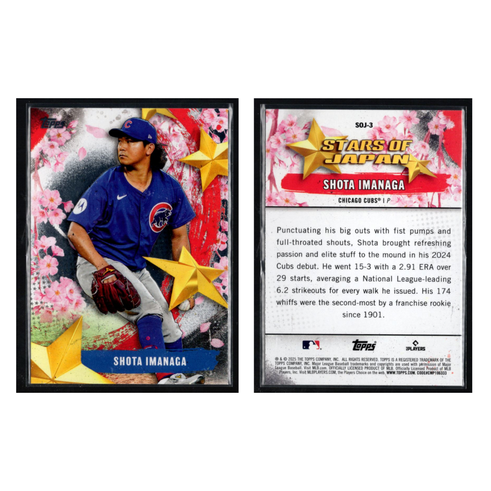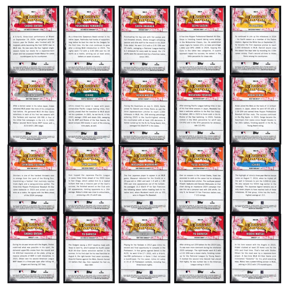 You will receive the exact cards in the scans. The scans are not stock photos—they are actual scans of the cards you will receive. Please send a message if you have any questions or read the full description. 2025 Topps Tokyo Series exclusive Star of Japan Complete set Ohtani Yamamoto You will receive the exact cards in the scans. The scans are not stock photos—they are actual scans of the cards you will receive. Please send a message if you have any questions. Overall these cards are in near-mint condition or better. Equivalent to cards fresh from the pack. Learn more about eBay's card condition guidelines here: https://pages.ebay.com/cardconditions/ Please view the scans and send a message if you have any questions about condition. Shipping Details Free shipping Return Policy No return Card are sold as is List of Cards Included This list was generated by AI attempting to identify the cards from the scans and it may contain errors. For some types of cards/sets the AI can be very accurate and for others it can be very bad. If you were searching for a card on this list please confirm that it is in the lot by checking the images because the images are of the exact cards you will receive. If you have any questions, please send a message. 2025 Topps Tokyo Series exclusive #SOJ-1 Shohei Ohtani Basketball Card 2025 Topps Tokyo Series exclusive #SOJ-2 Yoshinobu Yamamoto Basketball Card 2025 Topps Tokyo Series exclusive #SOJ-3 Shota Imanaga Basketball Card 2025 Topps Tokyo Series exclusive #SOJ-4 Seiya Suzuki Basketball Card 2025 Topps Tokyo Series exclusive #SOJ-5 Yu Darvish Basketball Card 2025 Topps Tokyo Series exclusive #SOJ-6 Shohei Ohtani Basketball Card 2025 Topps Tokyo Series exclusive #SOJ-7 Ichiro Basketball Card 2025 Topps Tokyo Series exclusive #SOJ-8 Kenta Maeda Basketball Card 2025 Topps Tokyo Series exclusive #SOJ-9 Masataka Yoshida Basketball Card 2025 Topps Tokyo Series exclusive #SOJ-10 Kodai Senga Basketball Card 2025 Topps Tokyo Series exclusive #SOJ-11 Shinttaro Fujinami Basketball Card 2025 Topps Tokyo Series exclusive #SOJ-12 Yuki Matsui Basketball Card 2025 Topps Tokyo Series exclusive #SOJ-13 Masanori Murakami Basketball Card 2025 Topps Tokyo Series exclusive #SOJ-14 Yusei Kikuchi Basketball Card 2025 Topps Tokyo Series exclusive #SOJ-15 Ichiro Basketball Card 2025 Topps Tokyo Series exclusive #SOJ-16 Shohei Ohtani Basketball Card 2025 Topps Tokyo Series exclusive #SOJ-17 Yu Darvish Basketball Card 2025 Topps Tokyo Series exclusive #SOJ-18 Ichiro Basketball Card 2025 Topps Tokyo Series exclusive #SOJ-19 Yu Darvish Basketball Card 2025 Topps Tokyo Series exclusive #SOJ-20 Hideki Matsui Basketball Card