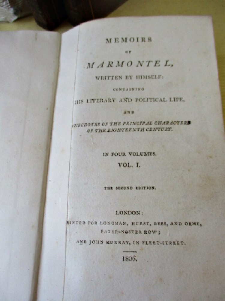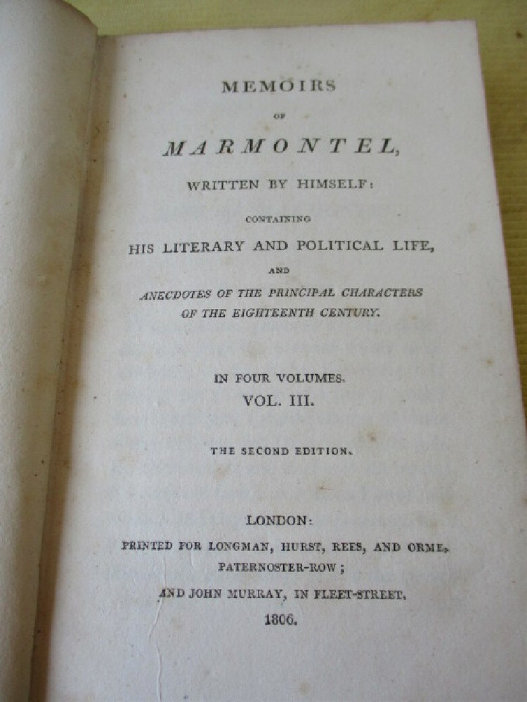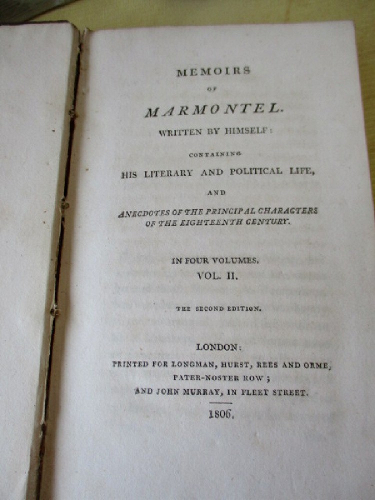 sml332. Memoirs of Marmontel, written by himself, plus, Anecdotes of Principal Characters of the 18th Century. Three volumes; Vol. 1, 2, 3, only of 4. Pub. Longman, Hurst, Rees & Orme, London, 1806. Second Edition. 16mo, 7" tall, 420 pages, 402 pages, 356 pages. Polished calf covers. Vol. 2, front cover reattached. Spines appear darkened and scaly as though exposed to a long ago house fire. Contents excellent. Overall, Good+ condition. Do not hesitate to e-mail with any questions. As Always, Satisfaction Guaranteed! I expect to receive payment within 10 days, unless we have made other arrangements. Shipping will be USPS Media or First Class, depending on weight. If you prefer Priority mail, I will be glad to make the adjustment. I'm glad to combine multiple purchases in order to minimize shipping costs. I WILL SHIP INTERNATIONALLY, and I try to be as economical as possible with the shipping costs. RETURN POLICY: Satisfaction Guaranteed! Track Page Views With Auctiva's FREE Counter