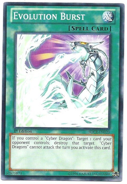 PICTURE IN LISTING IS ONLY FOR EXAMPLE ,it is a stock picture. Item condition is listed as "Used" because Ebay requires UPC codes for any item that is listed as "New", and trading cards do not have UPC Codes, so they must be listed as "Used". Card condition is listed in the listing title and in the item description. Rarity and edition of the card are described in the listing title and description. From this listing you will receive 3 card(s) for each purchase Description Set : Cyber Dragon Revolution Name : Evolution Burst Number : SDCR-EN020 Rarity : Common Condition : Near Mint Language : English We get your package in the mail quickly, please rate our service based on how quickly we gave your package to the post office. Not on how long it took the post office to deliver it. As we all know we cannot control that. If you have concerns about our shipping service, please send us a message and we will gladly talk to you about it and explain it. Domestic Buyers: Domestic orders within the United States are shipped for one flat rate, no cost for additional cards purchased on the same invoice. International Buyers: International orders are shipped First Class Mail International with and an additional item fee of $0.50. Orders over $50.00 USD require additional postage fees because of shipping method changes. SPECIAL REQUIREMENTS For International Orders Any International order greater than $100.00 USD will require shipment by : USPS Global Express Mail This is a flat rate service and you may ship cards totaling up to 16 ounces, the weight limit on the package. The following International Countries can request USPS First Class Mail International Package as the shipment method for orders over $50.00 USD as this service provides electronic tracking to these countries. This service is more expensive than the normal USPS First Class Mail International service, but cheaper than USPS Priority Mail International. Australia Gibraltar Netherlands Belgium Great Britain New Zealand Canada Hungary Northern Ireland Croatia Israel Portugal Denmark Latvia Singapore Estonia Lithuania Spain Finland Luxembourg Switzerland France Malaysia Germany Malta Special Handling of International orders : We reserve the right to hold and/or cancel any International order in which it appears the buyer is attempting to circumvent our Global Express shipping requirements by breaking up larger purchases into smaller orders. Orders made within a 30 day window and having previous orders that have not yet been acknowledged as received, via Feedback and Ebay messages will be subject to this condition and may be held until all previous orders have been acknowledged as received. International Buyers – Please Note: Import duties, taxes and charges are not included in the item price or shipping charges. These charges are the buyer's responsibility. Please check with your country's customs office to determine what these additional costs will be prior to bidding/buying. SHIPPING: Every attempt is made to send your item out within 1 business day of receipt of payment. Check our feedback! Pre-sell items are shipped within 1 business day of us getting merchandise in hand. Default Shipping Methods: Domestic Orders: Shipped First Class Mail Cards will be shipped with a Hard Sleeve and/or a Soft Sleeve for protection in accordance with eBay's standard envelope policy. International Orders: Shipped First Class Mail International Cards will be shipped with a Hard Sleeve and/or a Soft Sleeve for protection in accordance with eBay's standard envelope policy. We use all new and clean products to package your cards. If you have any questions, please do not hesitate to ask!