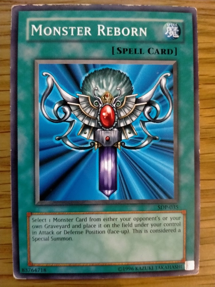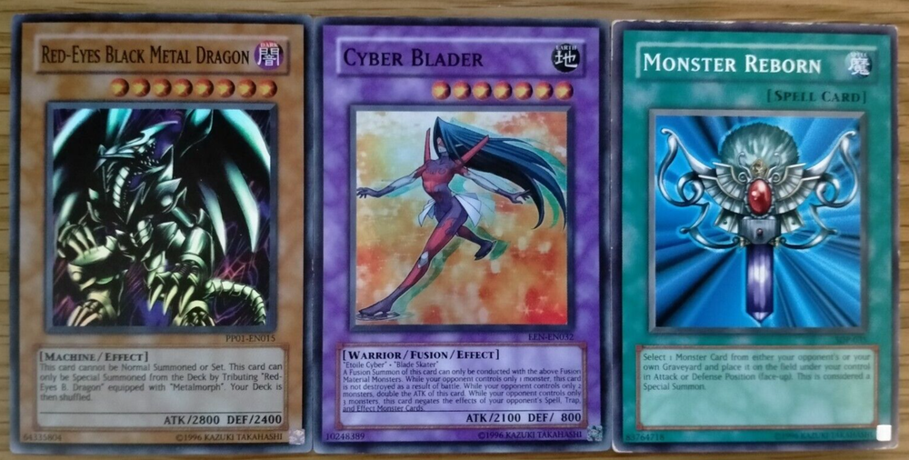 3 x Yugioh! Cards - Red-Eyes Black Metal Dragon, Cyber Blader, Monster Reborn Red-Eyes Black Metal Dragon Rare - minimal corner wear Cyber Blader Rare - central crease Monster Reborn Common - corner & edge wear