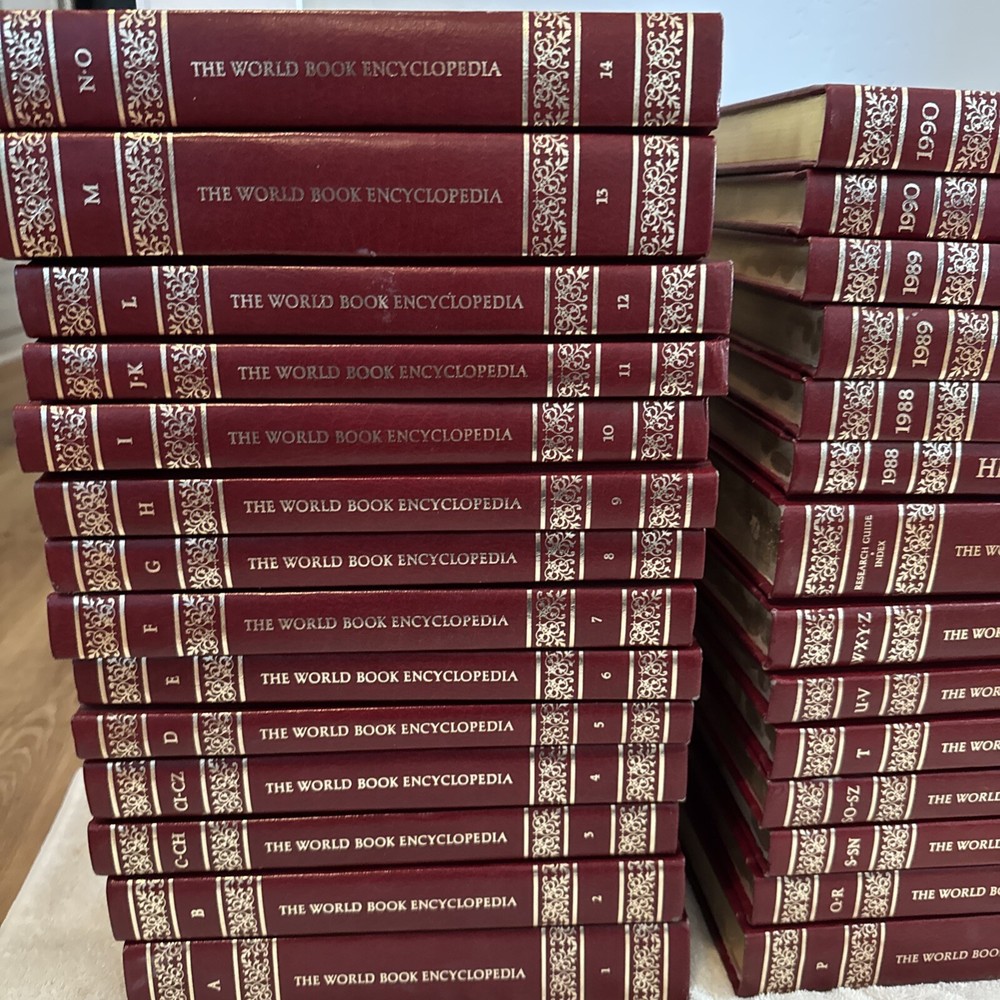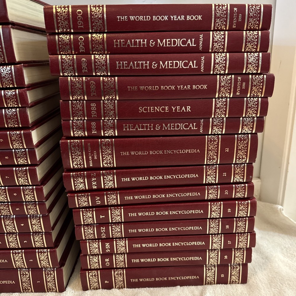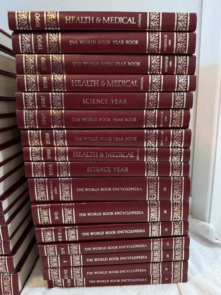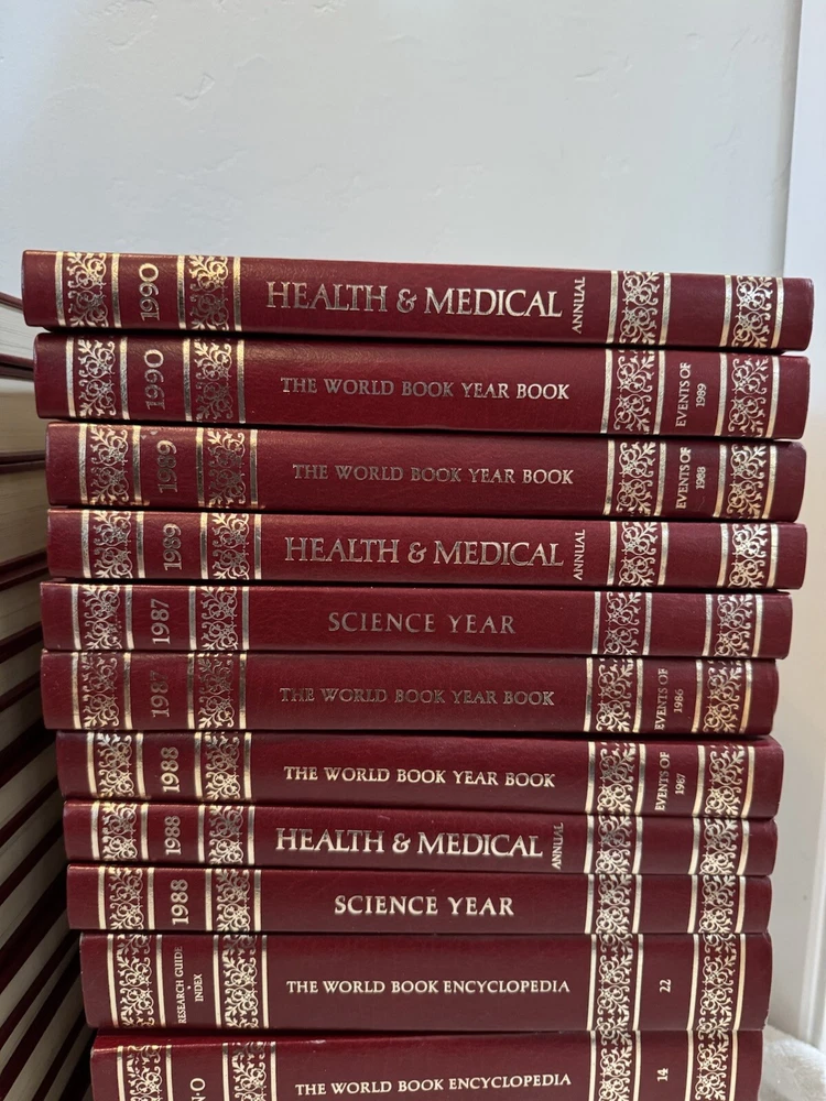 28 World Book Encyclopedia COMPLETE SET of 21 Volumes 1986 + Index & 6 Yearbooks. The annual books are from 1988-1990. They are health and medical, yearbooks, and a science year. The books have a great look and would be an excellent addition to your bookshelf. All of the books are in very good used condition. Some show almost no use and some have edge wear and some light marks, especially the index. The interior pages look clean. Please see pictures for details. This will probably ship in 2 boxes and will far exceed the shipping costs charged.