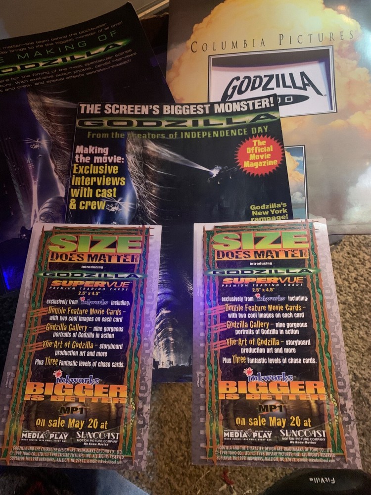 :7 excellent condition complete sets of the 1998 Godzilla movie cards. 2 card slicks, one movie script with photos, two magazines. This is unreal! Perfect condition card sets from the movie Godzilla, ...
