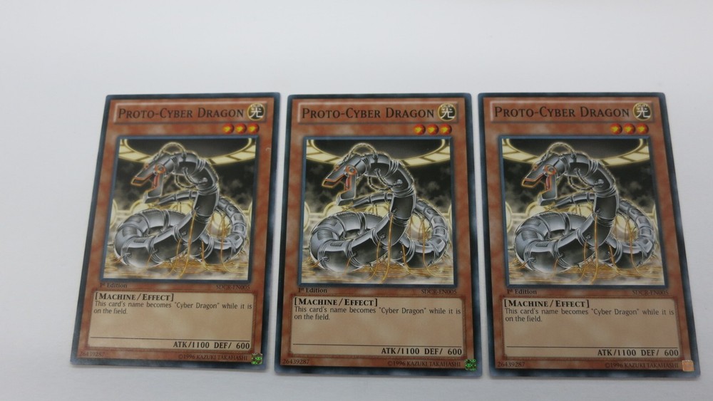 Welcome to Great_Deals_On_Collectibles.We are in the retail hobby sector and have been since 1991.We sell sportscards,gaming cards,comic books,action figures,plush toys and various other hobby related items.We have been on Ebay since 1999.We try to make buyers experience on EBAY as satisfying as possible.Our feedback on Ebay speaks volumes.Every item we have up for auction is LIVE and ready to be shipped upon payment. If you have any questions feel free to contact us,thanks for showing interest. YUGIOH You are bidding on 3x PROTO-CYBER DRAGON SDCR-EN005 1ST EDITION COMMON YUGIOH NM / UNPLAYED