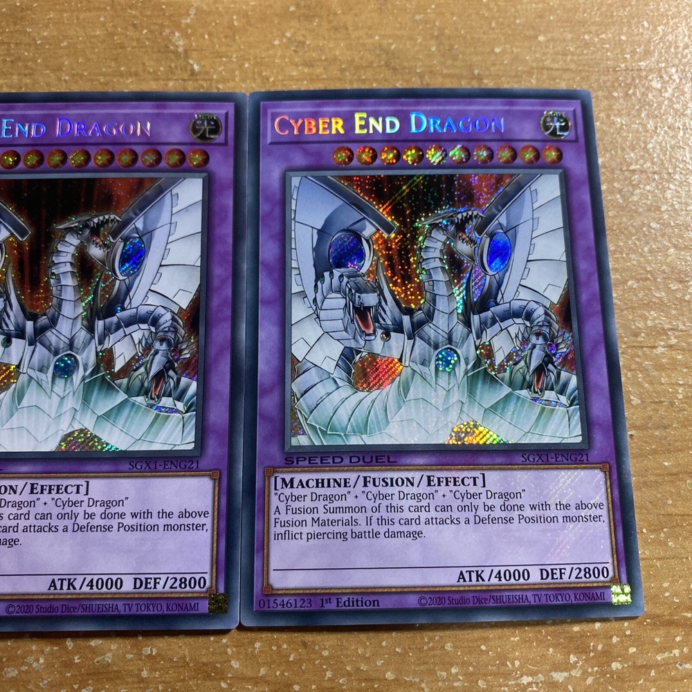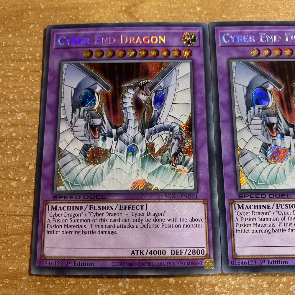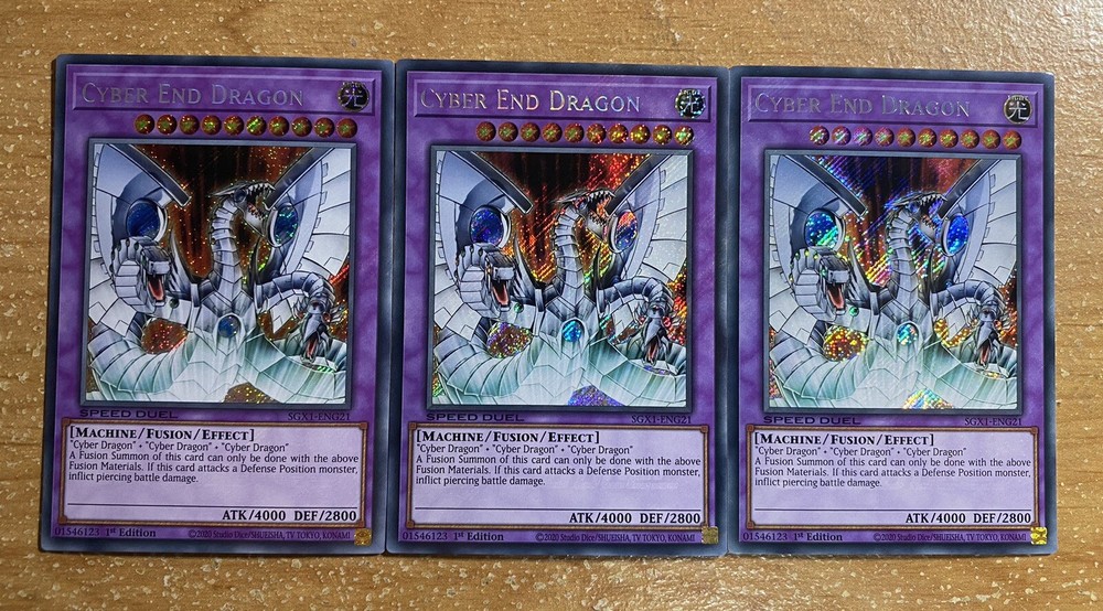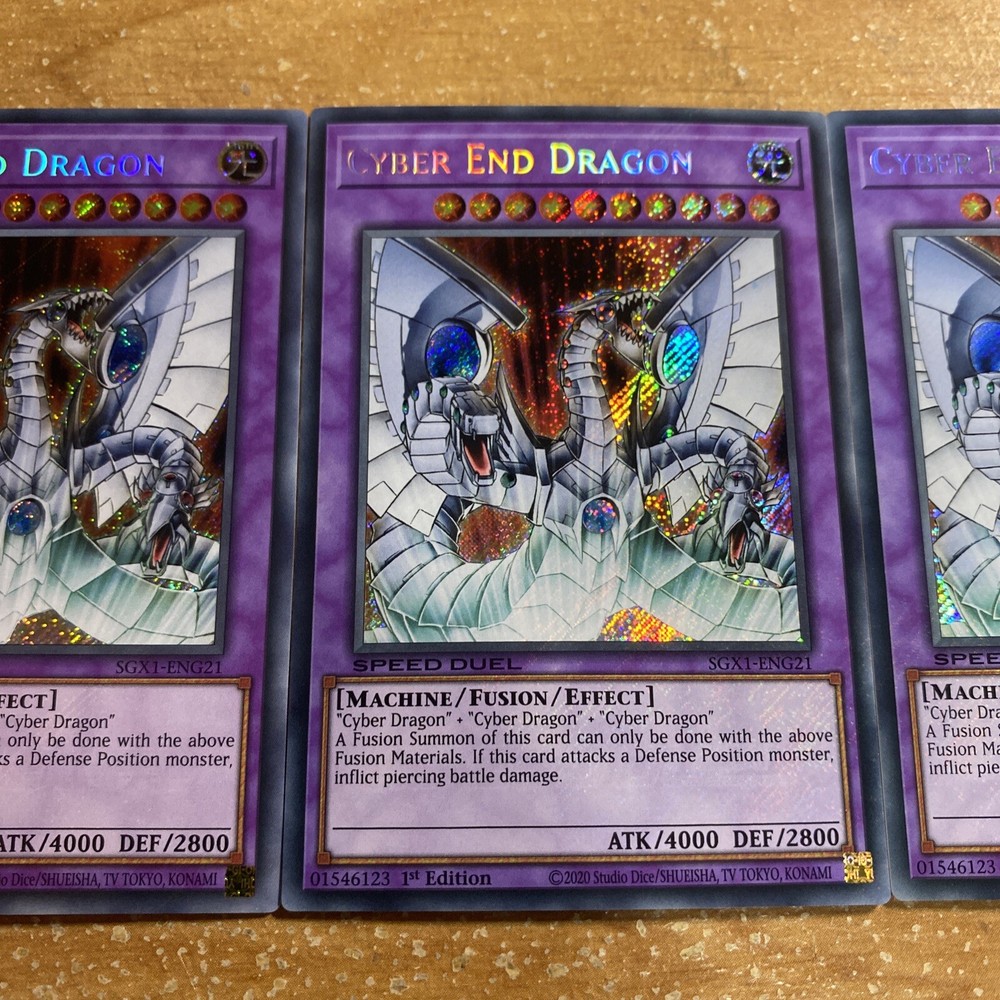 🔥 3x Yugioh CYBER END DRAGON SECRET RARE SGX1-ENG21 1ST ED PLAYSET SPEED DUEL YOU WILL RECEIVE 3x (three) CARDS IN TOTAL! This item will be sent in a plastic sleeve/deck protector sleeve and in a toploader for maximum protection. Shipping is FREE! Payment is due immediately. The faster the payment the faster i'll ship out. Questions or comments?? Feel free to contact me. I'll get back to you within 24 hours. Check out my eBay store for more Yugioh items!