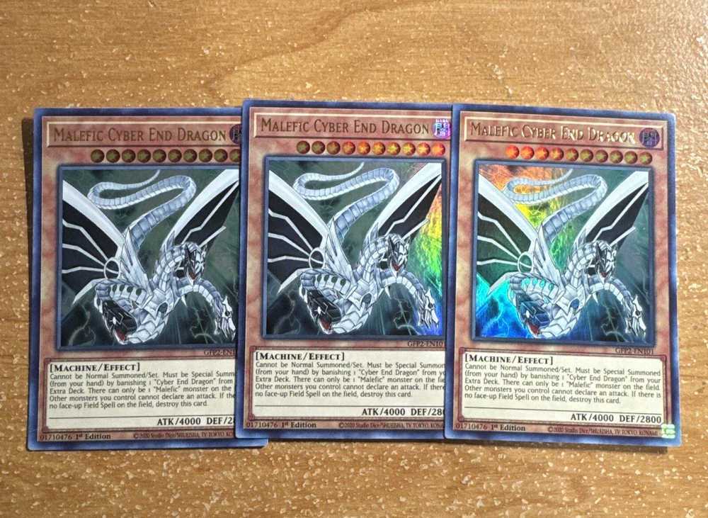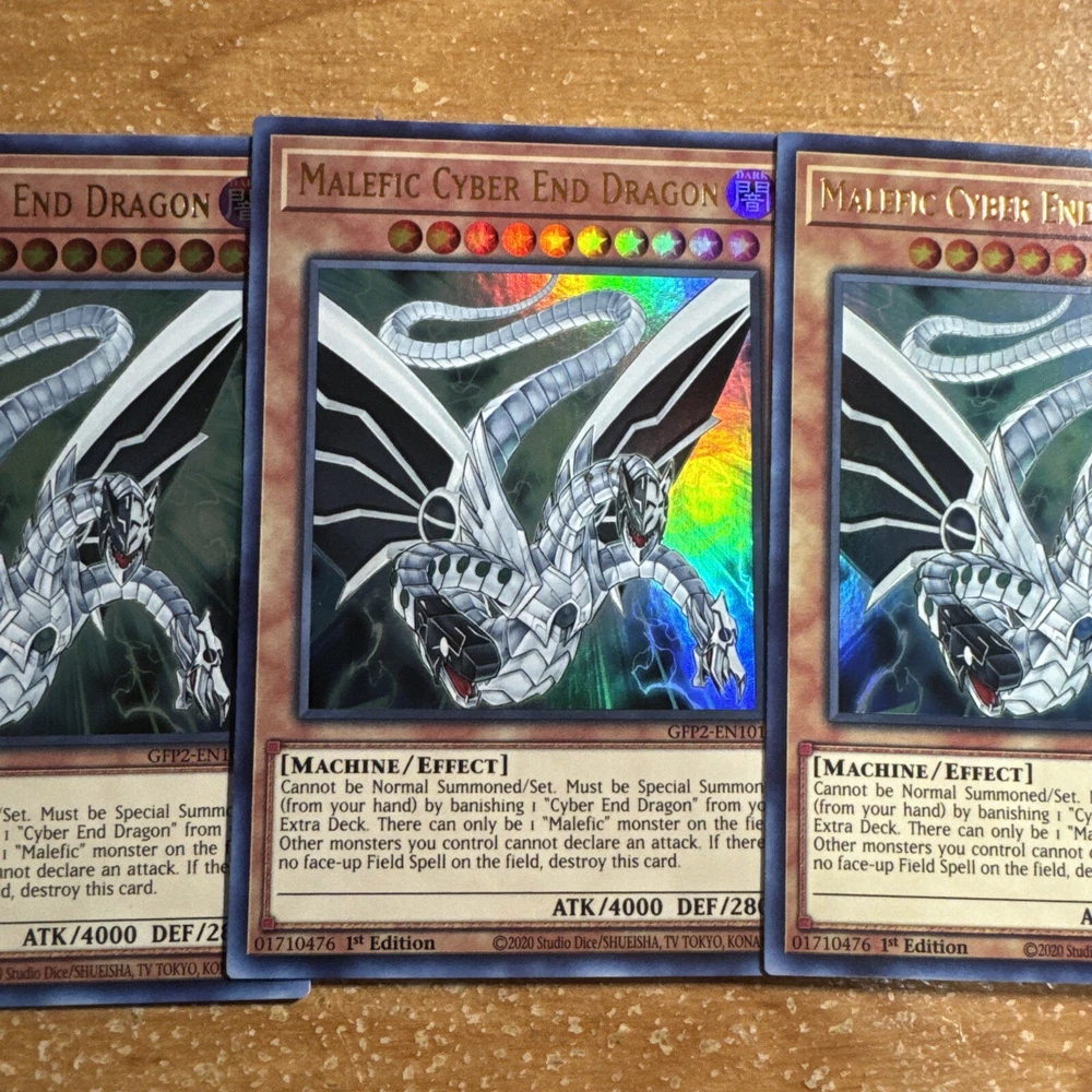🔥 3x Yugioh GFP2-EN101 Malefic Cyber End Dragon ULTRA RARE NM 1ST ED PLAYSET This item will be sent in a plastic sleeve/deck protector sleeve and in a toploader for maximum protection. Shipping is FREE! I usually ship out the next business day. Payment is due immediately. The faster the payment the faster i'll ship out. Questions or comments?? Feel free to contact me. I'll get back to you within 24 hours. Check out my eBay store for more Yugioh items!