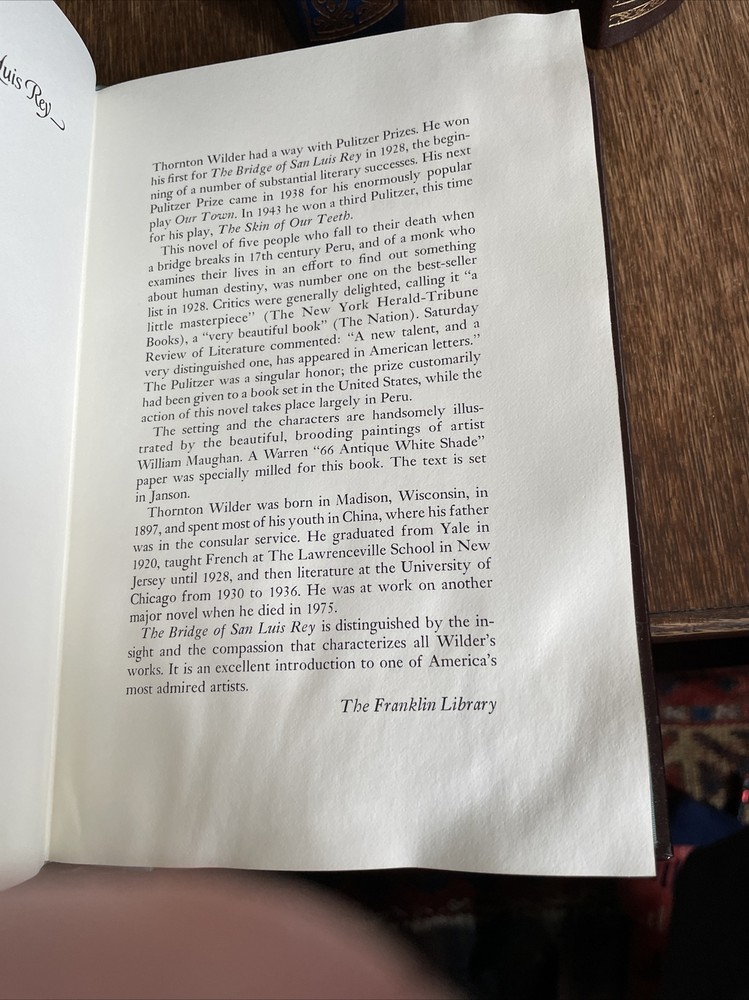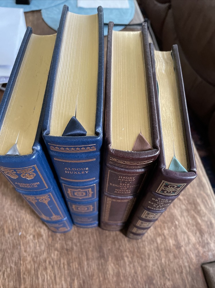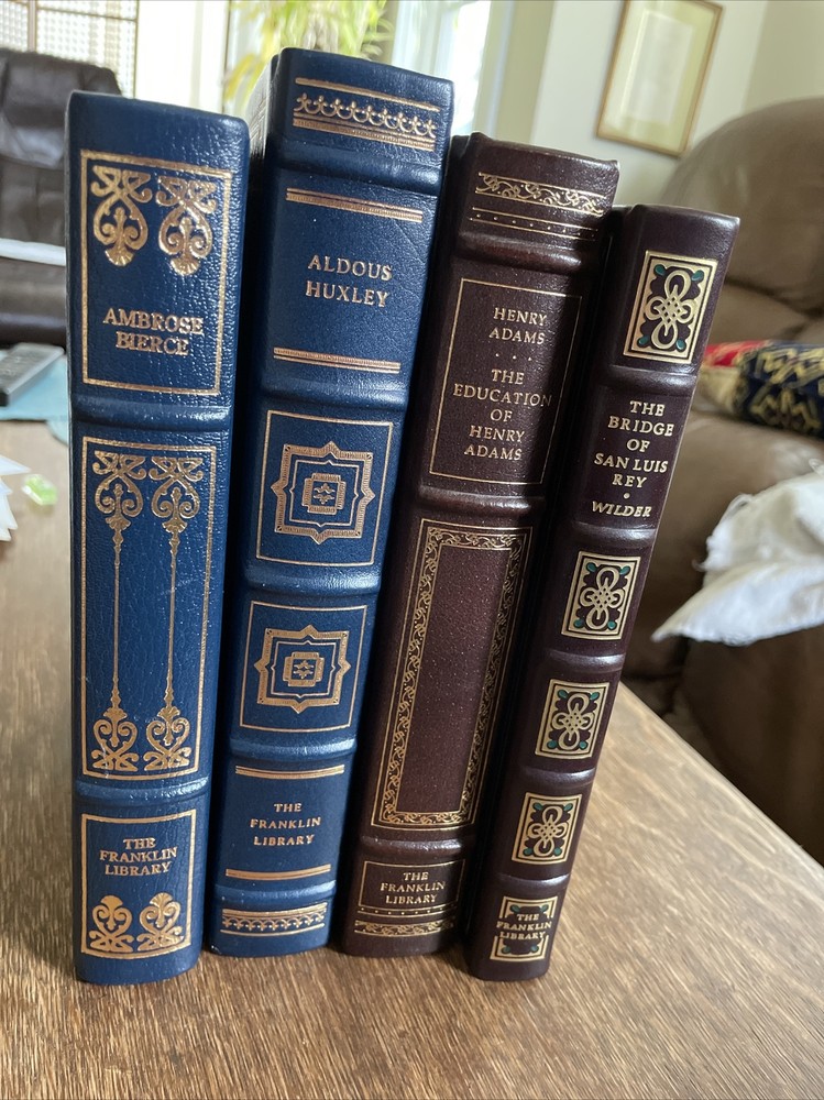 4 Lovely Vintage Franklin Library Books HUXLEY, WILDER, BIERCE, Henry Adams leather, gold leaf and Excellent condition. Exception: the bridge of San Luis by Wilder has some apparent warping in pages....