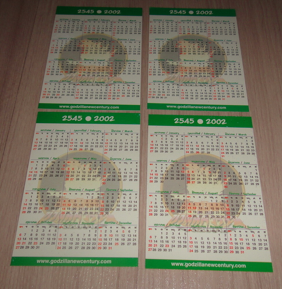 4 Godzilla G2001 TOHO Kaiju Monsters Movie Thailand 2002 Calendar Card Promoting this movie in Thailand Rare! Paper card , credit card size. Unused condition . Fans Don't Miss.(check photos) ---------------------------------------------------------------------- . SHIPPING We ship worldwide via Registered Airmail SAL. USD 10.00 $ .Flat rate. HANDLING Item will ship out within 5 working days upon receipt of payment. Item will packed with protective material to prevent damage during transit. PAYMENT Accept all payment via ebayMP ,this is easy and the most preferred way. Thanks for your visit , please feel free to e-mail me if you have any questions and browse on my other items that might interest you.