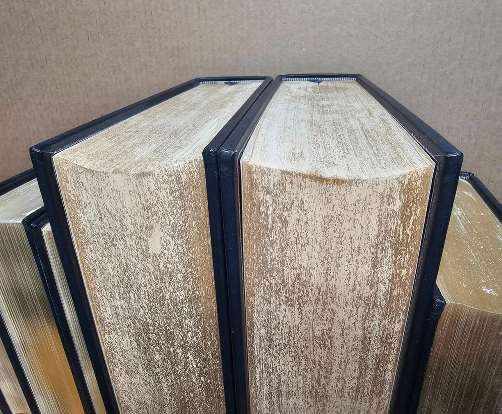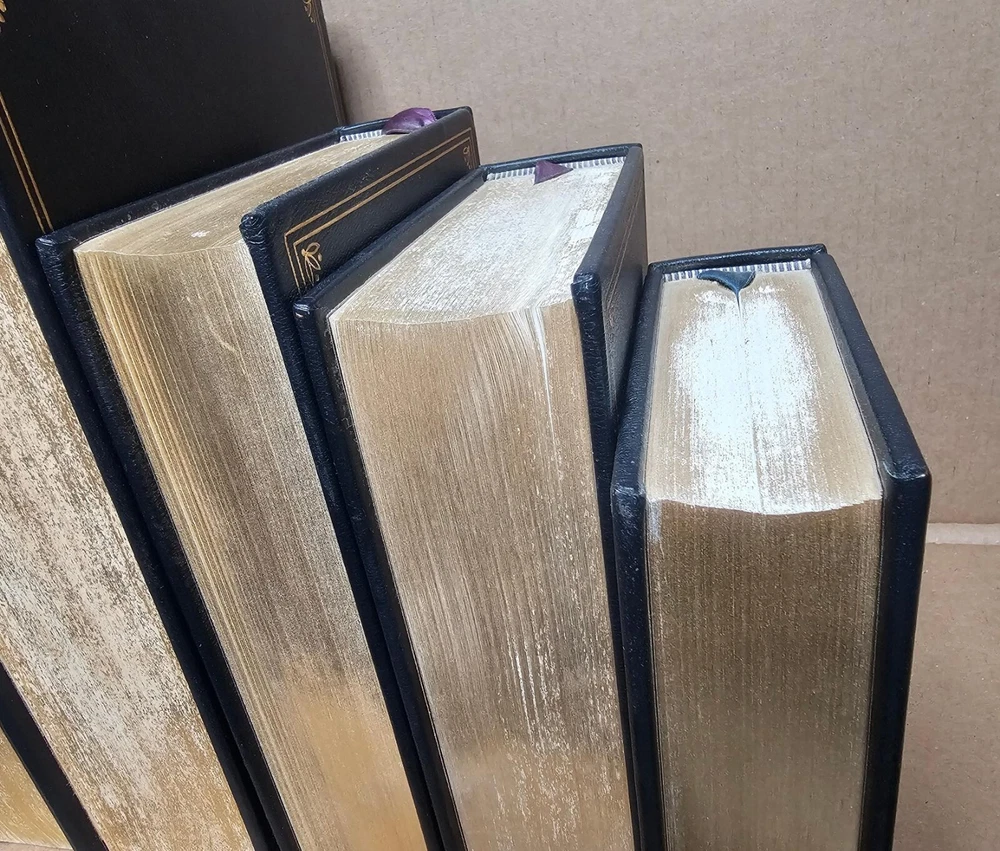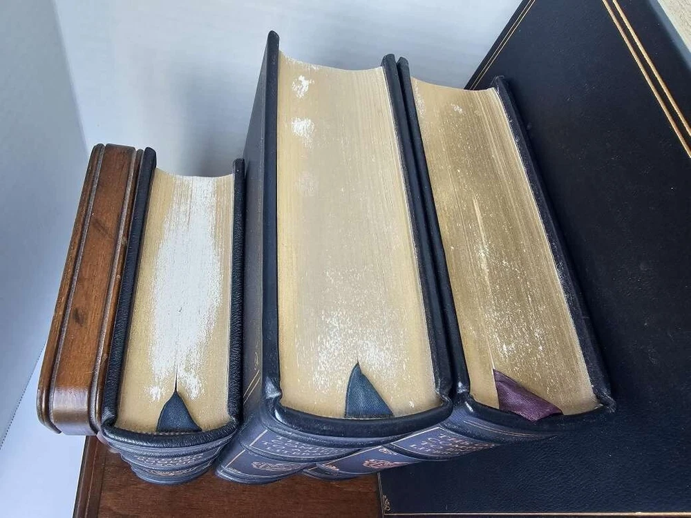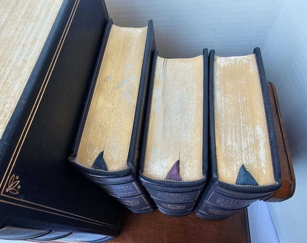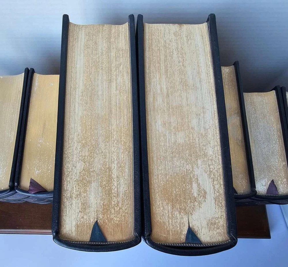 8 volume leather bound set with wooden book holder. This is number 2400 of 7500 limited sets. "Good" condition overall for the set and book holder. BOOKS: Exterior leather in good to very good condition, minor rubbing and edge/corner wear on most volumes. One or two volumes may have a few faint marks from storage. No major corner bumps or nicks to boards. The bindings are rock solid. HEAVY wear to gold gilding on textblocks. Interiors are clean other than a few minor age marks and slight curling/creasing in the top margin of the pages in a couple of the volumes. BOOK HOLDER: Structurally sound with moderate wear and heavy scratches to some areas. See photos. Will be carefully packaged and shipped within 48 hours M-F. [x]