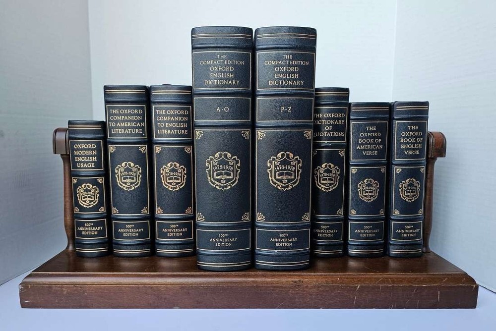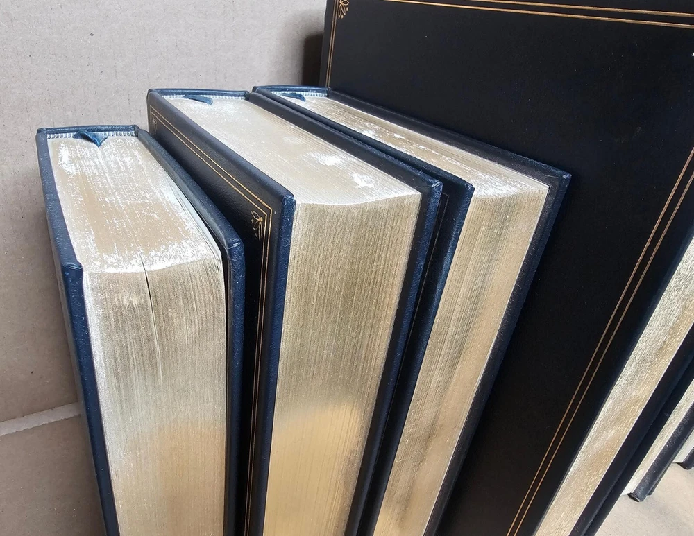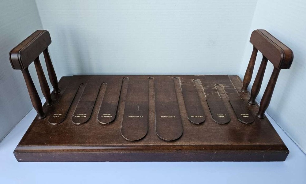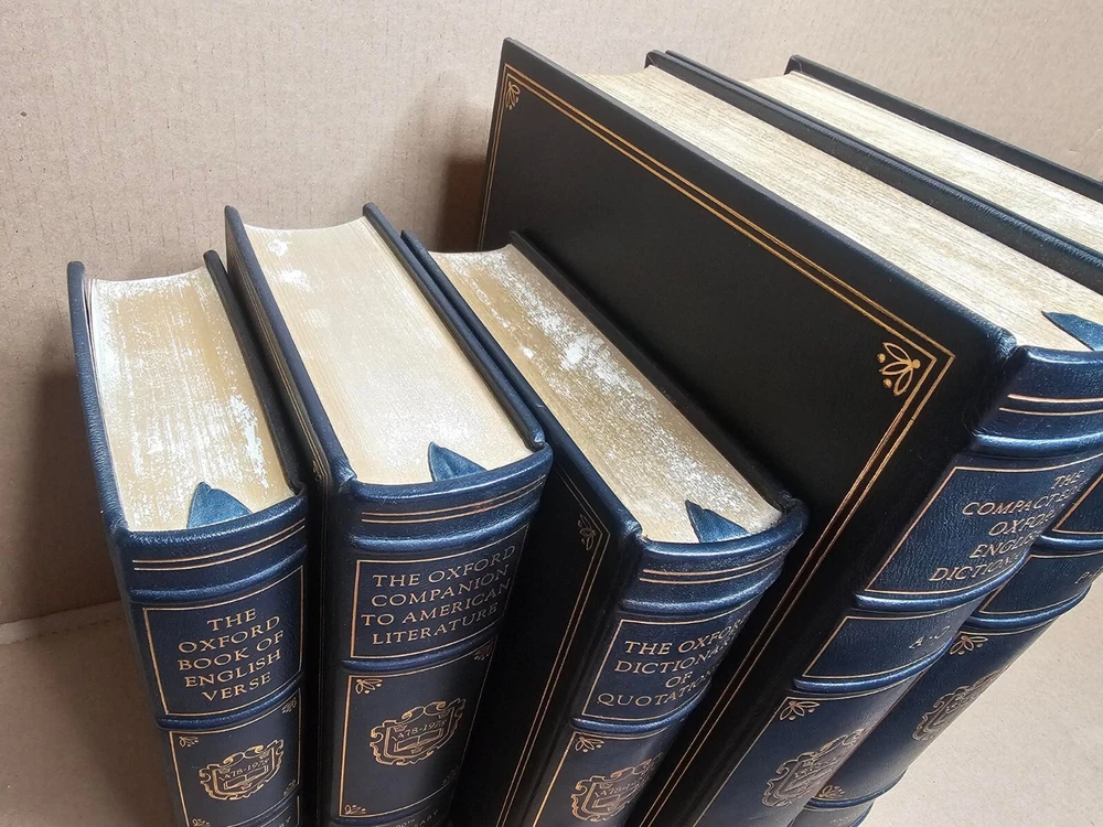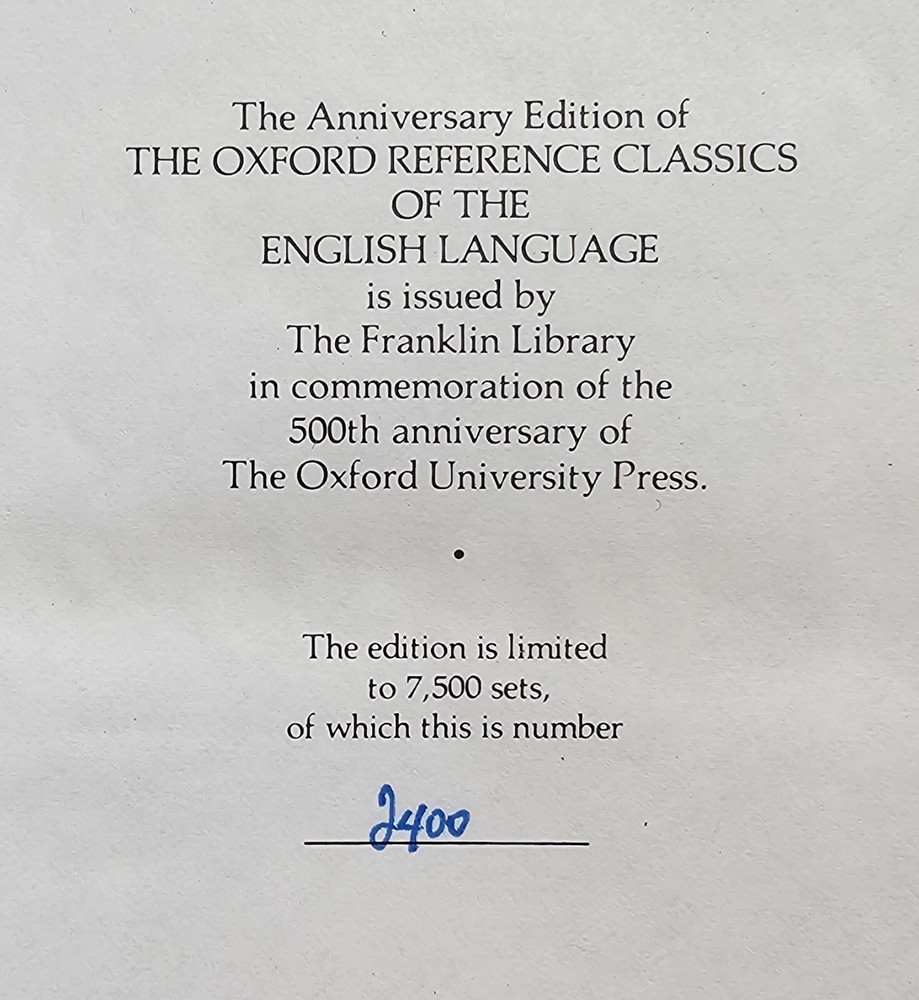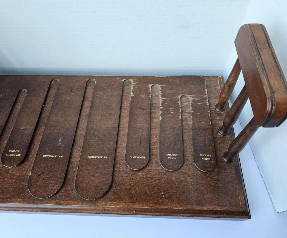8 volume leather bound set with wooden book holder. This is number 2400 of 7500 limited sets. "Good" condition overall for the set and book holder. BOOKS: Exterior leather in good to very good condition, minor rubbing and edge/corner wear on most volumes. One or two volumes may have a few faint marks from storage. No major corner bumps or nicks to boards. The bindings are rock solid. HEAVY wear to gold gilding on textblocks. Interiors are clean other than a few minor age marks and slight curling/creasing in the top margin of the pages in a couple of the volumes. BOOK HOLDER: Structurally sound with moderate wear and heavy scratches to some areas. See photos. Will be carefully packaged and shipped within 48 hours M-F. [x]