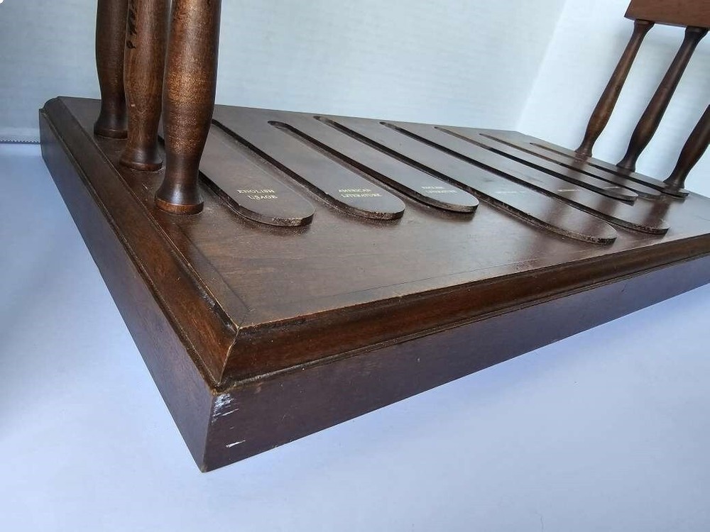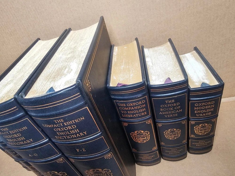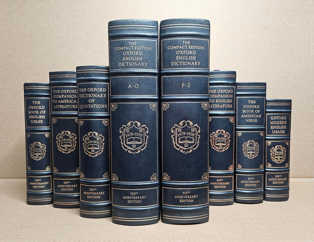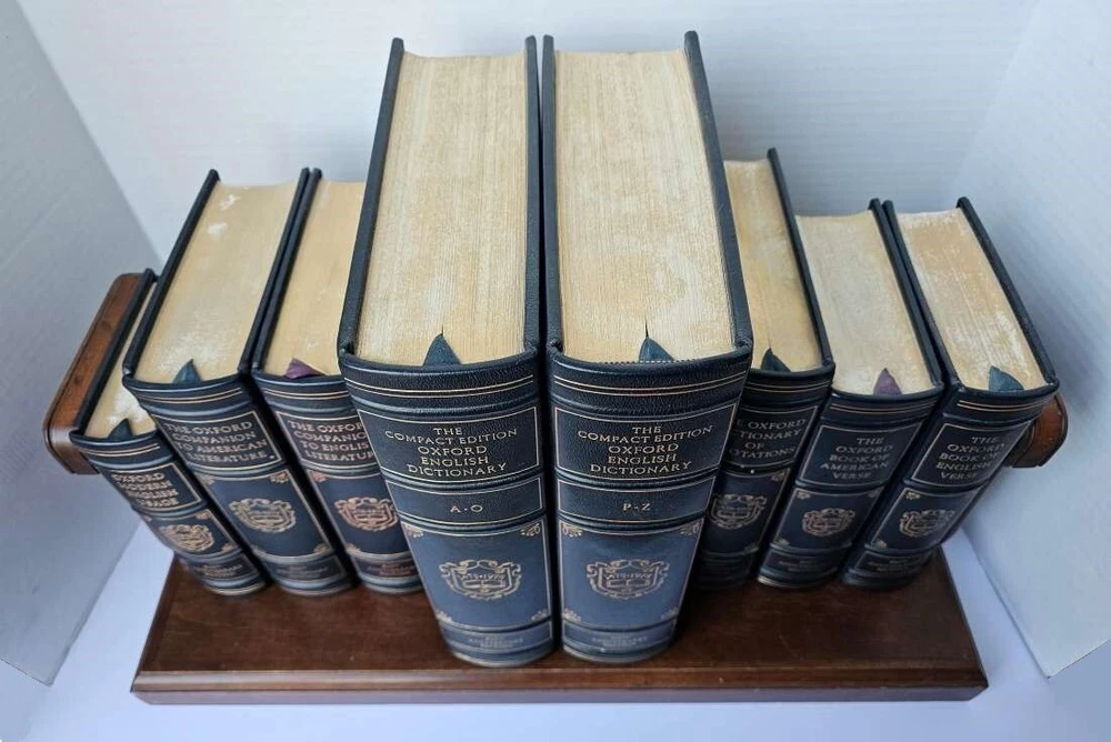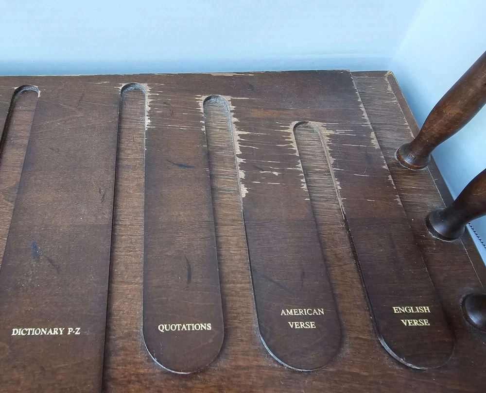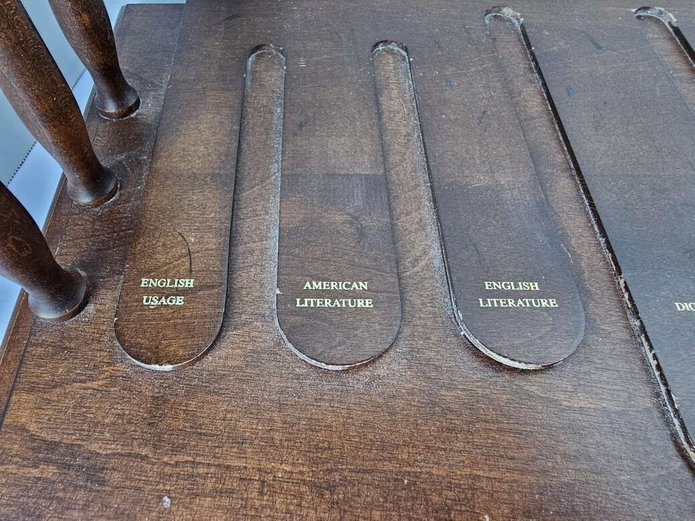8 volume leather bound set with wooden book holder. This is number 2400 of 7500 limited sets. "Good" condition overall for the set and book holder. BOOKS: Exterior leather in good to very good condition, minor rubbing and edge/corner wear on most volumes. One or two volumes may have a few faint marks from storage. No major corner bumps or nicks to boards. The bindings are rock solid. HEAVY wear to gold gilding on textblocks. Interiors are clean other than a few minor age marks and slight curling/creasing in the top margin of the pages in a couple of the volumes. BOOK HOLDER: Structurally sound with moderate wear and heavy scratches to some areas. See photos. Will be carefully packaged and shipped within 48 hours M-F. [x]