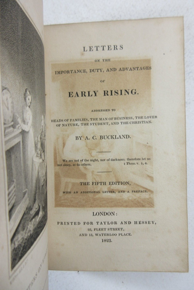 For sale is a Good to acceptable condition leather hardcover copy of Letters on the Importance, Duty, and Advantages, of Early Rising. Addressed to Heads of Families, the Man of Business, the Lover of Nature, the Student, and the Christian by A. C. Buckland. Stated 5th Edition, published in 1823 printed for Taylor and Hessey, London. Pages are unmarked. Binding is sound with the exception of both the hardboards being fragile and slightly detached. Boards are generally clean and square with minor scuffing around the edges. Please see photos for condition detail. Shelf Reference #L-1689