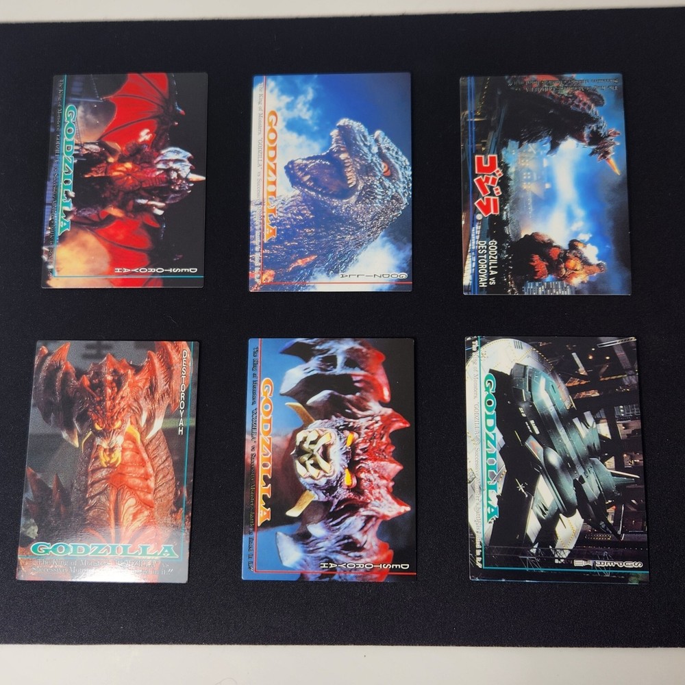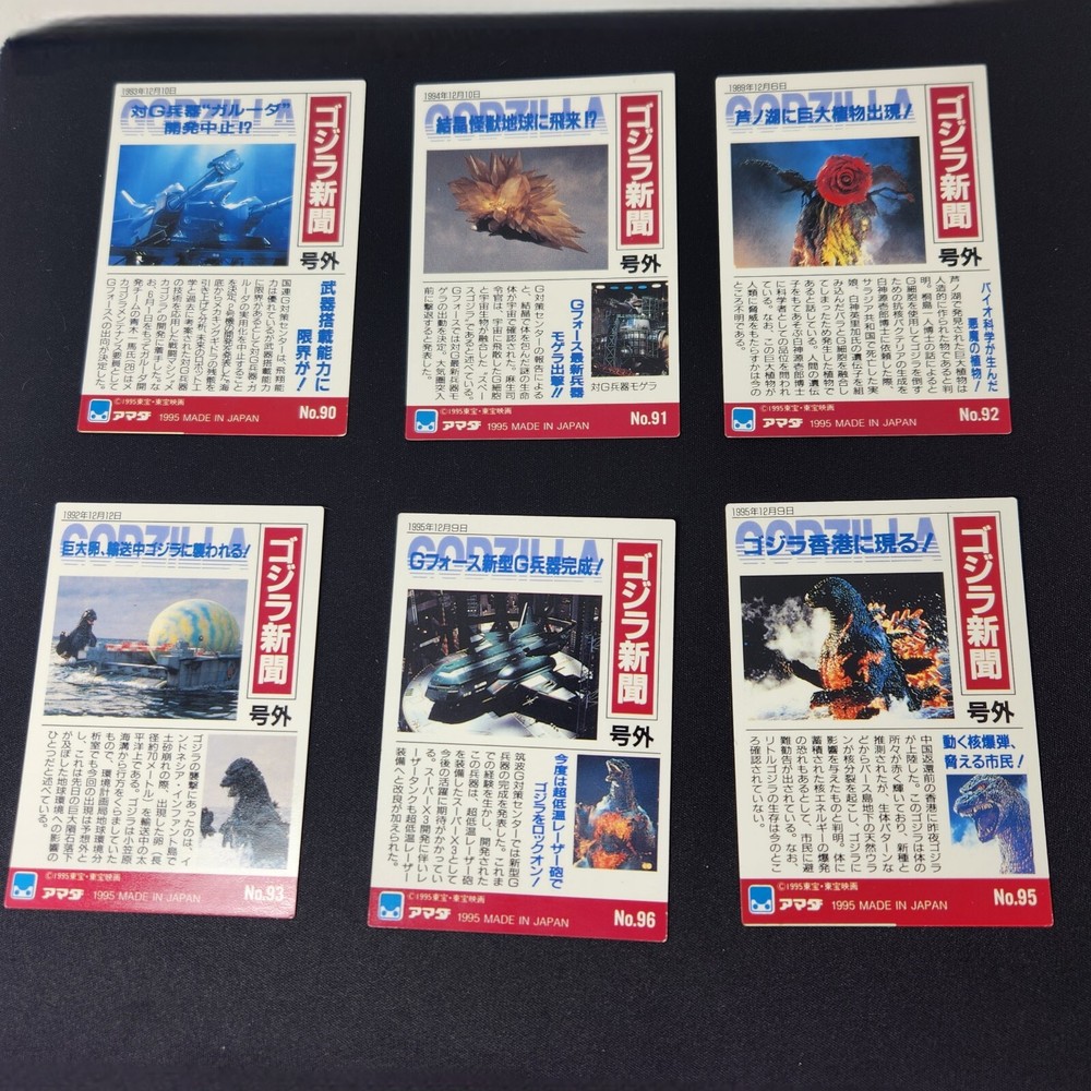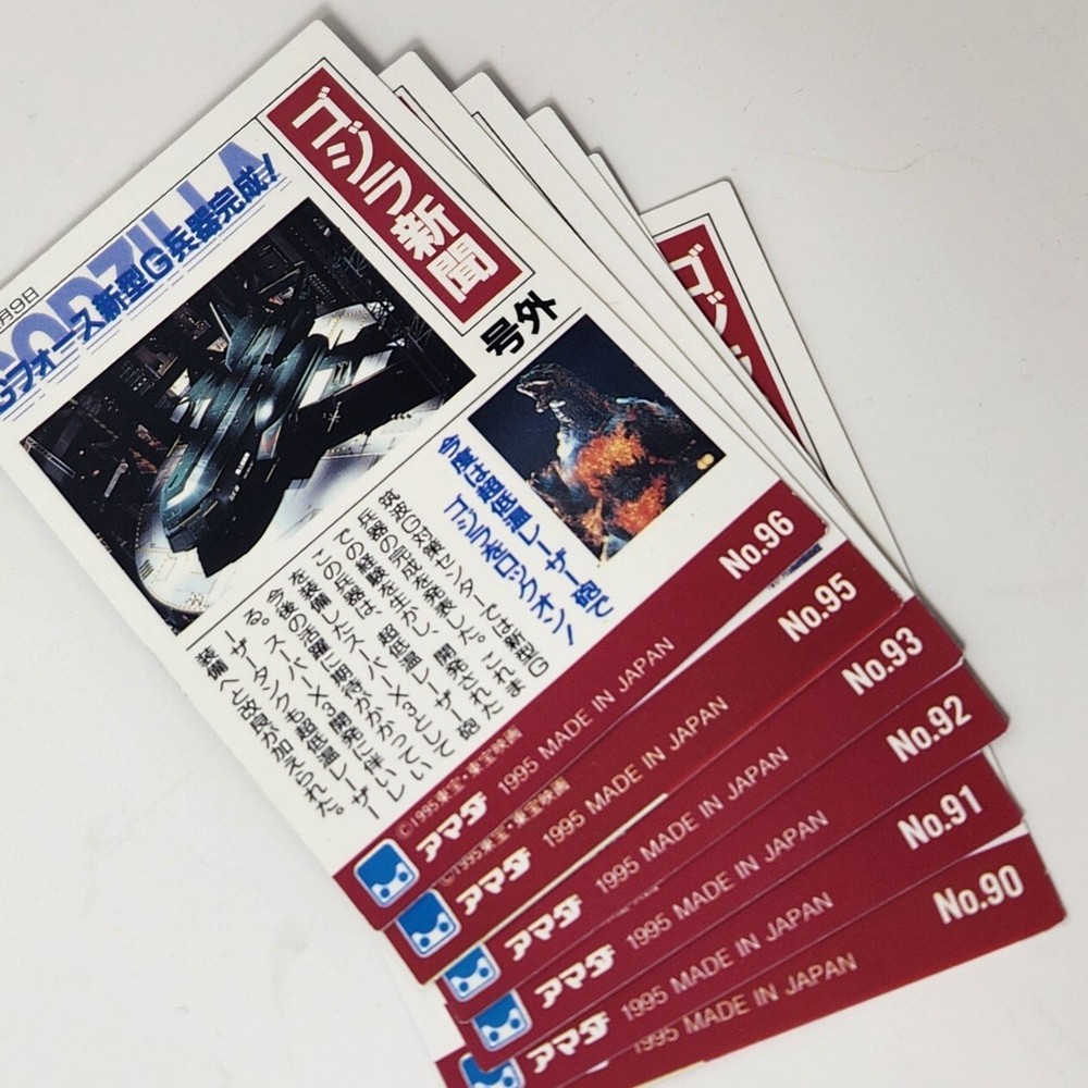 Delve into the world of classic monster memorabilia with this exclusive lot of six 1995 Japan Godzilla newspaper trading cards, featuring numbers 90, 91, 92, 93, 95, and 96 from Amada. These cards are a testament to the enduring popularity of the Godzilla franchise, capturing the excitement and fascination that has captivated audiences for generations. Each card is a piece of Japanese pop culture history, showcasing the iconic creature in various scenes and poses. Collectors and fans alike will appreciate the intricate detailing and vibrant colors that bring these classic images to life. Whether for display or as a cherished addition to a collection, these cards represent a timeless fascination with one of the most beloved monsters of all time. Ships to Lower US 48 Thanks for viewing this listing! Please check out our other unique and vintage items on eBay. We strive to list new items daily and as accurately as possible. As interpretations could differ we also upload plenty of photos as part of the description. If you have further questions on an item please send a message.