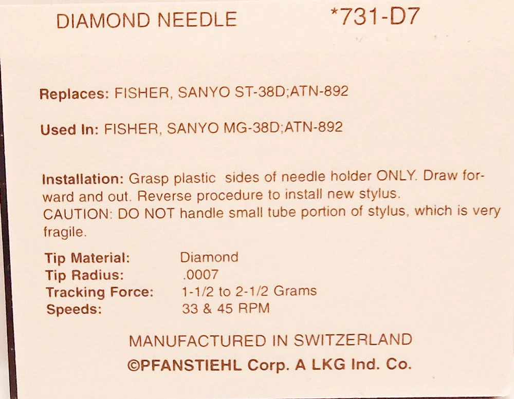 NEW IN BOX TURNTABLE STYLUS NEEDLE FOR SANYO ST38D ST-38D MG-38 MG38D 731-D7, TURNTABLE STYLUS RECORD NEEDLE for Audio Technica ATN-892 AT-892 MG-38D, 731-D7 PHONOGRAPH RECORD PLAYER NEEDLE for SANYO FISHER ST38D ST-38 MG-38 MG38D Model Pfanstiehl 731-D7 Description Brand New (factory box) Generic replacement stylus Diamond .7 mil conical tip needle 1.5 - 2.5 grams tracking pressure Speeds: 16, 33 & 45 RPM REPLACES needles listed below NEEDLE S AUDIO TECHNICA ATN-892 ATN892 EVG 3097D PM2945D PM3097D FISHER 4-1579-27010 4157927010 4-1579-29430 4157929430 ST-38D ST38D RECOTON SP980D SANYO ST-38D ST38D CARTRIDGES AUDIO TECHNICA AT-892 AT892 FISHER MG-44G MG44G SANYO MG-38 MG-38D ST38D ST38D MG38 MG38D MODELS FISHER 1190 1210 125C 273C 1490 1500 10 50 155 156 157 158 159 160 161 162 163 164 165 166 167 168 169 170 171 172 173 174 175 176 177 1600 2140 270 300 3330 4000 4000 4100B 4100B 4750B 4750 4750B 3550 6600 6600 7780 9900B 9900 9900B ACS-M270 ACSM270 ACS-M270 ACSM270 HOLLYWOODS77 HOLLYWOOD M160 M260 M270 M300 MC125 MT100 MT101 MT125 MT273C MT300 MT3000 MT3000C MTM300 MTM300C MTM301 MTM301C STUDIOSTANDARDBl SYSTEM100 SYSTEM100L SYSTEM55 SYSTEM55L SYSTEM4000B SYSTEM41008 SYSTEM4750B SYSTEM55 SYSTEM55L SYSTEM77 SYSTEM77 SYSTEM7780