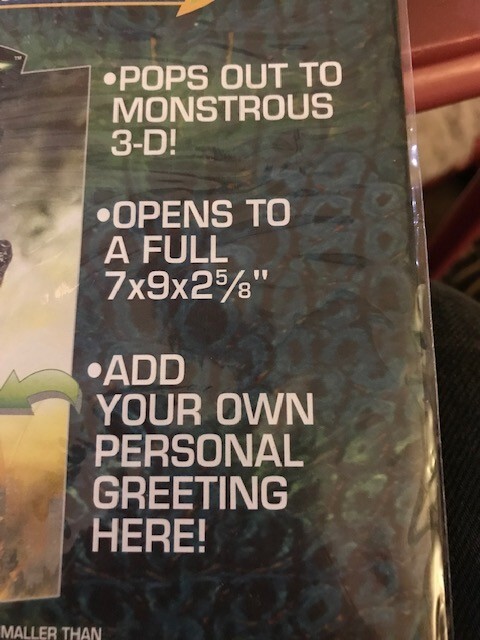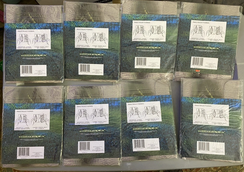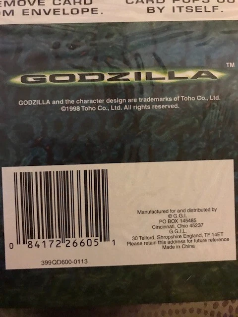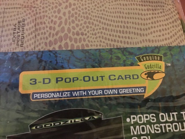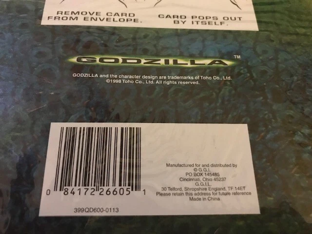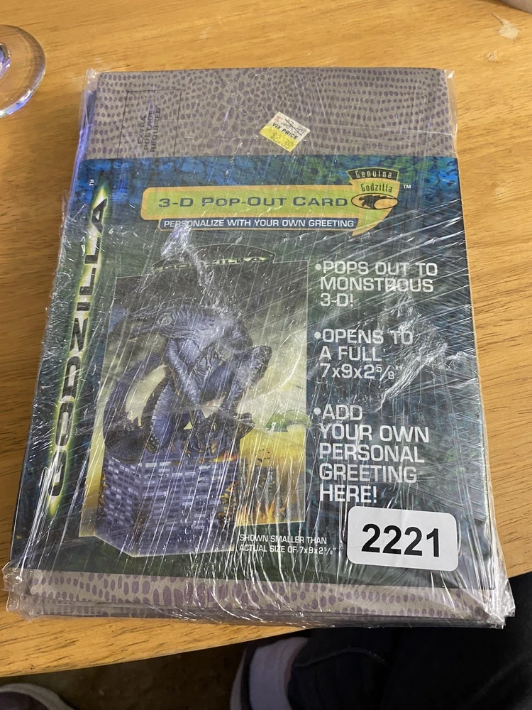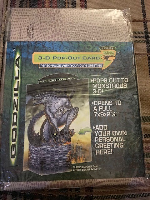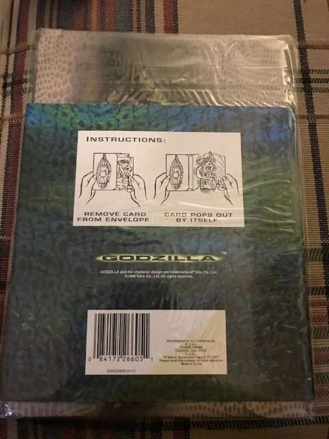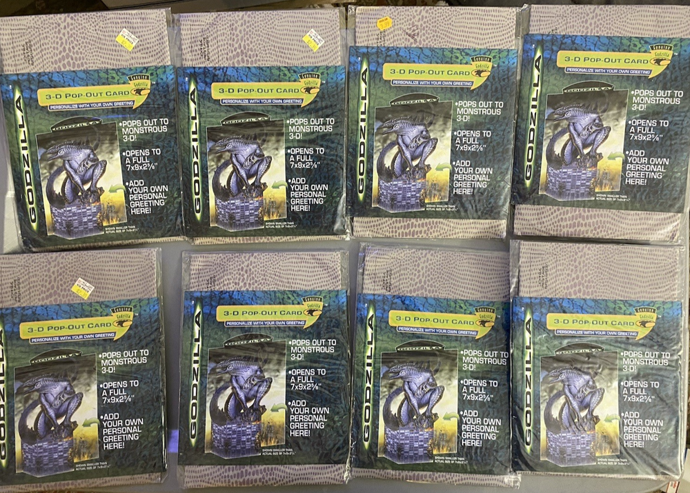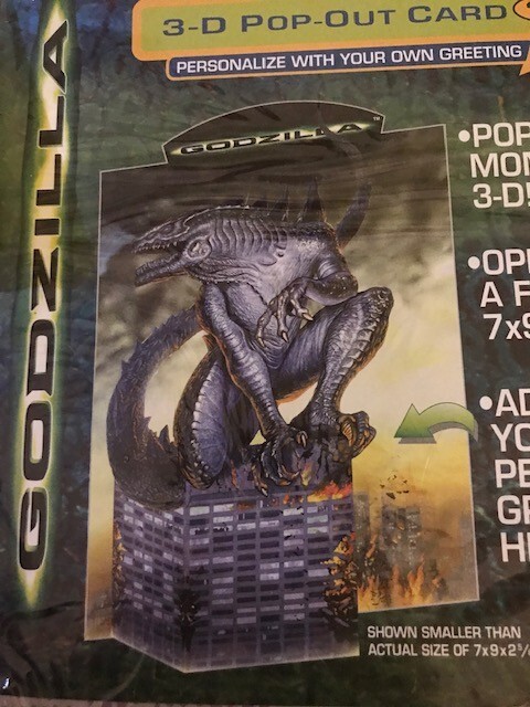 8 - GGI Godzilla 3D Pop-Out Greeting Card 1998 NEW SEALED 7 X 9 X 2 5/8" Unleash a touch of nostalgia with the G.G.I. Godzilla 3D Pop-Out Greeting Card, a perfect choice for fans of the classic monster. This collectible card, dating back to 1998, features the iconic Godzilla design that pops out in a thrilling 3D format, providing an unexpected and playful twist to your personalized message. The card, measuring 7 x 9 x 2 5/8 inches, includes an envelope for easy sending and makes for a versatile recipient, suitable for a personal touch on any occasion. Genuine Godzilla product line, this multicolored card is a unique blend of pop culture and sentiment, ready to be personalized with your own greeting. •Condition: New Sealed Unopened •Size: 7 X 9 X 2 5/8" •Color: Multicolor •Features: 3D Pop-Out Greeting Card - Add your own Personal Greeting The item is in good condition from a non-smoking home. - Please note: Some of the packages have old price tags. Some of the corners may be creased from storage. Office - 2221 Wicker Basket