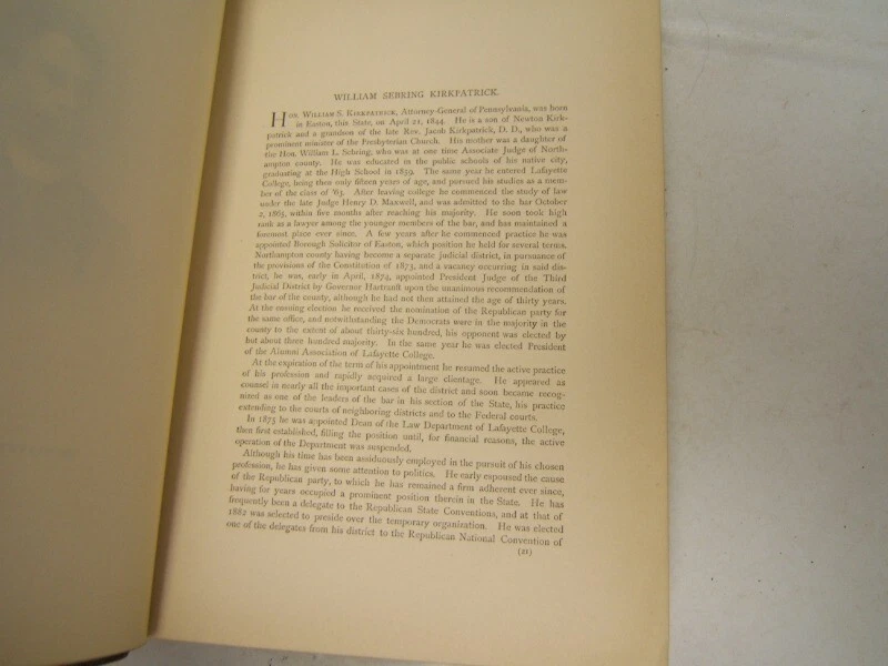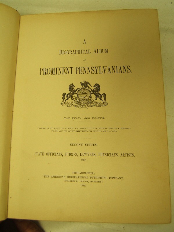 A Biographical Album of Prominent Pennsylvanians 2nd Series 1889 Leather A Biographical Album of Prominent Pennsylvanians 2nd Series 1889 Leather Click images to enlarge Description ? A Biographical Album of Prominent Pennsylvanians Second Series State Officials, Judges, Lawyers, Physicians, Artists, etc. Philadelphia: The American Biographical Publishing Company, 1889 Overall good condition, binding is sound, pages are clean. Cover is fair with wear to corners and hinges. Condition: Good Payment Paypal Shipping Domestic shipping: Fixed Shipping Charges. International shipping: Weight based Shipping Charges. International Carriers are: Usps Priority Intl Shipping Carrier Domestic International Shipping Locations Usps Book Rate $0.00 - - I will ship to: United States, Worldwide Weight: 9 lbs. 8 oz. Shipping and Handling: Please check eBay's Shipping & Payment tab Thank you for visiting the Juniata General Store. We are located in the heart of Central Pennsylvania just up the road from the beautiful Juniata River. We offer a wide variety of merchandise, both new and vintage. Most of our inventory is one of a kind items and we add new items constantly so check back often. Vendio Images: More than just a pretty image. 250+ Mobile Responsive & Active Content Free Listing Templates with Vendio Sales Manager. Vendio provides powerful selling automation for sellers of all sizes. Get business information that counts! - Vendio Counters are active content free.
