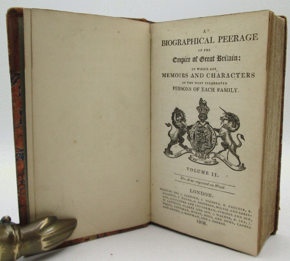 Ivy Ridge Books presents ... A Biographical Peerage of the Empire of Great Britain Vol II Only Author: Brydges, Samuel Egerton Sir Publisher: J. Johnson, J. Nichols, R. Faulder et al. Release Date: 1808 Seller Category: Biography Qty Available: 1 Condition: Collectible: Acceptable Sku: 10212 Notes: Volume II only. Marbled paper boards with leather spine and corners, front board not attached, heavy wear on the edges and surfaces. Clean interior. Crests and history of Barons, Viscounts. All orders packed with care, dust jackets protected by Brodart sleeve, independent bookseller since 2011 Don't forget to check out other great deals in our eBay Store!!