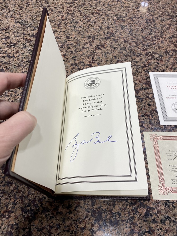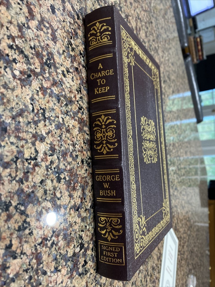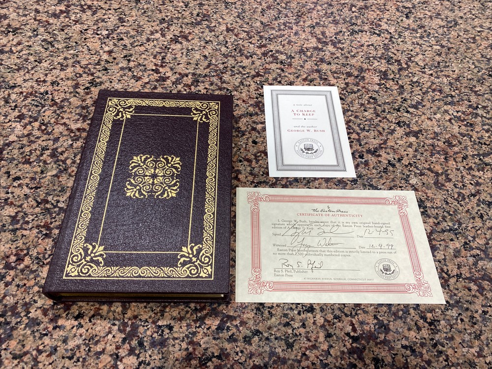 A Charge to Keep by George W. Bush Own this piece of history, a President's memoir. The limited, first, signed, collector's edition of this slice of history. COA included. Each unique volume includes all of the fine Easton Press features: - Bound in premium leather with hubbed spines - Accented with 22K gilding - Gold gilt page-ends - Satin ribbon page markers - Pages are Smyth-sewn into the binding - Acid-neutral paper for generational longevity - Printed and bound in the USA