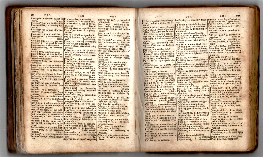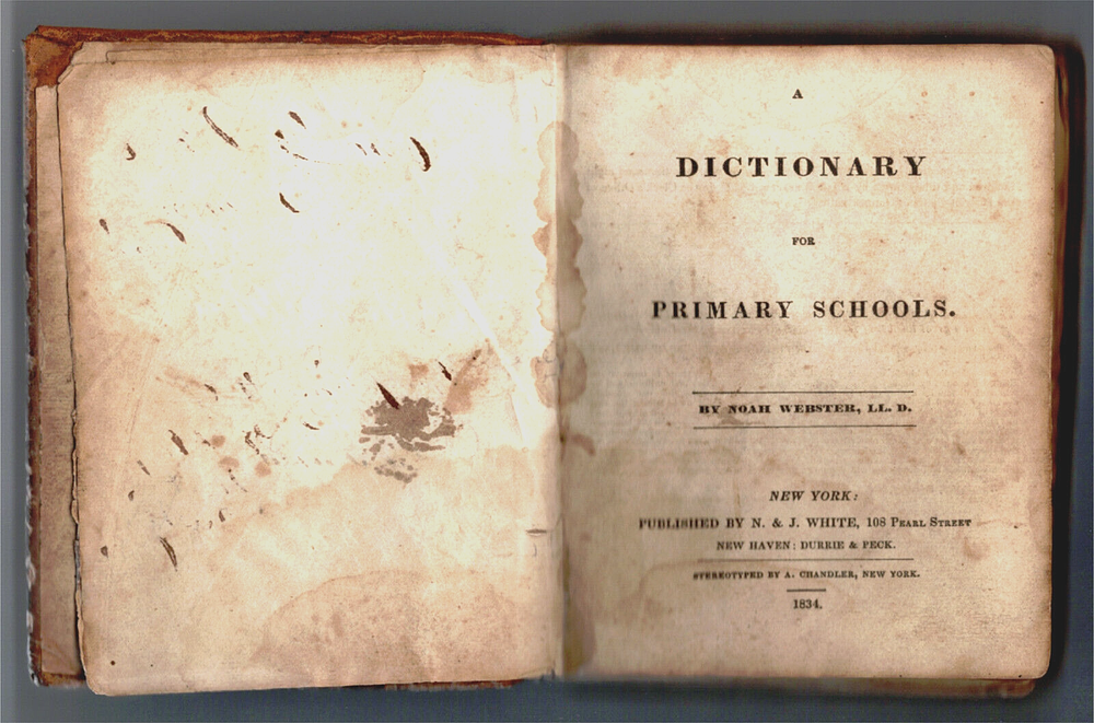 A Dictionary for Primary Schools, by Noah Webster, LL.D., published by N. & J. White, New York, NY, stereotyped by A. Chandler, New York, NY, 1834 — 341 pages — not illustrated — measures: 4 5/16" x 5 3/8" x 1 1/16" — leather bound Contents: Rules for Spelling Directions Abbreviations Key A Dictionary of the English Language touts