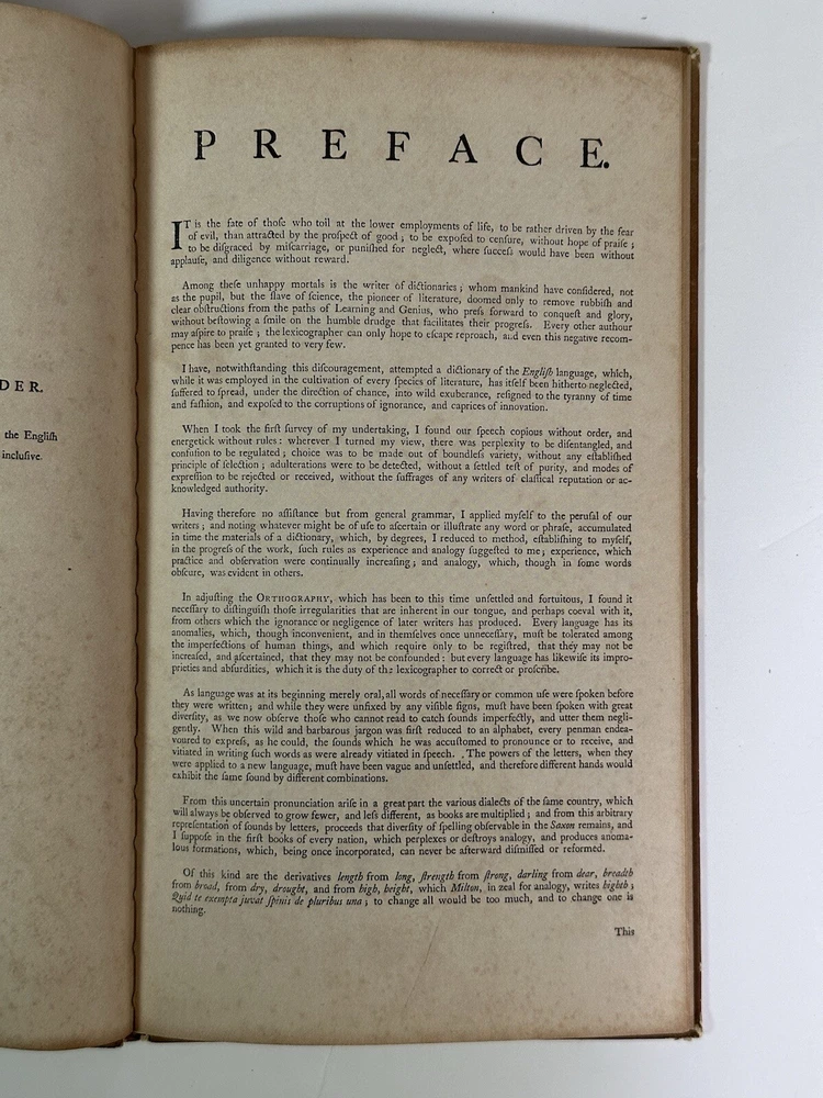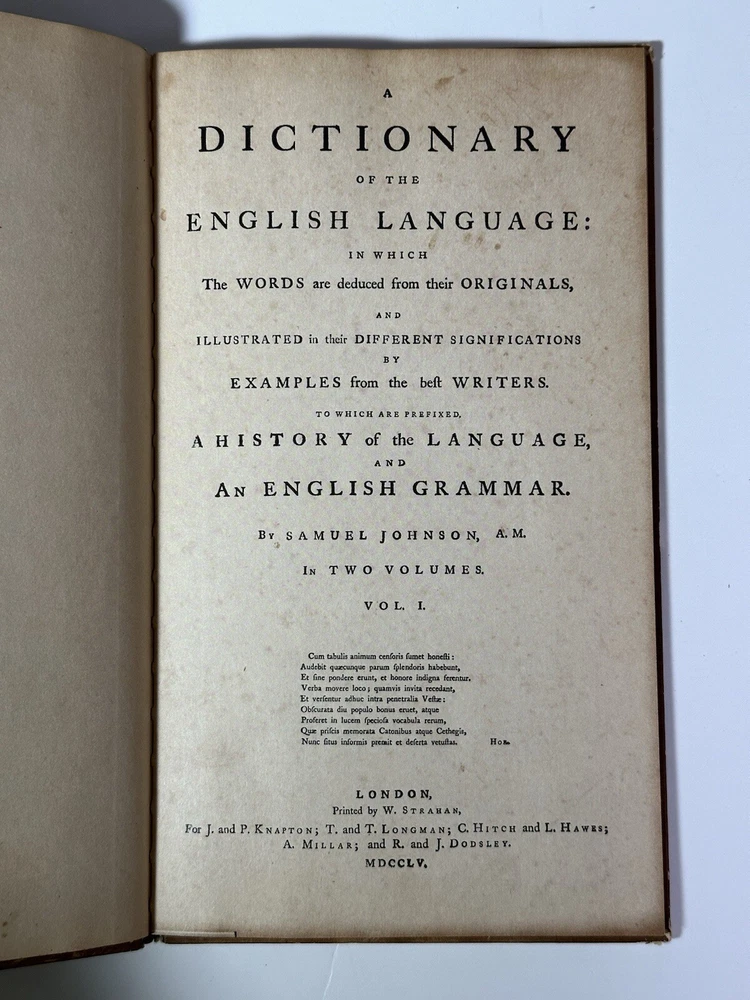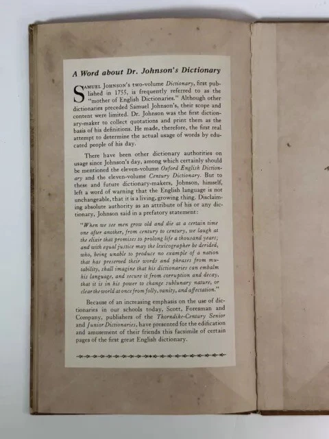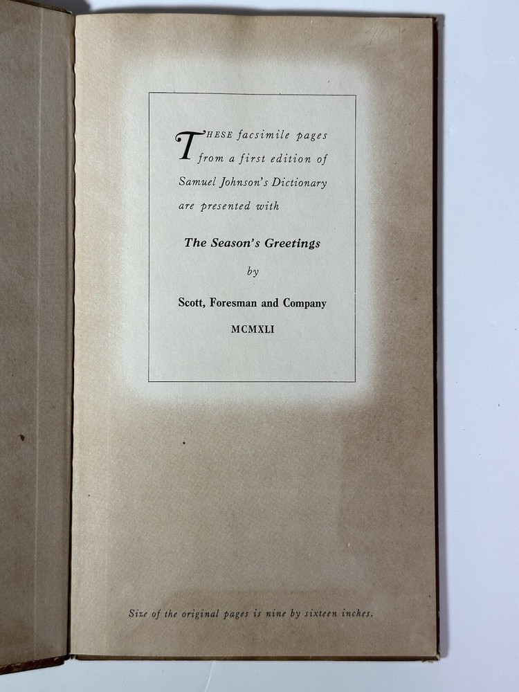 📚 Calling All Lovers of Language, History Buffs, and Collectors! 📚 Up for auction is a 1941 facsimile edition of Samuel Johnson’s A Dictionary of the English Language , presented by Scott, Foresman and Company . This unique facsimile reproduces selected pages from the groundbreaking 1755 first edition. Originally distributed as a seasonal gift, it reflects both Johnson’s literary brilliance and Scott, Foresman’s educational mission during the early 20th century. Why It’s Special: 📖 Facsimile from the Original 1755 Edition : Samuel Johnson’s dictionary was the first comprehensive dictionary of the English language, and this 1941 facsimile offers a glimpse into the original—pages filled with wit, wisdom, and the building blocks of the modern English lexicon. 🎄 Seasonal Gift Edition : Distributed during the holiday season by Scott, Foresman & Co. , this facsimile was more than a book—it was a gesture of goodwill toward educators, libraries, and clients. 📏 Educational & Historical Significance : Johnson’s original dictionary shaped the development of dictionaries worldwide, and Scott, Foresman’s 1941 release reinforces their commitment to education during an era of cultural preservation, even in the midst of WWII. Perfect For: 📚 Book Collectors & Language Enthusiasts : A rare piece of literary and educational history, this facsimile bridges the gap between the 18th and 20th centuries. 🎓 Educators & Scholars : Perfect for exploring the roots of English lexicography and understanding the cultural value of dictionaries in education. 🎁 A Unique Gift : Know someone who loves quirky literary artifacts? This seasonal gift from 1941, with its historical charm, is sure to impress. 🏛️ Librarians & Archivists : This piece makes an excellent addition to libraries, especially collections focusing on dictionaries, 20th-century education, or promotional publishing. Fun Fact : Samuel Johnson’s original dictionary took over seven years to complete and included witty, often subjective definitions. His entry for “oats” famously read: “A grain, which in England is generally given to horses, but in Scotland supports the people.” Condition : The cover shows spotting and light wear , typical of a book this age, but the internal pages are well-preserved and intact—offering a clean, readable glimpse into the 1755 original. A rare opportunity to own this historical bridge between two eras of educational publishing! Shipping : Carefully packed to ensure safe arrival and preservation of this piece of publishing history. Questions?: I’m happy to answer any additional inquiries or provide more details about this unique facsimile. 📖 Buy Now! 📖 Add this rare 1941 facsimile edition to your collection and celebrate the power of language and education!