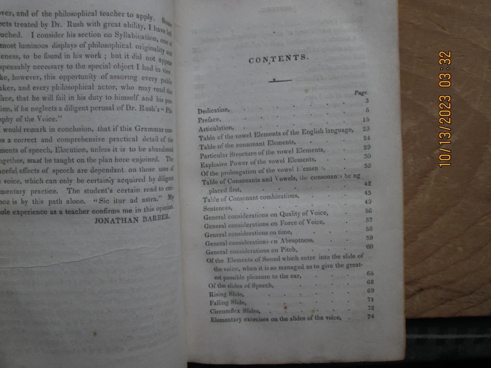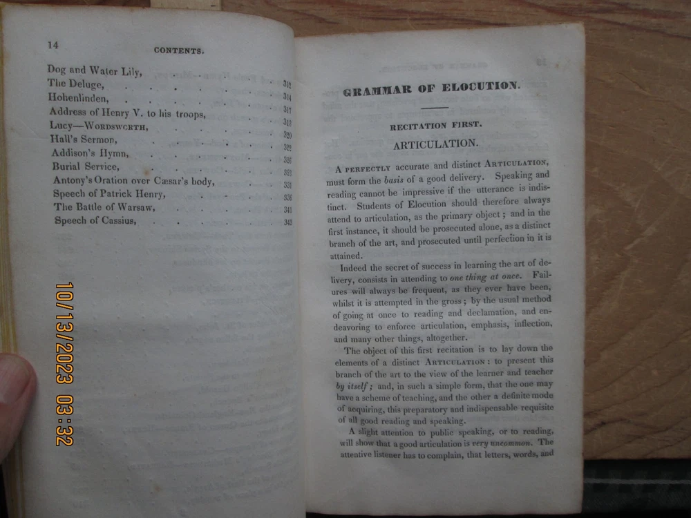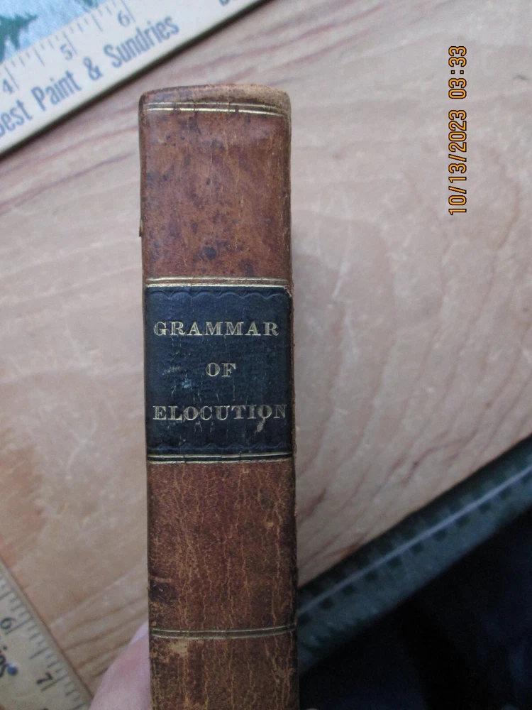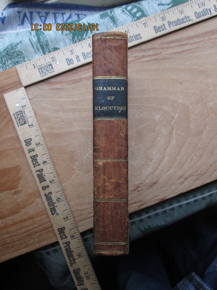 A Grammar of Elocution the Principles of the Arts of Reading & Speaking - jonathan barber 1832 , 346 pp. Previous owners name,Cover - ,Worn, light fading and soiling, pages Light soiling and light foxing ,Page Edges toned with age , and bumped corners ,. Interior endpapers some foxing and browning, please review the pictures carefully - z2z 3b