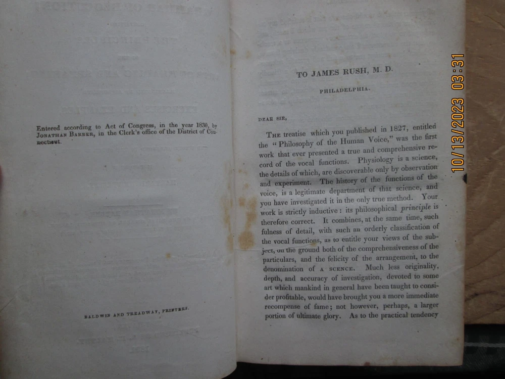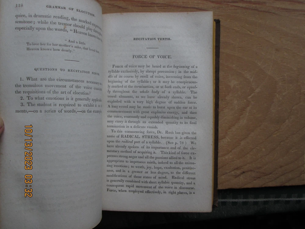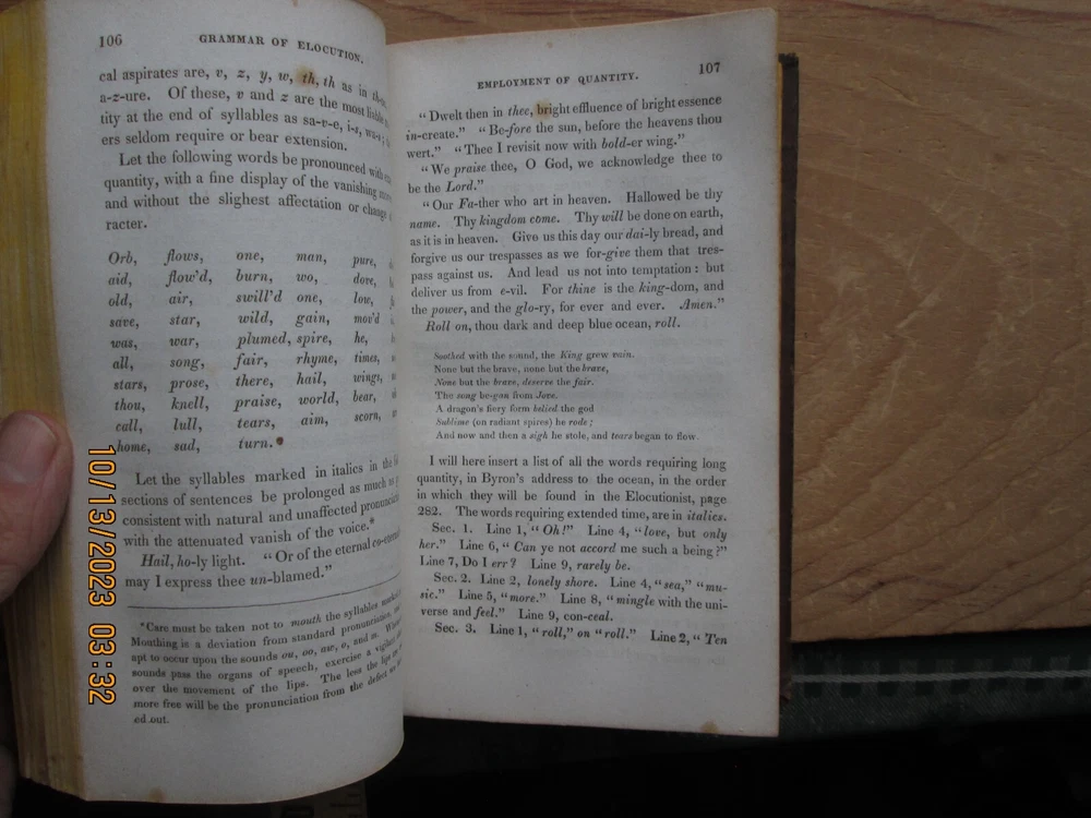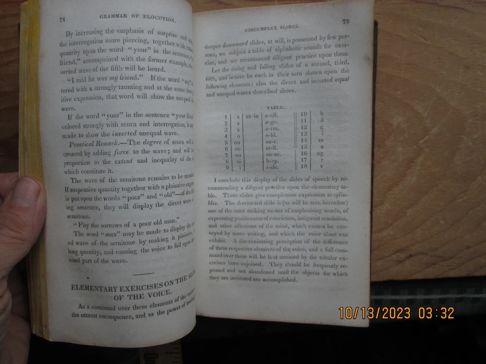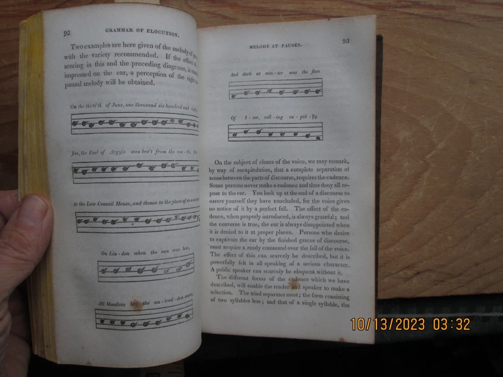 A Grammar of Elocution the Principles of the Arts of Reading & Speaking - jonathan barber 1832 , 346 pp. Previous owners name,Cover - ,Worn, light fading and soiling, pages Light soiling and light foxing ,Page Edges toned with age , and bumped corners ,. Interior endpapers some foxing and browning, please review the pictures carefully - z2z 3b