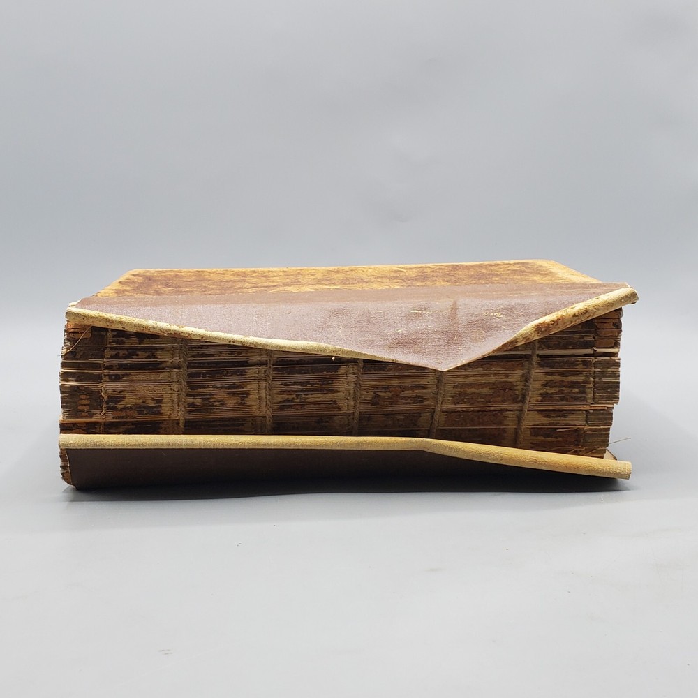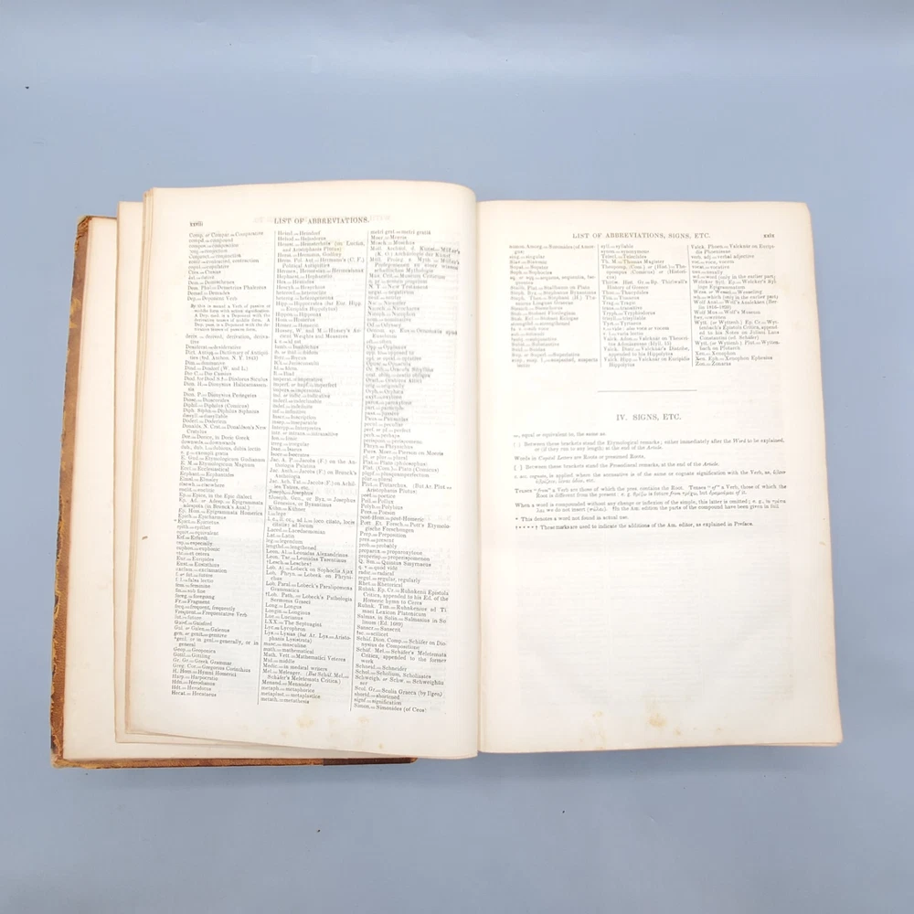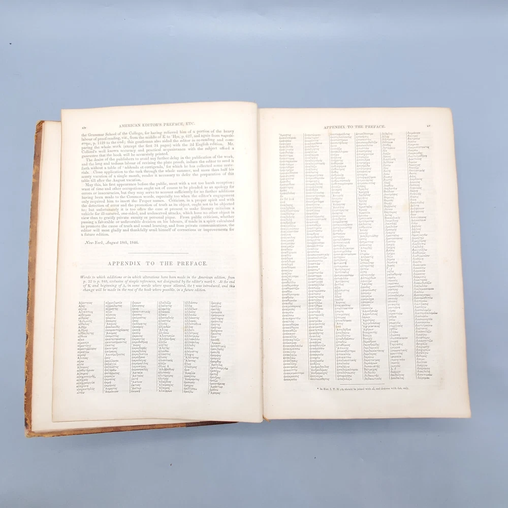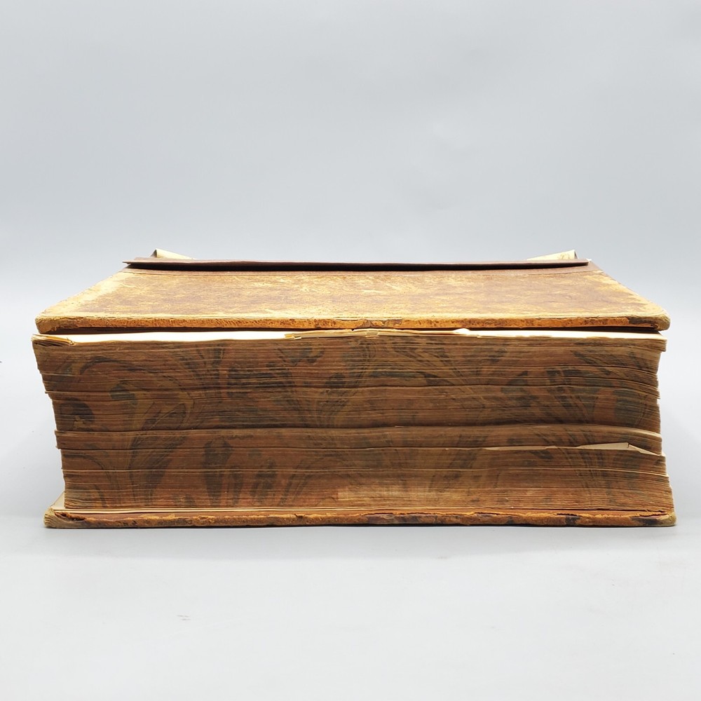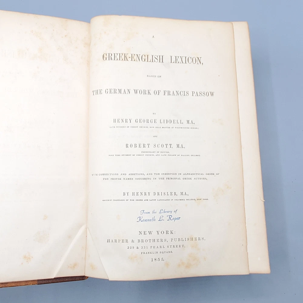 We’re offering A Greek-English Lexicon Based on The German Work of Francis Passow by Henry George Liddell and Robert Scott with Corrections and Additions, and the Insertion In Alphabetical Order of the Proper Names Occuring in the Principal Greek Authors by Henry Drisler. Published 1855 by Harper & Brothers, Publishers, New York, this book features full leather binding with marbled page edges, and advertisements on endpapers. This book measures apx. 7 x 10 1/4 in. (WxL) and contains 1705pp. Poor condition (see full description and photos). Clear text; spine missing and tape peeled off but covers attached to each other with spine banding, binding detached with sections separated (see photo); clean interior; front matter through copyright page attached to front cover but detached from rest of sections and all pages appear to be present; toning, scattered foxing, and stains due to age with large dark stains on top and bottom page edges; significant edge and spine wear with missing spine and exposed bands; covers heavily soiled, scuffed, and faded with tape on covers; corners bumped, peeling, and chipped; writing on front flyleaf. (See photos) The book is a wreck; however, with all pages present, the contents may be worth rebinding. Combined shipping for multiple purchases. Please review the photos and description. Email us with any questions you have BEFORE you purchase. We offer a 30-day money-back GUARANTEE. Please email us with questions BEFORE you return any item. Be sure to visit Bees Book Collective Ebay Store for more great items!