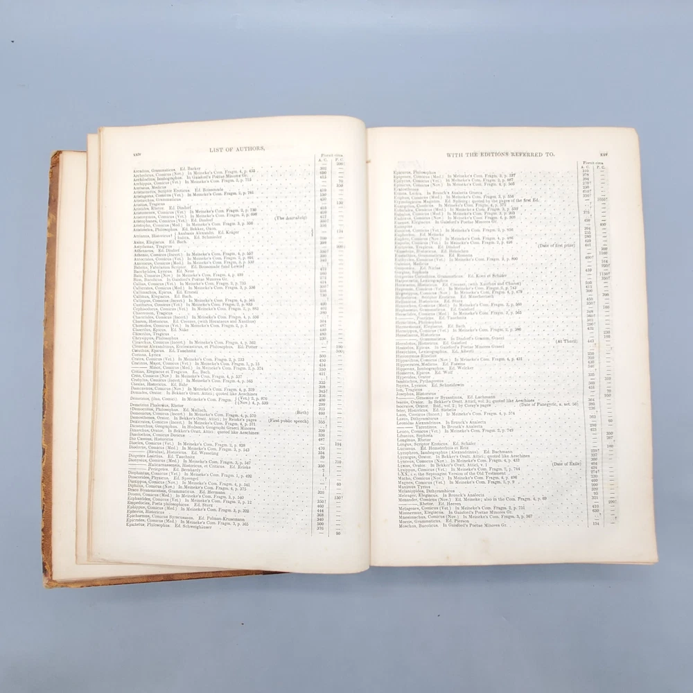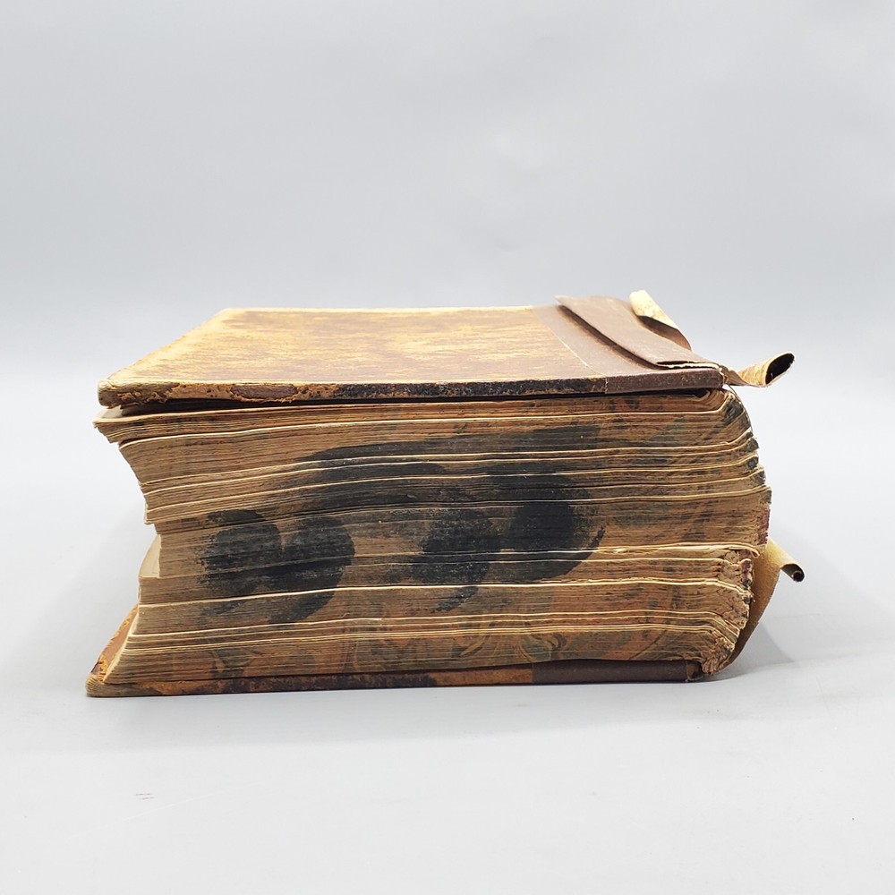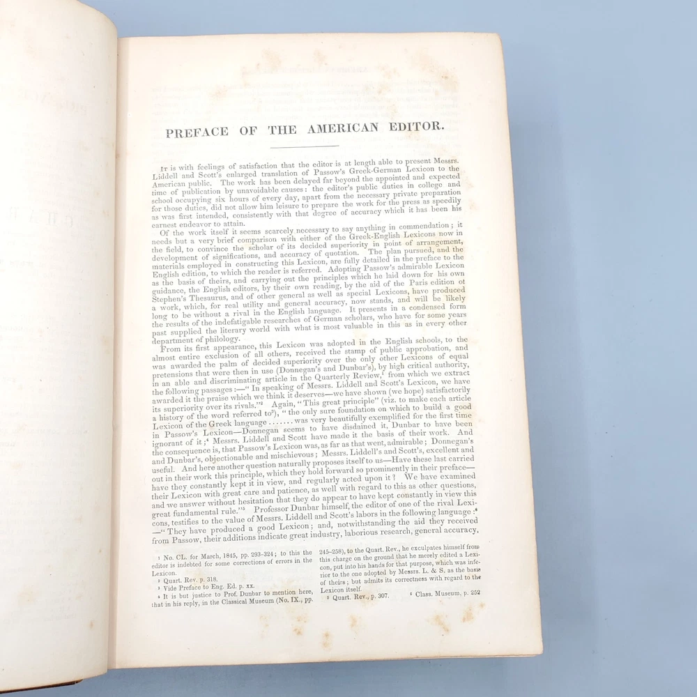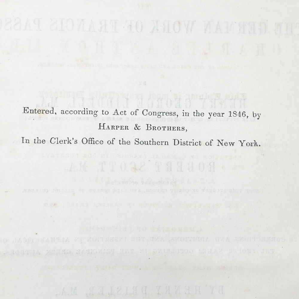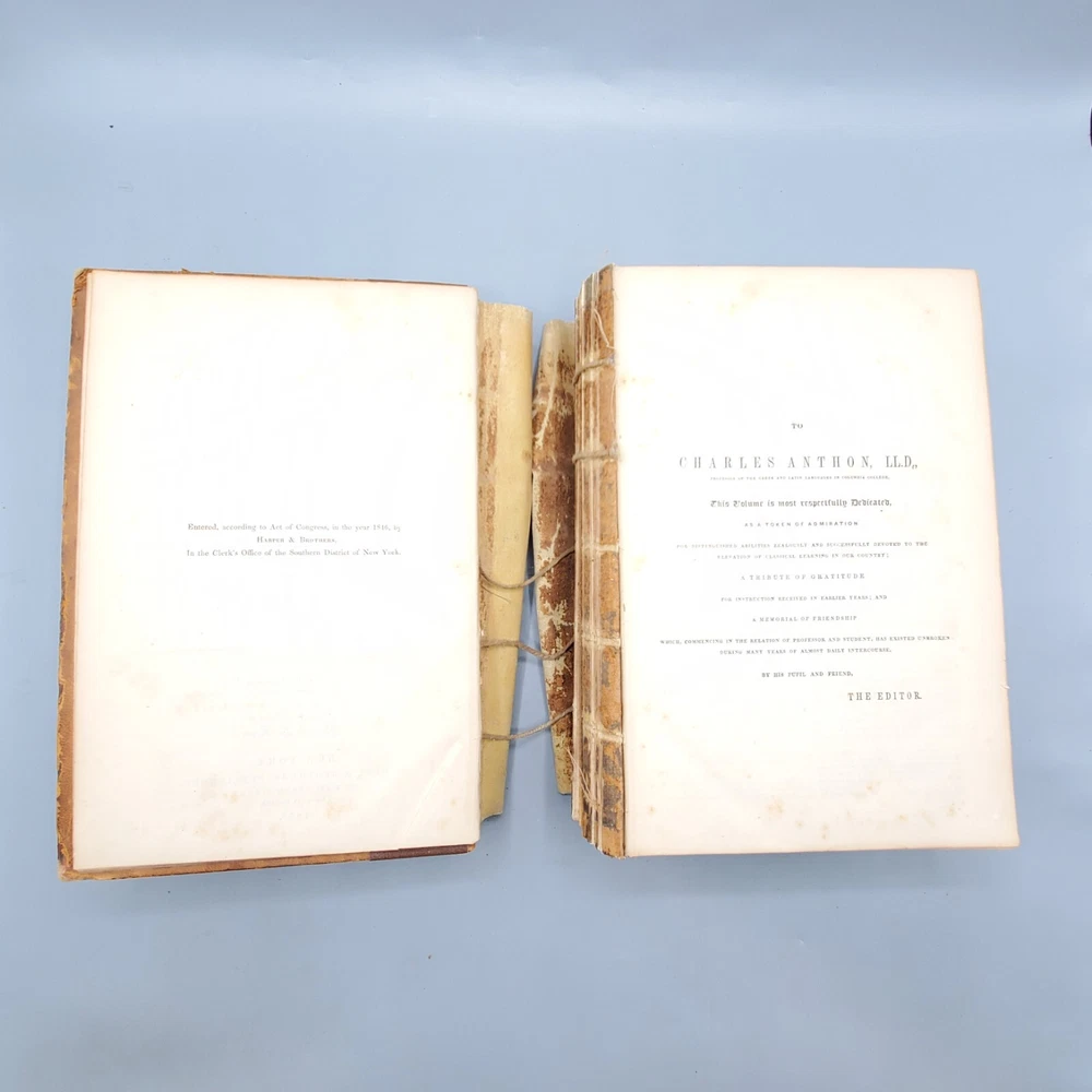 We’re offering A Greek-English Lexicon Based on The German Work of Francis Passow by Henry George Liddell and Robert Scott with Corrections and Additions, and the Insertion In Alphabetical Order of the Proper Names Occuring in the Principal Greek Authors by Henry Drisler. Published 1855 by Harper & Brothers, Publishers, New York, this book features full leather binding with marbled page edges, and advertisements on endpapers. This book measures apx. 7 x 10 1/4 in. (WxL) and contains 1705pp. Poor condition (see full description and photos). Clear text; spine missing and tape peeled off but covers attached to each other with spine banding, binding detached with sections separated (see photo); clean interior; front matter through copyright page attached to front cover but detached from rest of sections and all pages appear to be present; toning, scattered foxing, and stains due to age with large dark stains on top and bottom page edges; significant edge and spine wear with missing spine and exposed bands; covers heavily soiled, scuffed, and faded with tape on covers; corners bumped, peeling, and chipped; writing on front flyleaf. (See photos) The book is a wreck; however, with all pages present, the contents may be worth rebinding. Combined shipping for multiple purchases. Please review the photos and description. Email us with any questions you have BEFORE you purchase. We offer a 30-day money-back GUARANTEE. Please email us with questions BEFORE you return any item. Be sure to visit Bees Book Collective Ebay Store for more great items!