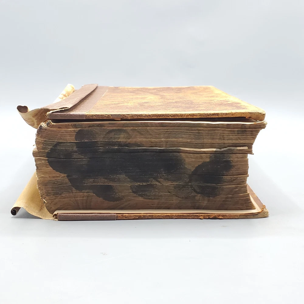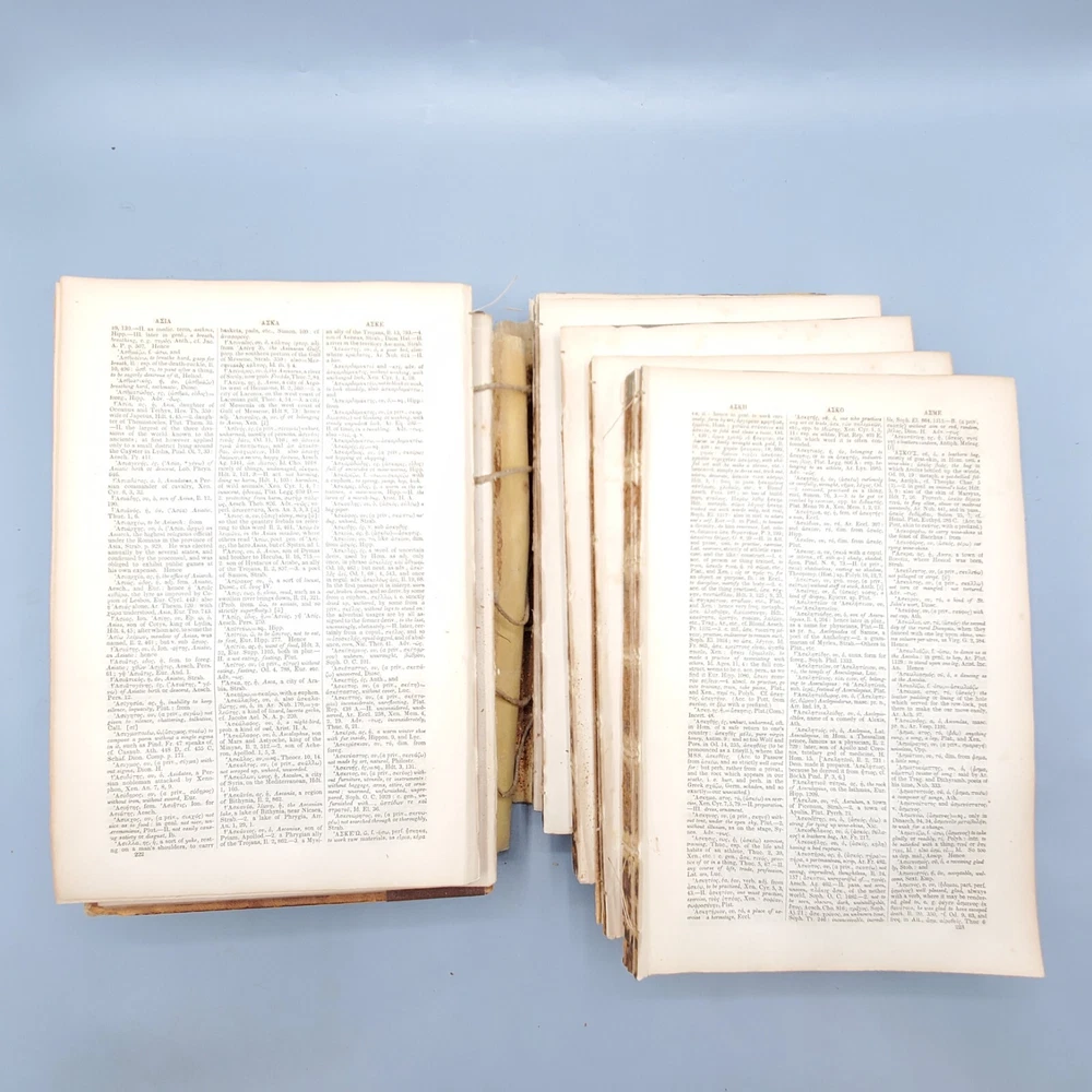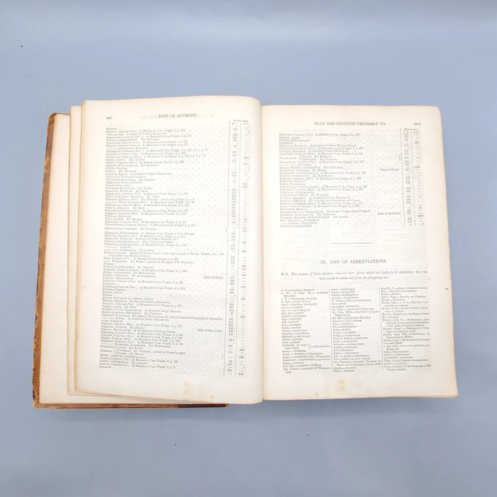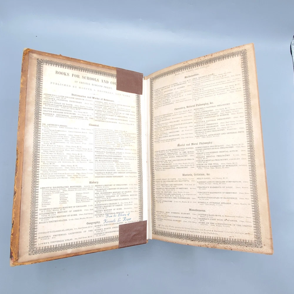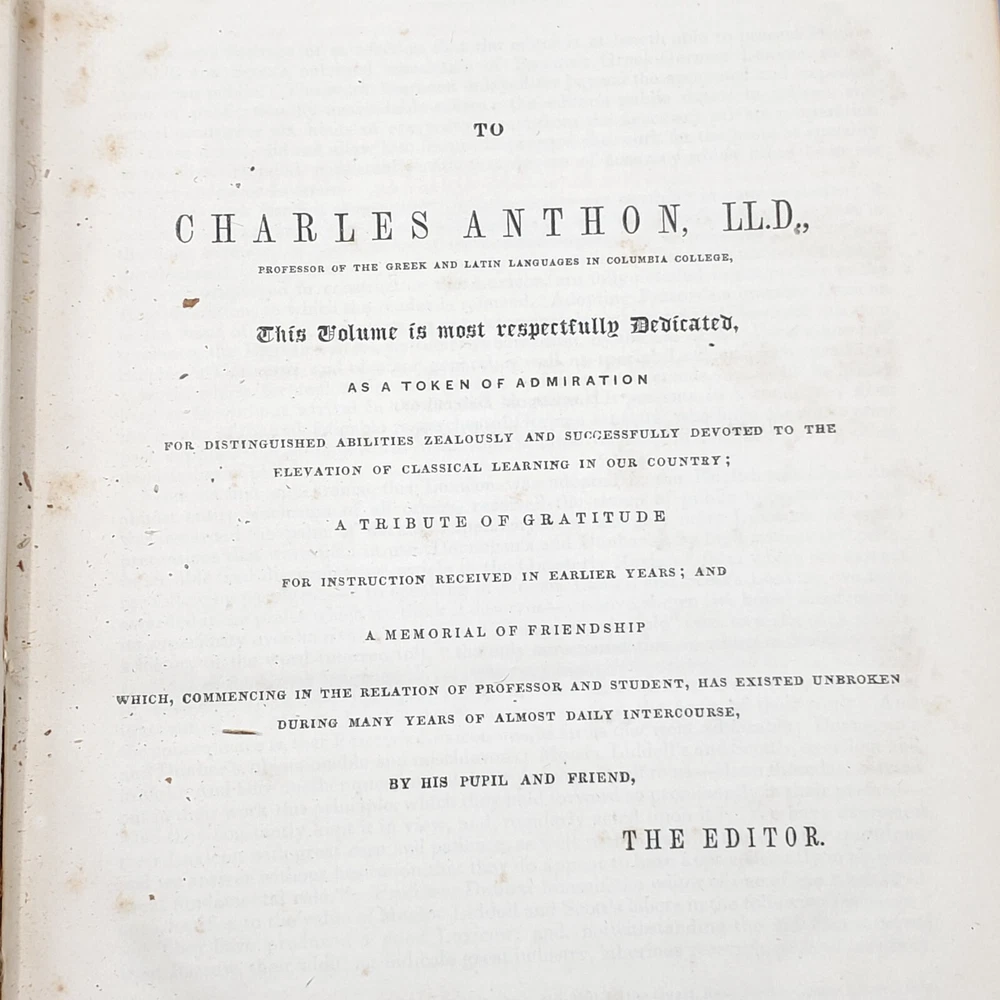 We’re offering A Greek-English Lexicon Based on The German Work of Francis Passow by Henry George Liddell and Robert Scott with Corrections and Additions, and the Insertion In Alphabetical Order of the Proper Names Occuring in the Principal Greek Authors by Henry Drisler. Published 1855 by Harper & Brothers, Publishers, New York, this book features full leather binding with marbled page edges, and advertisements on endpapers. This book measures apx. 7 x 10 1/4 in. (WxL) and contains 1705pp. Poor condition (see full description and photos). Clear text; spine missing and tape peeled off but covers attached to each other with spine banding, binding detached with sections separated (see photo); clean interior; front matter through copyright page attached to front cover but detached from rest of sections and all pages appear to be present; toning, scattered foxing, and stains due to age with large dark stains on top and bottom page edges; significant edge and spine wear with missing spine and exposed bands; covers heavily soiled, scuffed, and faded with tape on covers; corners bumped, peeling, and chipped; writing on front flyleaf. (See photos) The book is a wreck; however, with all pages present, the contents may be worth rebinding. Combined shipping for multiple purchases. Please review the photos and description. Email us with any questions you have BEFORE you purchase. We offer a 30-day money-back GUARANTEE. Please email us with questions BEFORE you return any item. Be sure to visit Bees Book Collective Ebay Store for more great items!