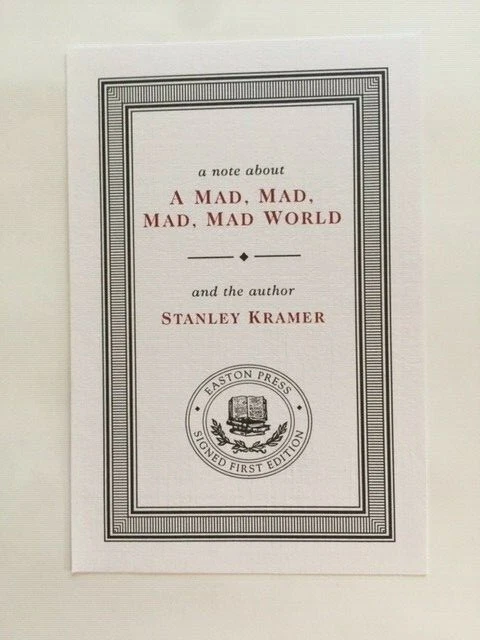 Stanley Kramer (with) Thomas M. Coffey. " A MAD, MAD. MAD, MAD WORLD ." Easten Press. Norwalk (1997) SIGNED limited edition. #320 OF 900 copies. Fine in slate blue leather with gilt binding, with gilt at edges, without dust jacket as issued. Includes publisher's SIGNED certificate of authenticity and separate note card. (Previous owner's embossed seal at rear of text on last page of index.)