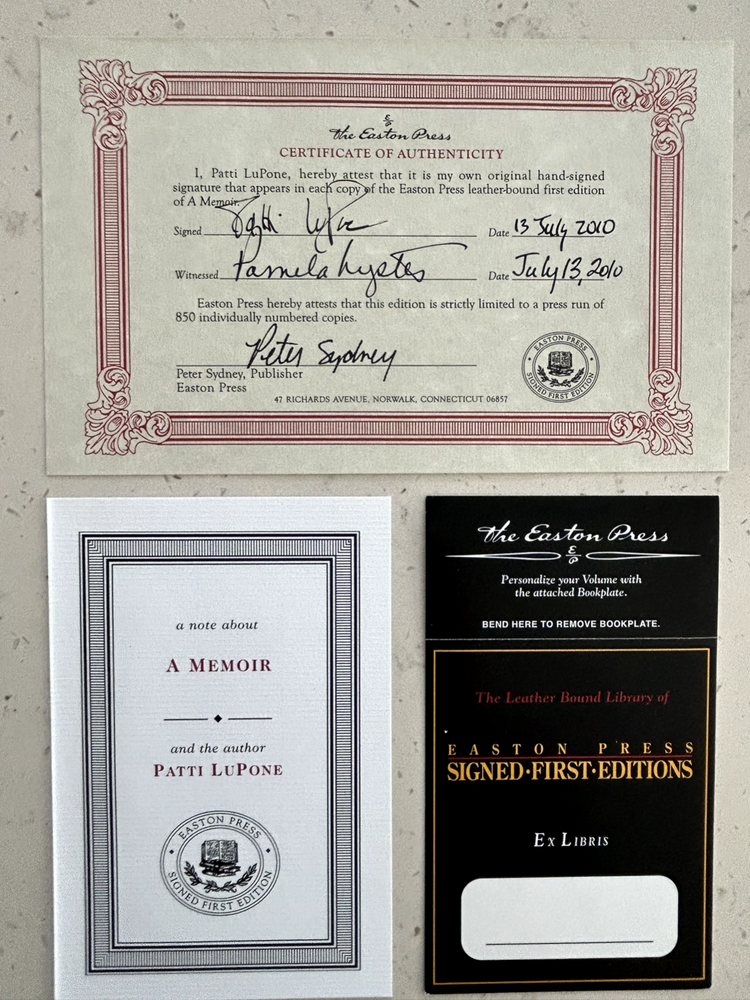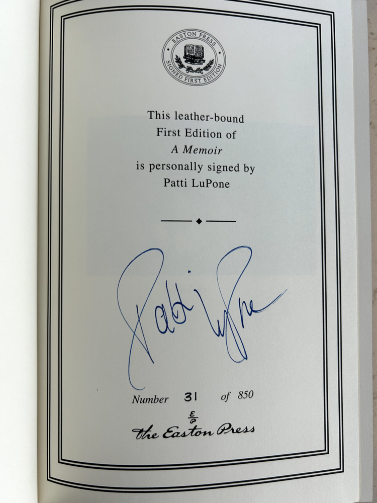 A Memoir by Patti LuPone Signed leather bound 1st edition with COA, numbered 31 of 850 Like New - book has not been read, no bent pages Easton Press "Signed First Editions" (2010) Bound in fine genuine leather with 22K gold page edges Archival quality acid-free paper Domestic shipping only Returns accepted within 30 days