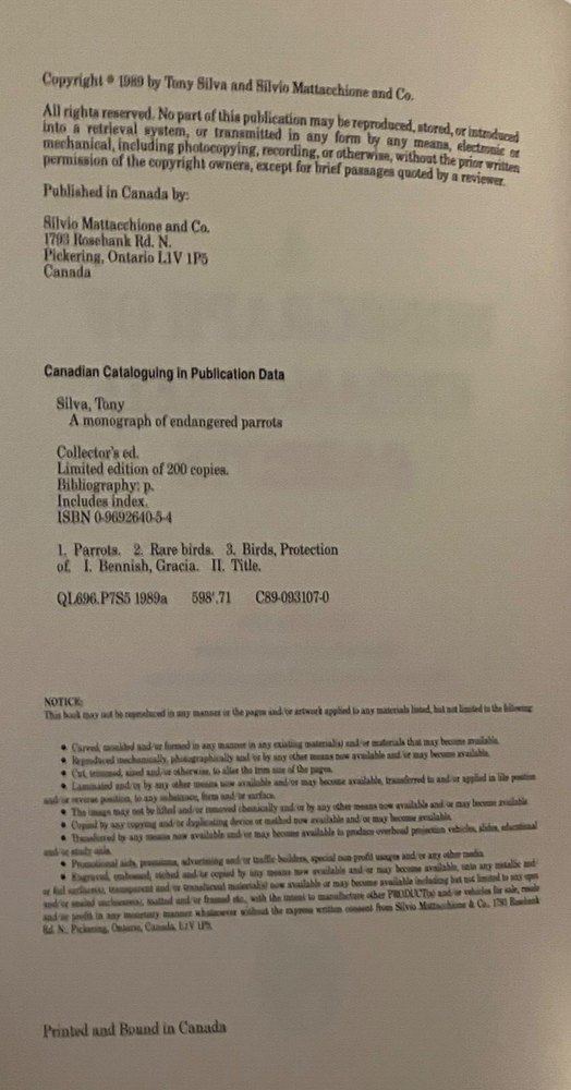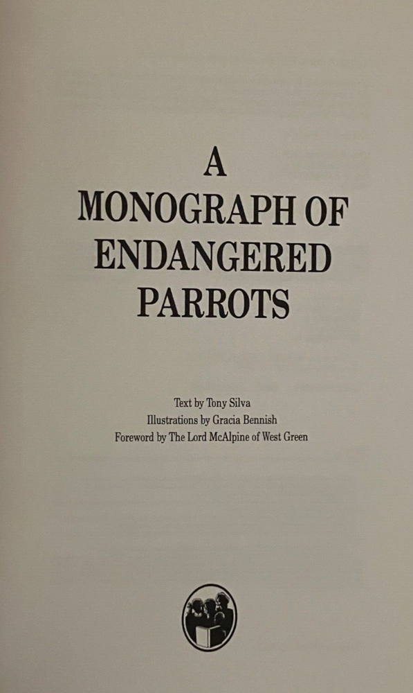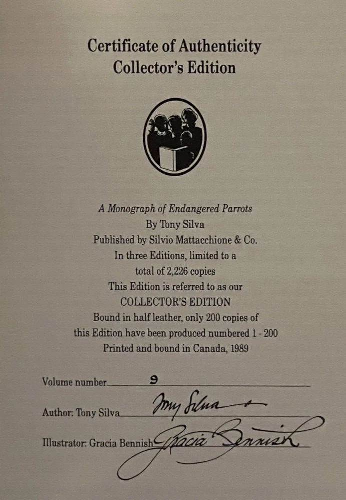 This Rare Collectors edition bound in half leather is number 9 of 200 signed by both the author and illustrations. The Cuban-born Silva is an expert on aviculture and parrots in particular. He was curator of birds at Loro Parque, Tenerife, Canary Islands when he penned this authoritative reference work, adorned with Gracia Bennish's soft imagery.