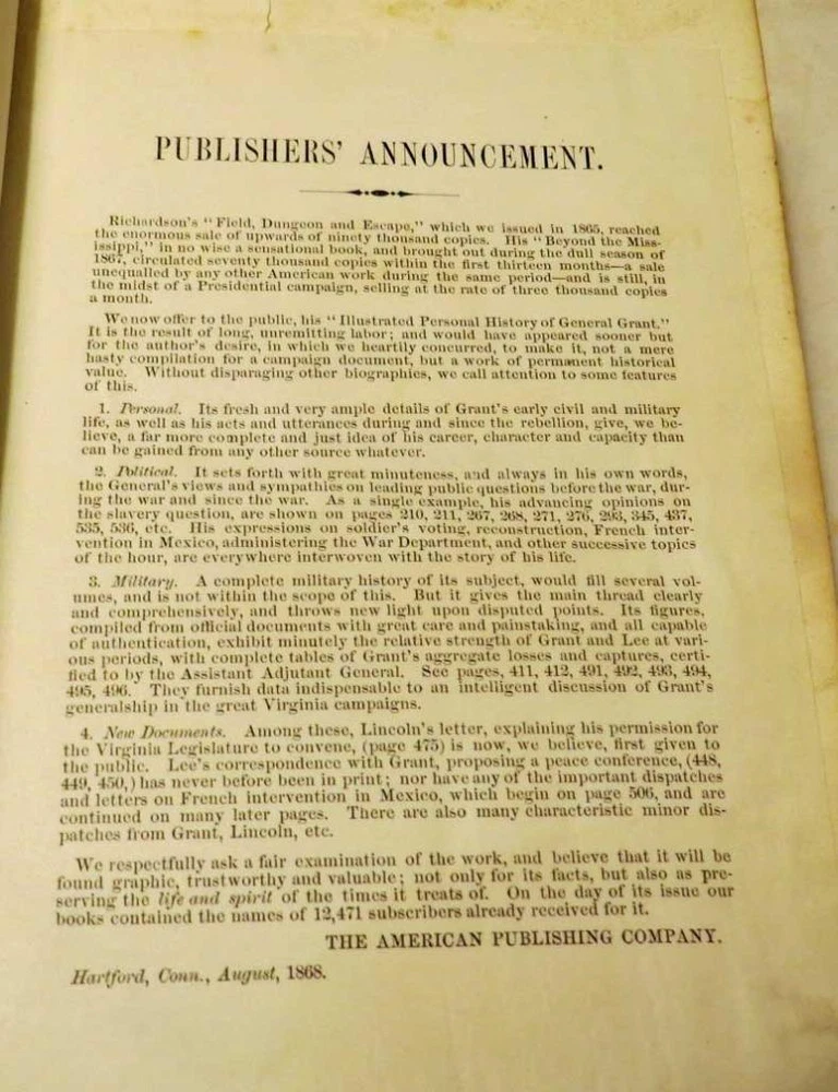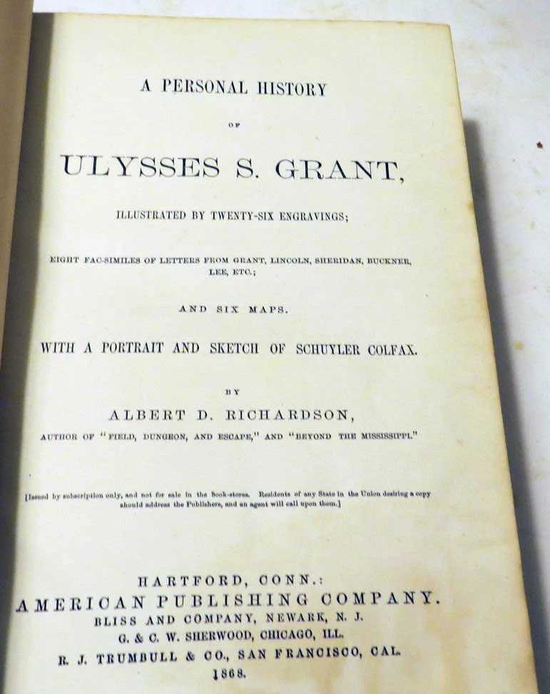 A Personal History of Ulysses S. Grant 1868 Book by A. Richardson A Personal History of Ulysses S. Grant 1868 Book by A. Richardson Description Topdog Presents: Always exciting stuff! Please click on the pictures to see more details. Up for sale is a scarce 1886 memorial edition of "A Personal History of Ulysses S. Grant" by Albert D. Richardson, printed in Hartford, Connecticut, by the American Publishing Company. This beautifully crafted volume is a detailed record of Grant's life, military achievements, presidency, and post-presidency, issued shortly after his death in 1885. Edition Details: Author: Albert D. Richardson Publisher: American Publishing Company, Hartford, Connecticut Publication Year: 1868 Format: 8vo, 9 x 6.25 inches, hardcover with leather binding and marble end pages. Page Count: 560 pages Features: Illustrated with 26 engravings , maps, and facsimiles of letters from Grant, Lincoln , and others. Originally written during Grant's 1868 presidential campaign, this edition was updated to include his post-presidency travels , illness , death , and memorial services . Condition: Overall good vintage condition for its age. Leather binding shows wear, including splits along the spine and light rubbing to the corners. The interior pages and engravings remain intact, with minimal foxing or discoloration. Please review the photos for specific details. This rare and richly illustrated edition is a perfect addition to collections of Civil War history , presidential biographies , or 19th-century American literature. .Please see the ph otos they are p art of the description. FLAT RATE S&H $10 in the US. Click images to enlarge Payment Payments We add $1 handling fees for every additional item in combined shipping. A total cost of a combined shipping will be calculated based on a combined parcel weight and current USPS shipping rates. Payments are due within 7 days of auctions close, no exceptions We accept PayPal . Shipping Shipping in the US WHEN: We try to ship in 2 days (excluding weekends and holidays). COURIER: USPS International Shipping WHEN: We try to ship the next day (excluding weekends and holidays) COURIER: USPS WHERE: We will ship Worldwide CUSTOMS FEES if any are buyers responsibility. Customs form will show total you paid by PayPal and price for your purchases. We always mark parcels as "used toys". Please do not ask us to low declared value, it defeats the whole idea of shipping fully insured parcel . If you are paying by PayPal parcels with a total value under $750 will be shipped by Registered Mail or First Class International (delivery time up to 4 weeks) or if they weight over 4 pounds will be shipped FULLY INSURED by Priority Mail (delivery time 6-14 days non guaranteed) over $750 will be shipped FULLY INSURED by Express Mail with a signature confirmation (delivery time 4-7 days) The International bidders might want to contact us about shipping cost prior to placing their bids. We will ship to the address listed in your eBay profile under "Shipping Details". It's buyers responsibility to provide a correct shipping address. All returned parcels because of " a wrong shipping address" parcels will be re-sent at the buyer's expense. Please do not ask us to ship to the address not listed in your eBay profile, we will not do it unless we know you from previous transactions. Postal Insurance All domestic parcels with a total over $50 (for Priority mail) and $25 (for First class and Parcel Select) will be insured: $1 per up to $100 of the total (for example if total is $256 , postal insurance will be $3) All International parcels will be insured (no exceptions): $2 per $100 of the total for example if total is $256 , postal insurance will be $6) Lost & Damaged Claims For lost parcels, you must wait for 21 days domestic (US) and 45 days for International shipments. For shipments to Italy , you must wait 60 days before filing. Damage claims can be filed immediately. All claims should be submitted within 90 days from the date of shipment. All International parcels will be insured with U-PIC, please do not file a "not received "claim with PayPal, just contact us to resolve your problem. Terms of Sale Refunds & Returns 100% Satisfaction Guarantee that the item is original and meets the detailed description! Returns to be made within 30 Days of Receipt (including the cases when parcel was hold at PO by buyer's request), after that a sale considered to be final. Buyer pays return shipping cost. If item was damaged in transit you should not return it. You should submit an insurance claim to get a compensation. Please do not send us back broken items. If you need an assistance with your claim please contact us. All returned items should have a tracking number and be fully insured. We reserve right to replace defective item or refund money (less S&H) Pickups We do not do any pickups. As Is If auction marked "AS IS", it means that Liquest Group Inc. shall not be responsible for the correct description, authenticity, genuineness of, or defect in any lots, and makes no warranty in connection therewith. As no warranty is given with any lot, therefore no sale is invalid or avoidable by reason of any fault in any lot or by reason of any lot being incorrectly described (in the ad), and no compensation may be paid for any such fault or error in description or any imperfection not noted. Get images that make Supersized seem small. Showcase your items with Auctiva's Listing Templates! THE simple solution for eBay sellers. Track Page Views With Auctiva's Counter