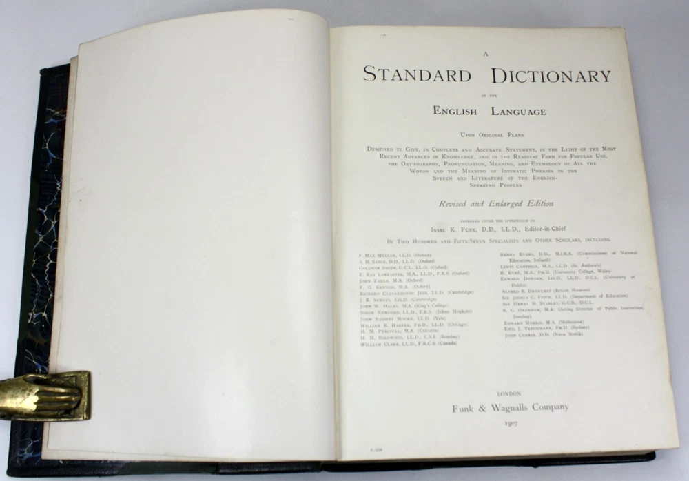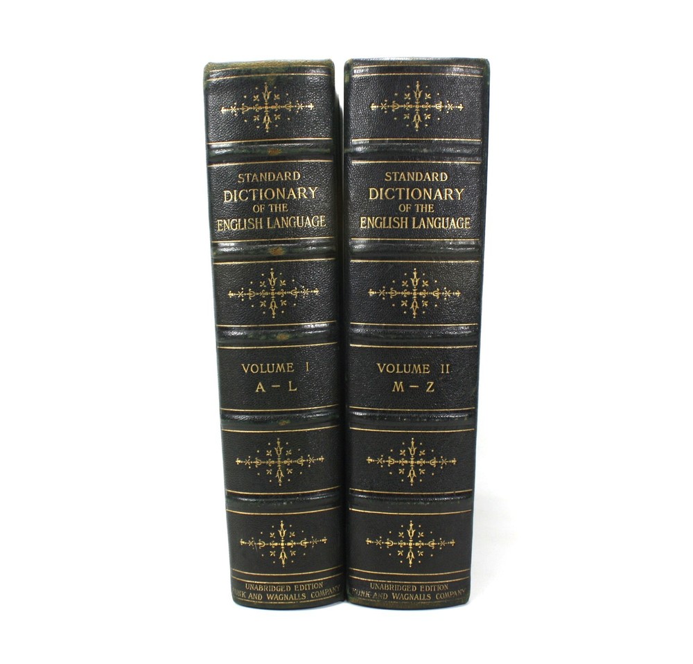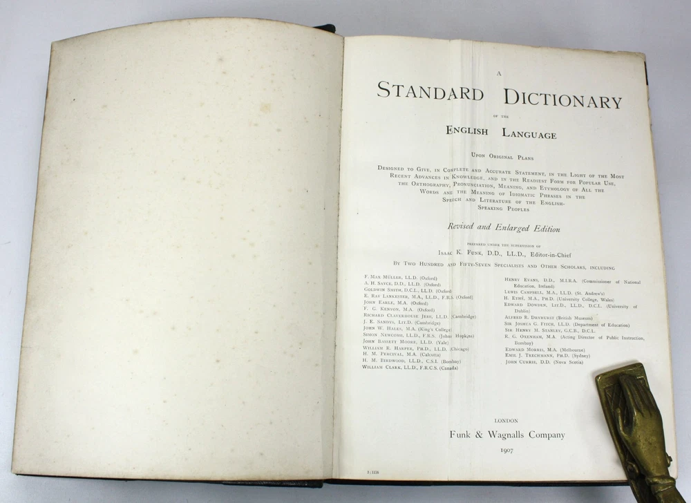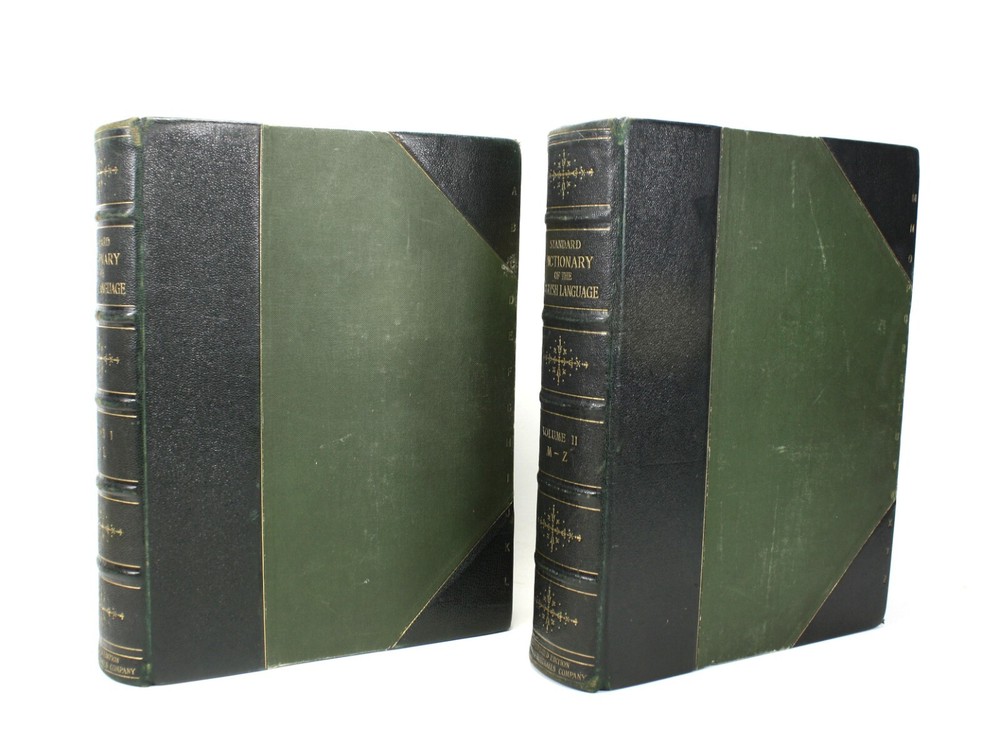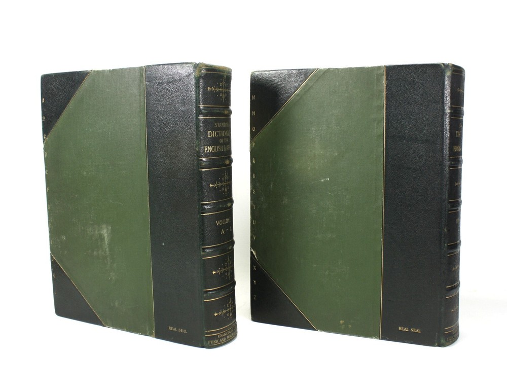 A Standard Dictionary of the English Language, upon original plans; designed to give, in complete and accurate statement, in the light of the most recent advances in knowledge, and in the readiest form for popular use, the orthography, pronunciation, meaning, and etymology of all the words and the meaning of idiomatic phrases in the speech and literature of the English-speaking peoples. Revised and Enlarged Edition. Prepared under the supervision of Isaac K. Funk, D.D., LL.D., Editor-in-Chief, by more than two hundred and fifty-seven specialists and other scholars. 2 volumes complete. Published by Funk & Wagnalls Company, London, 1907. A very good set of 2 very substantial volumes (complete). Hardbacks with leather spine and corners. Gilt decoration and raised bands. Some scuffing and bumping and wear to extremities, but all soundly bound. Marbled endpapers with green cloth strengthening to inner hinges (presumably as issued, given the weight of these books). Edges are marbled, and have index cutaways. Well illustrated throughout, with fine colour plates with tissue guards. A few spots to blank endpapers, but text is bright and clean throughout, and plates are impressive. Occasional page flaw - crease to final text page with small nibble at foot of page, and crease to final endpaper. Crease to title page of Vol. II. Text in English. Volume I (A-L); v + 1060pp + Plates and tissue guards+ lxxvi Colour Atlas Plates + lxxvii-clv Atlas text + 3pp 'The Universal Calendar' + 4pp 'Facts and Distinguishing Features'; Volume II (M-Z); Title + 1061-2441pp + Plates and tissue guards. PLEASE NOTE: FOR ORDERS OUTSIDE THE UK, PLEASE CHECK POSTAGE PRICE WITH US FIRST AS IT MAY BE OVER THE STANDARD EBAY QUOTED RATE - DUE TO THE WEIGHT OF THE BOOKS. Dimensions: Each volume approximately 315mm high x 245mm wide x 75-80mm deep. Approximate weight: 9kg (the set-unpacked). PLEASE NOTE: FOR ORDERS OUTSIDE THE UK, PLEASE CHECK POSTAGE PRICE WITH US FIRST AS IT MAY BE OVER THE STANDARD EBAY QUOTED RATE - DUE TO THE WEIGHT OF THE BOOKS. A Standard Dictionary of the English Language, upon original plans; designed to give, in complete and accurate statement, in the light of the most recent advances in knowledge, and in the readiest form for popular use, the orthography, pronunciation, meaning, and etymology of all the words and the meaning of idiomatic phrases in the speech and literature of the English-speaking peoples. Revised and Enlarged Edition. Hardbacks with leather spine and corners. Gilt decoration and raised bands. Some scuffing and bumping and wear to extremities, but all soundly bound. Marbled endpapers with green cloth strengthening to inner hinges (presumably as issued, given the weight of these books). Edges are marbled, and have index cutaways. Well illustrated throughout, with fine colour plates with tissue Recommended products Provided by An Etymological Dictionary of The Scottish Language, John Jamieson, 1818 1st ab View item A Catalogue of English Prose Fiction mainly of the eighteenth century J.C. Hardy View item A Translation of the Inferno of Dante Alighieri in English Verse Henry Boyd 1785 View item The Royal Horticultural Society Dictionary of Gardening, Fred J. Chittenden 1951 View item A Short History of the English People, J.R. Green, Illustrated Edition 1892-1894 View item The Ion of Euripides, with A Translation into English Verse, A.W. Verrall, 1890 View item A Biographical Dictionary of Eminent Scotsmen, Robert Chambers, 1855, Vol V Supp View item The Story of Insect Life, W Percival Westell, 1907 Robert Culley London. illust View item