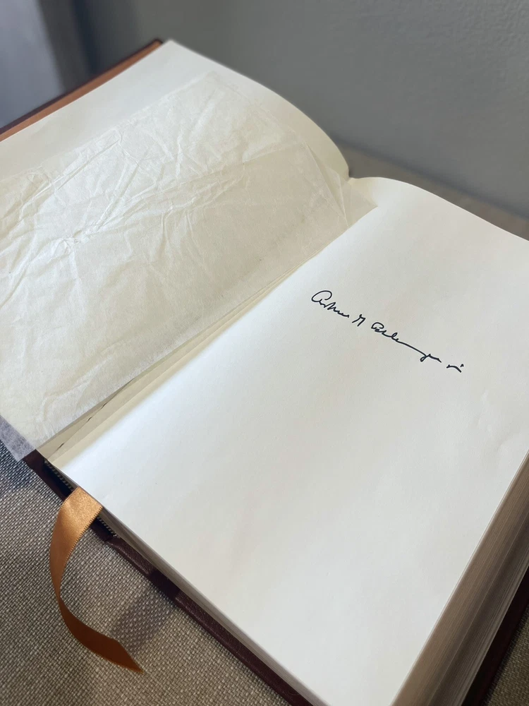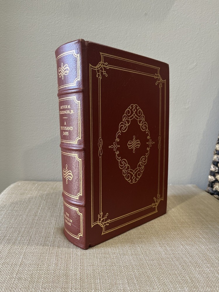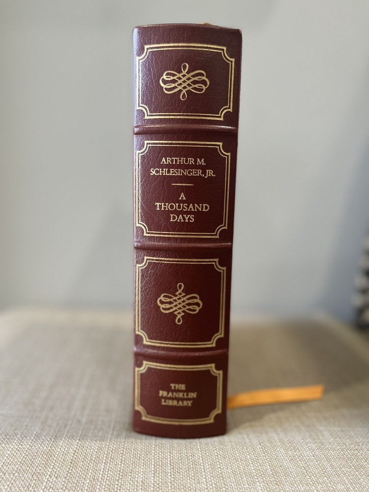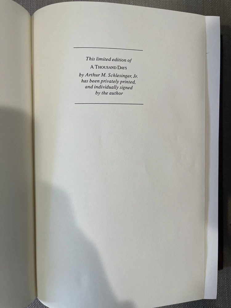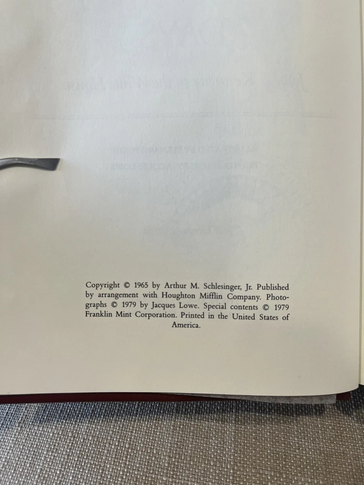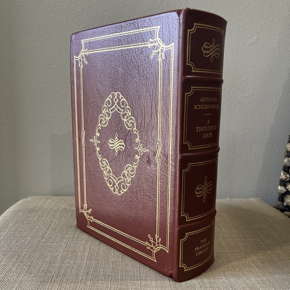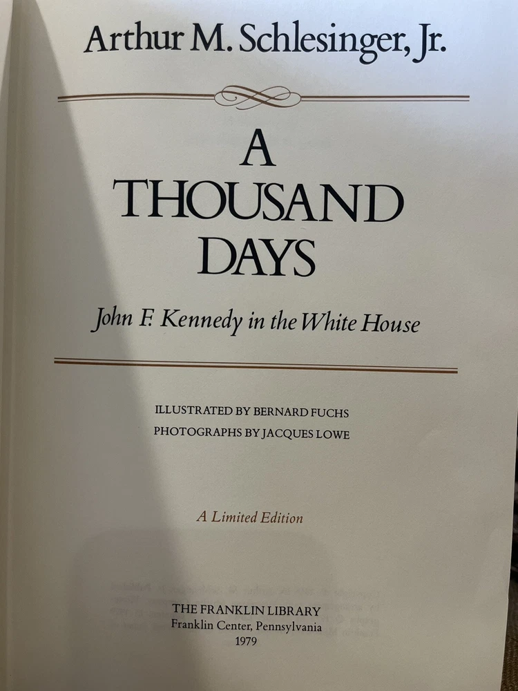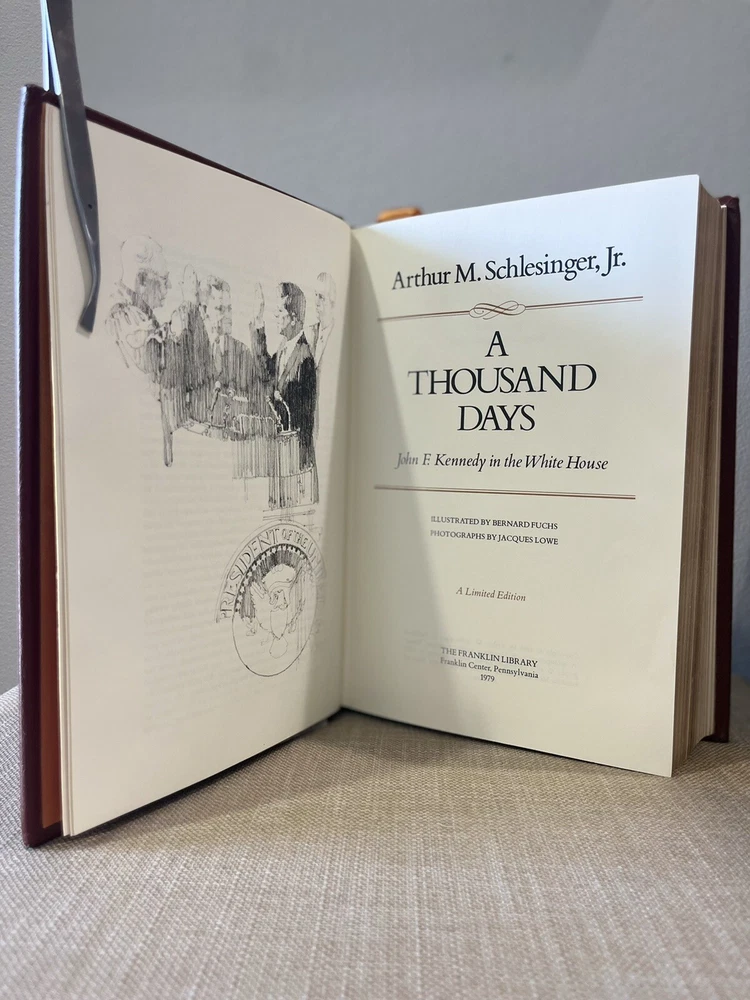 A THOUSAND DAYS Signed Arthur M Schlesinger Jr FRANKLIN LIBRARY Pennsylvania 1979. This beautiful limited edition of A THOUSAND DAYS by Arthur M. Schlesinger, Jr. has been privately printed, and individually signed by the author. Kept in pristine condition over the years. Hard cover. Condition: Very good. No jacket. Cover and inside pages are clean and unmarked. Gilt edge is smooth and shiny. Copyright © 1965 by Arthur M. Schlesinger, Jr. Published by arrangement with Houghton Mifflin Company. Photo- graphs © 1979 by Jacques Lowe. Special contents © 1979 Franklin Mint Corporation. Printed in the United States of America.