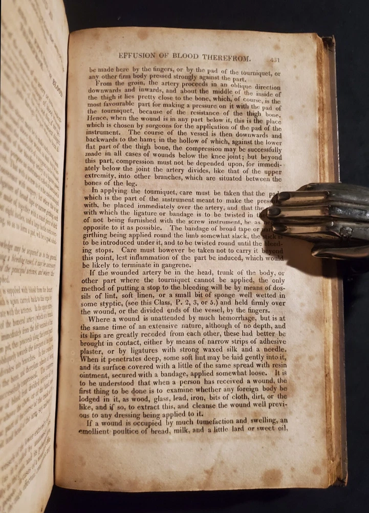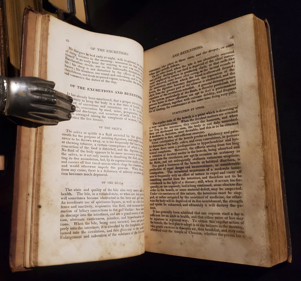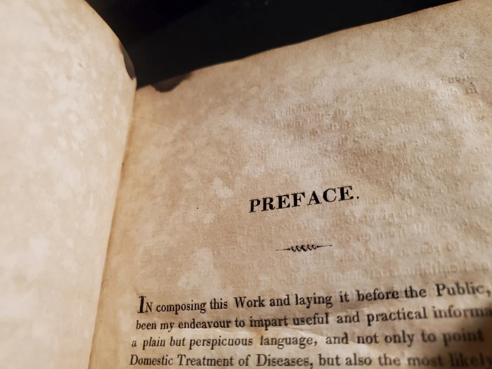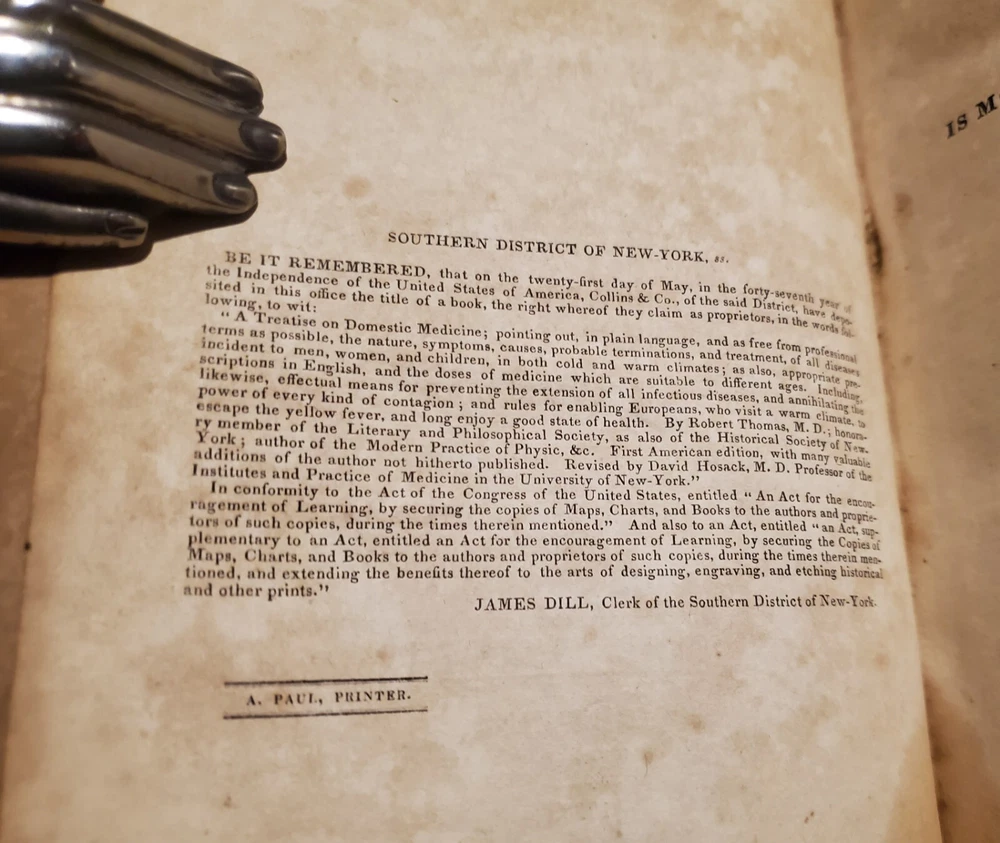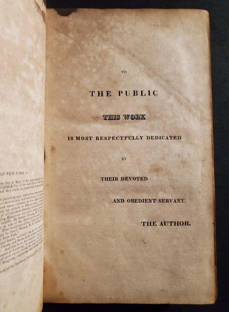A TREATISE ON DOMESTIC MEDICINE: Pointing Out, In Plain Language, and as free from Professional Terms as possible, the Nature, Symptoms, Causes, Probable Terminations, and Treatment of All Diseases incident to Men, Women, and Children. Also Appropriate Prescriptions in English. By Thomas, Robert. Published by Collins & Co. 1st edition printed in 1822, wrapped in publishers original full calf leather. Nicely preserved previous collectors copy. Interior pages clean and bright with some foxing and toning as shown. Some bumping to corners. Paste down missing to spine. Shelf wear, rubbing and bumping to boards and spine ends as shown. Binding and hinges are in good condition. Please see all of our listed photos. . . . . Sunrise Rare Books - We ship items world-wide, daily. - Each item is carefully stored and protected in our temperature controlled library. We securely pack each item tightly in cardboard boxes to ensure safe delivery. - Returns accepted within 30 days.
