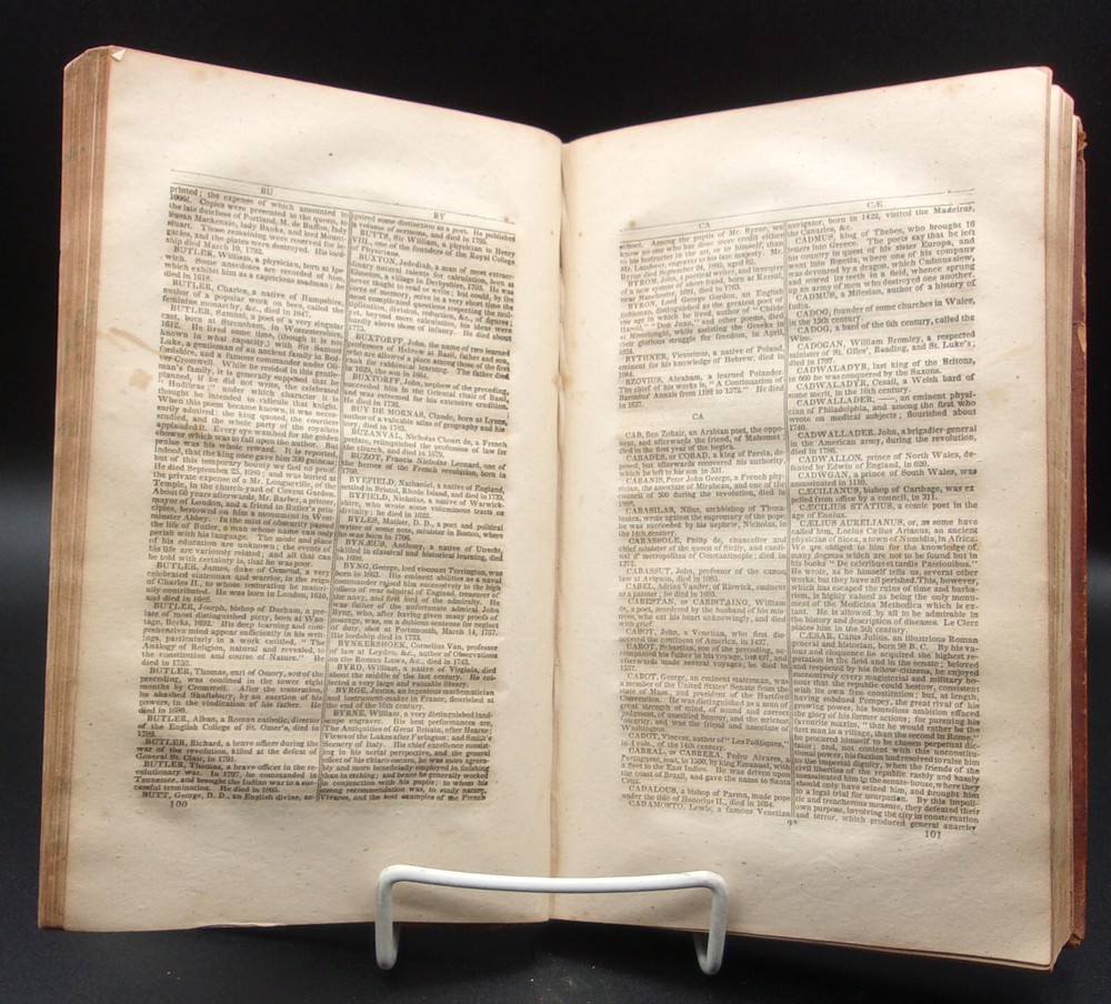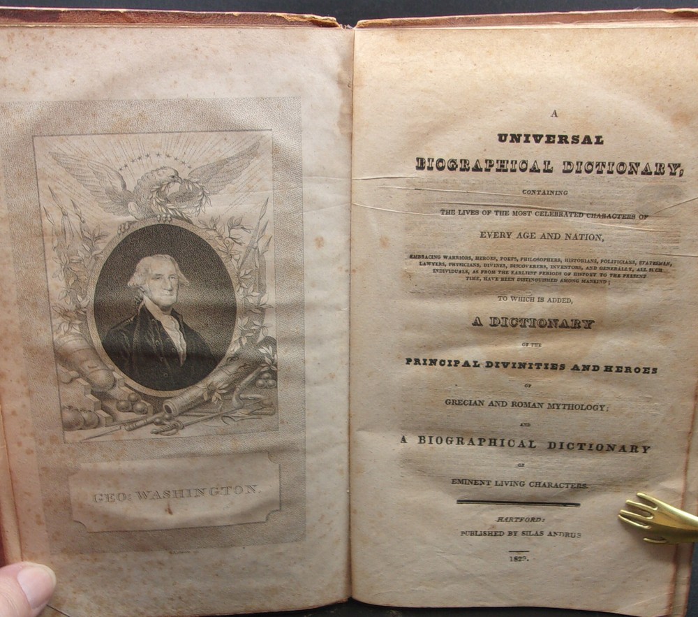 A Universal Biographical Dictionary, Containing the Lives of the Most Celebrated Characters of Every Age and Nation, To Which is Added a Dictionary of the Principal Divinities and Heroes From Grecian and Roman Mythology; and A Biographical Dictionary of Eminent Living Characters. By Charles N. Baldwin; abridged from Lempriere embracing every article. Hartford: Published by Silas Andrus, 1829. Bound in the publisher's original full brown leather; text fore-edges marbled. Covers show rubbed wear, light chipping to the spine, old repair to the upper spine with a tanned piece of leather, shelf edges and along the spine are a bit worn; outer front hinge has been repaired at some point, inner front hinge cracked but holding, heavy to light foxing throughout (with very light foxing to the text margins). A good copy with the text generally quite tight. Octavo. 444 pages. Frontispiece portrait of George Washington. PLEASE VIEW OUR STORE FOR MORE INTERESTING BOOKS THANKS!