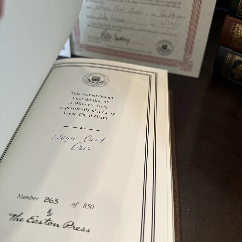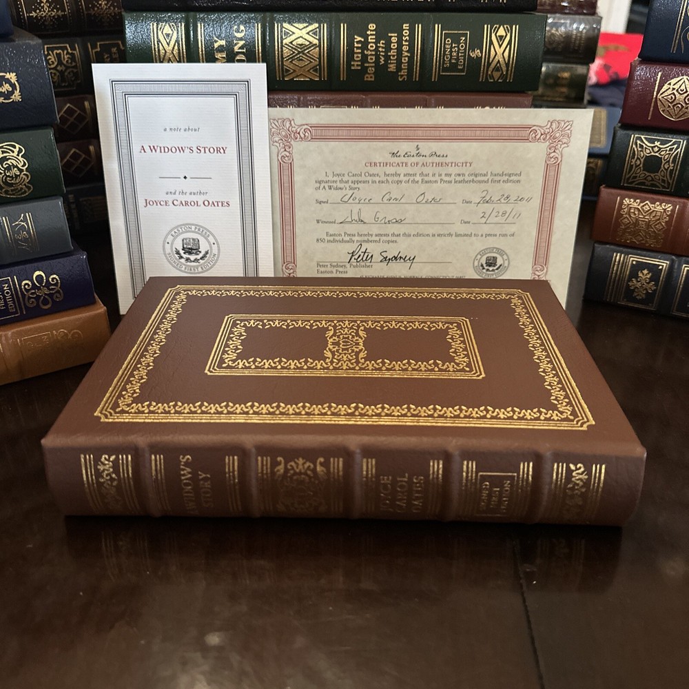 This is a collector's edition of the book "A Widow’s Story” by Joyce Carol Oates. It is a limited, first edition print that is signed by Joyce Carol Oates. The book, which is in great shape, is bound in leather and published by Easton Press and includes a certificate of authenticity. This book is marked number 263/850. Please see photos for exact condition and check my other listings for more unique and first edition Easton Press books.