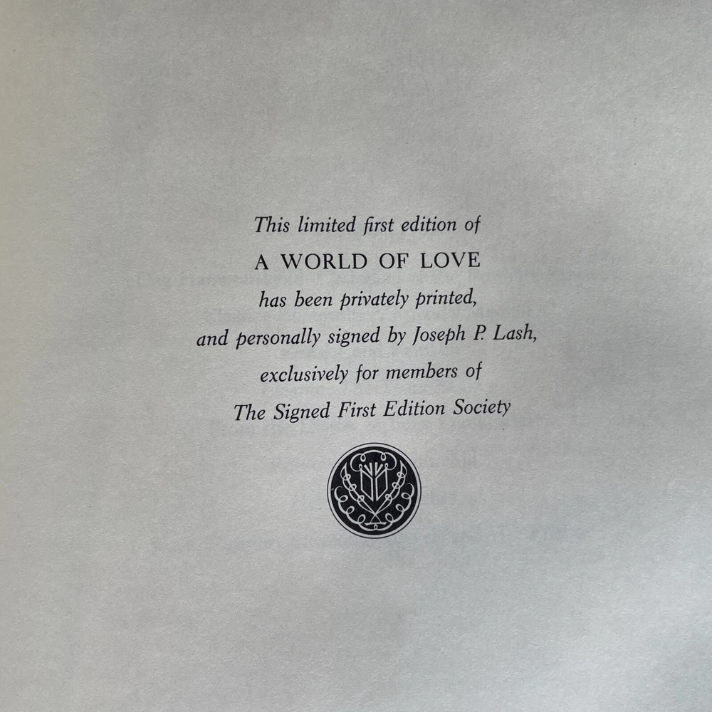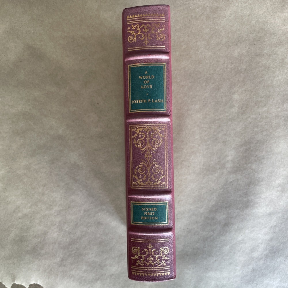 This exquisite edition of "A World Of Love" by Joseph P. Lash is a true gem for any book collector or enthusiast. The limited edition, 1st edition copy is signed by the author and features a beautiful leather binding. The book is printed in English and was originally published in 1984 by Franklin Library. The book is a must-have for fans of Eleanor Roosevelt and those interested in biography and autobiography topics. It is an original copy and comes from the Antiquarian & Collectible category. Don't miss your chance to own this rare piece of literary history.