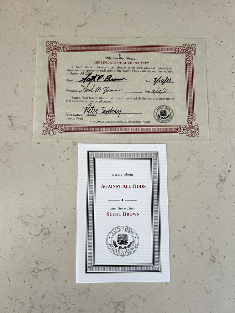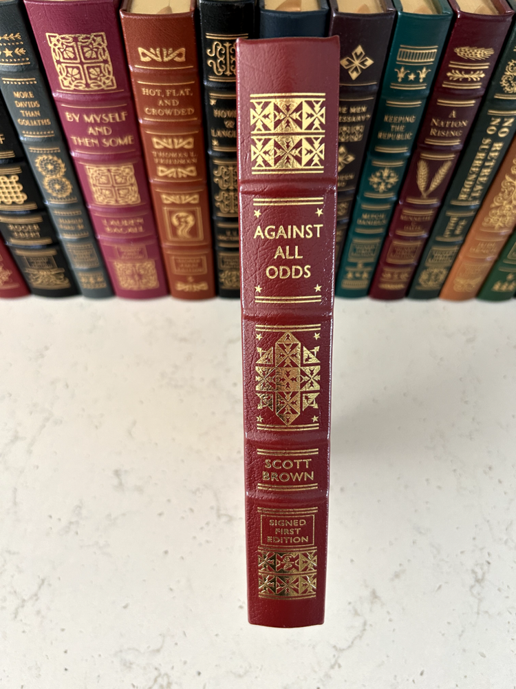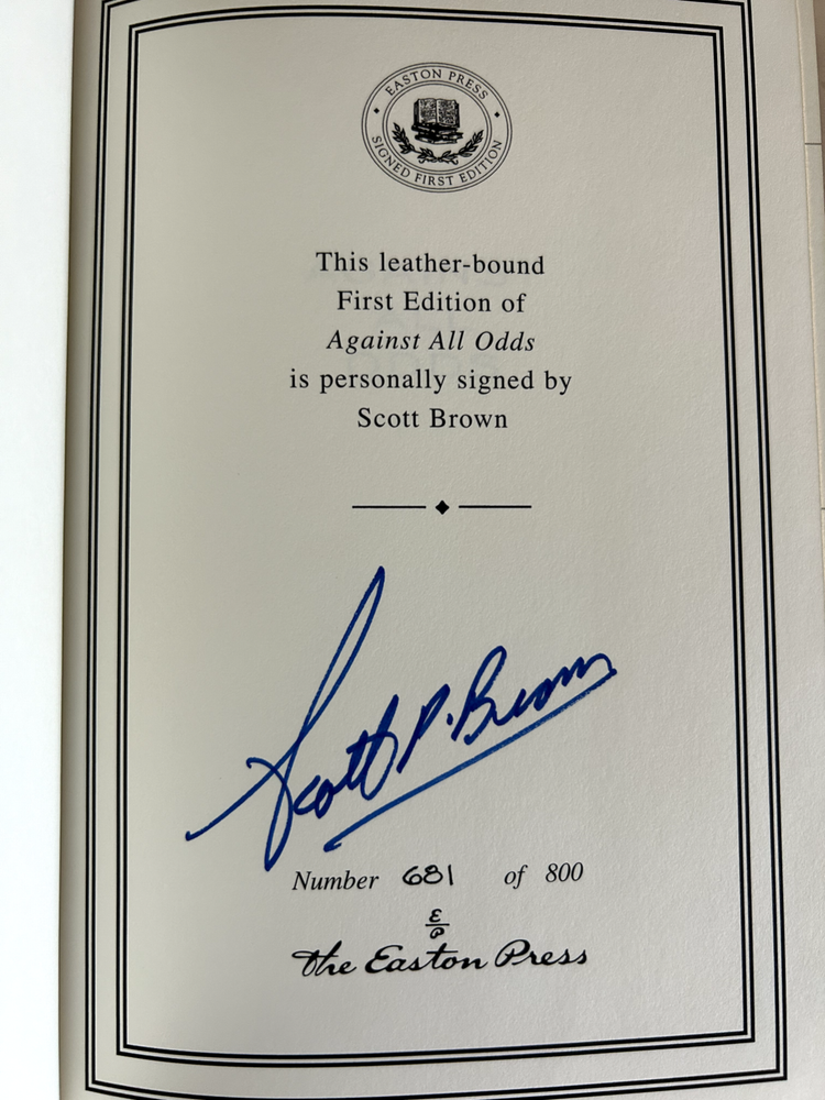 Against All Odds by Scott Brown Signed leather bound First Edition with COA, numbered 681 of 800 (2011) Like New, book has not been read, no bent pages Easton Press "Signed First Editions" Bound in fine genuine leather with 22K gold page edges Archival quality acid-free paper Domestic shipping only Returns accepted within 30 days