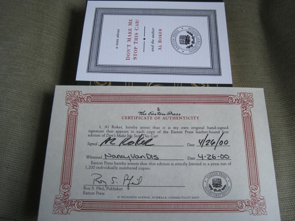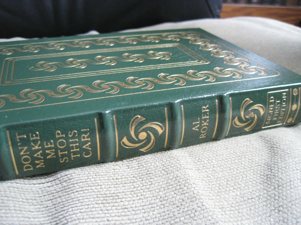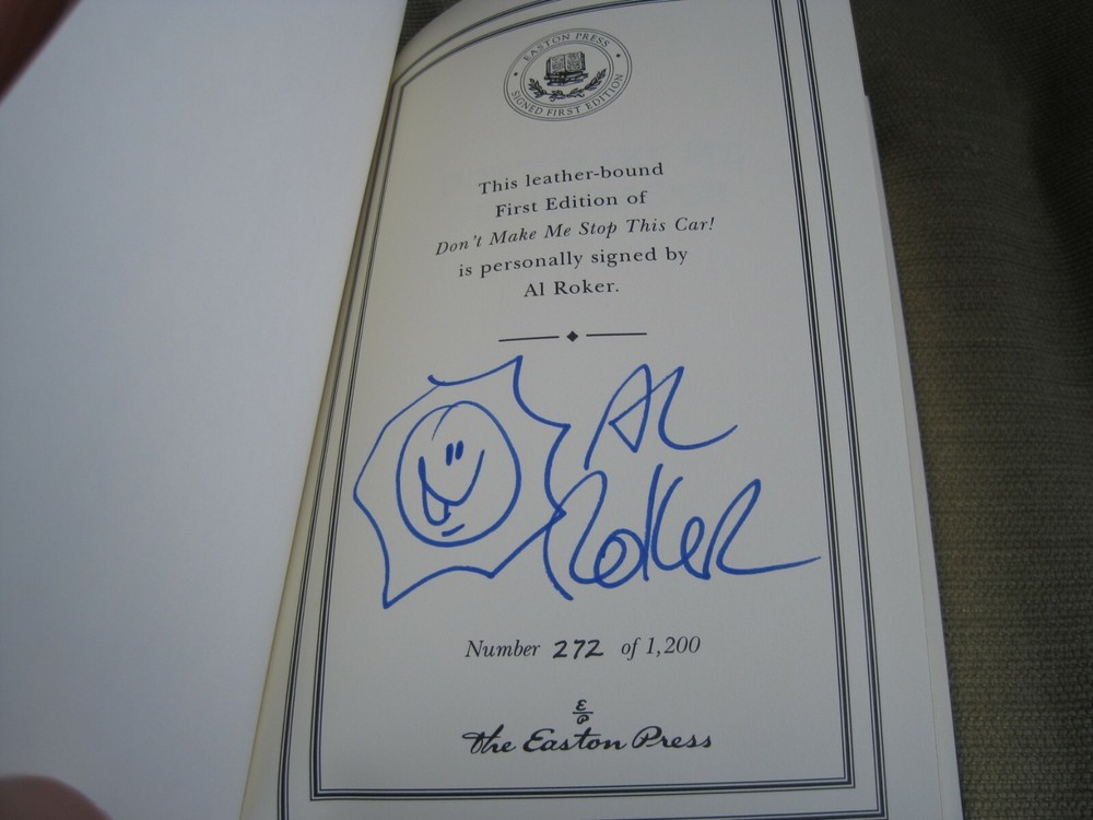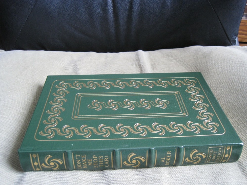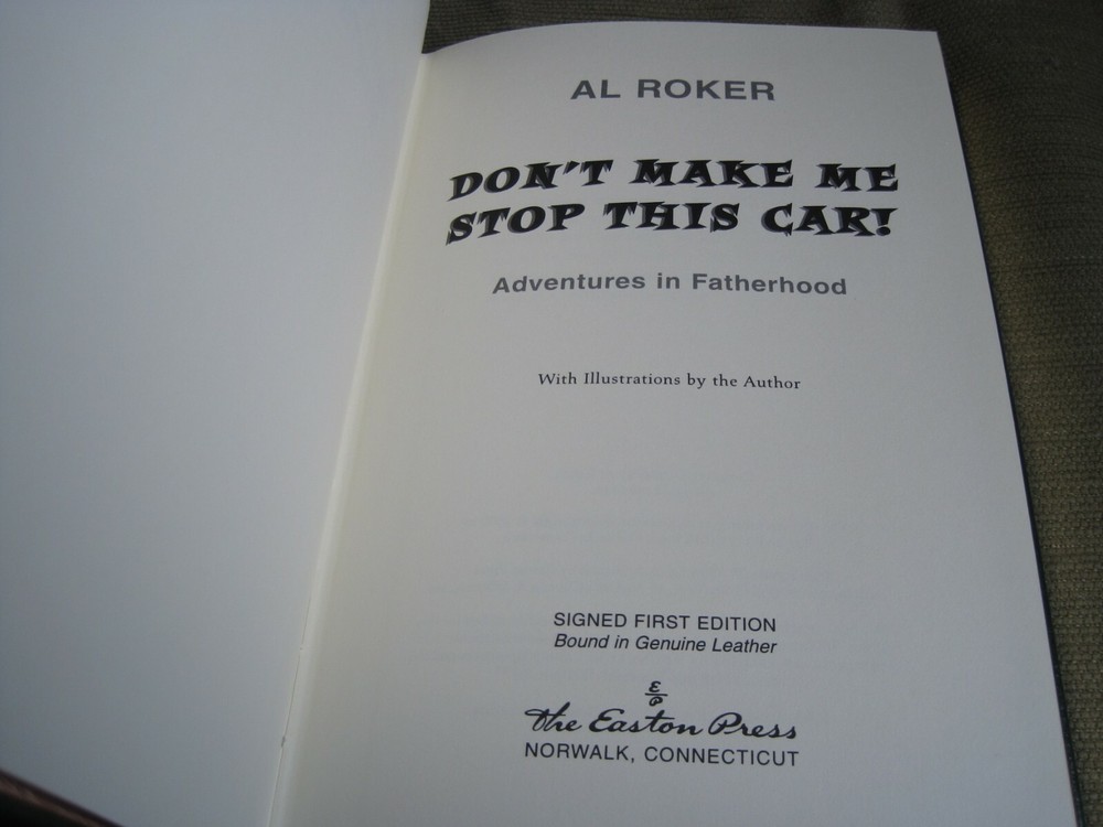 This is a leather bound signed numbered first edition of Al Roker's best seller - "Don't Make Me Stop This Car!" . The famed weatherman on NBC's Today show offers a collection of essays, some serious, some humorous, offering his thoughts on parenting and life in general that draw on his experiences as the father of two girls and his own childhood as the oldest of six children. The book is unread and in great condition, with just minor imperfections of the gold gild on the side of the pages (see images). Signed by the author on the limitation page, this is book number 272 one of only 1200 numbered copies ever printed. The signed and dated certificate of authenticity and the publisher's note card are also included. Easton Press books are the golden standard in the publishing industry, highly collectible and lasting generations. Easton Press Full Genuine Leather Dubbed Spine Accented Wit 22 kt. Real Gold Satin Ribbon Page Marker Distinctive Cover Design Gilded Page Edges To Protect Against Humidity High Quality Acid - Free paper Smyth-Sewn Pages Silk-Moire Endleaves I combine multiple items for savings on shipping charges. I ship worldwide. Please ask about international shipping charges and/or different shipping options. Thank you!