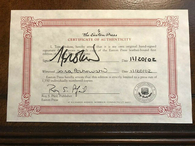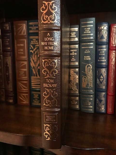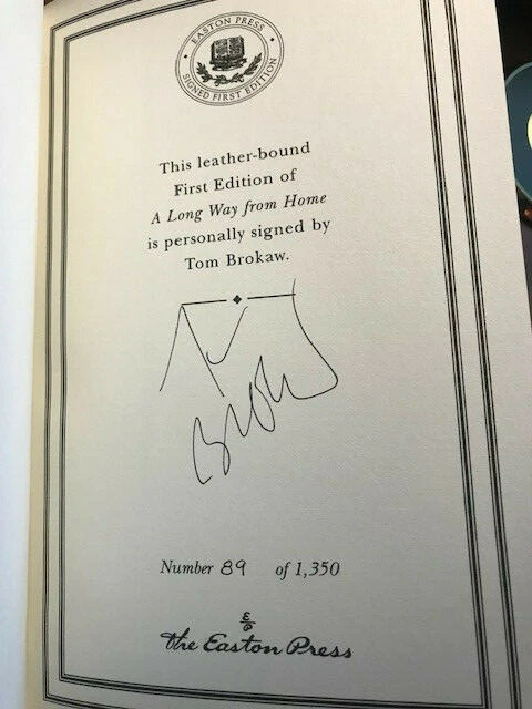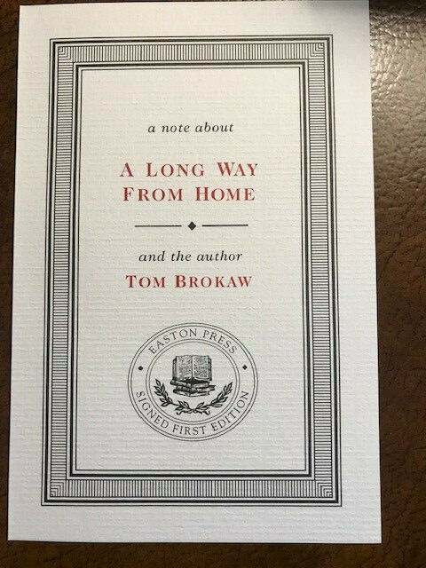 A LONG WAY FROM HOME: Growing Up in the American Heartland Number 89 of 1,350 Signed First Edition from Easton Press. High quality leather bound book. Smyth-sewn papers for strength and durability. Intricate cover design stamped in 22k gold . Distinctive raised Spine hubs. Silk moiré end paper . Edge of pages gilded . Permanent satin ribbon page marker . This book printed on acid neutral archival quality paper. Certificate of authenticity included. Beautiful addition to any library. Shipping is Free.